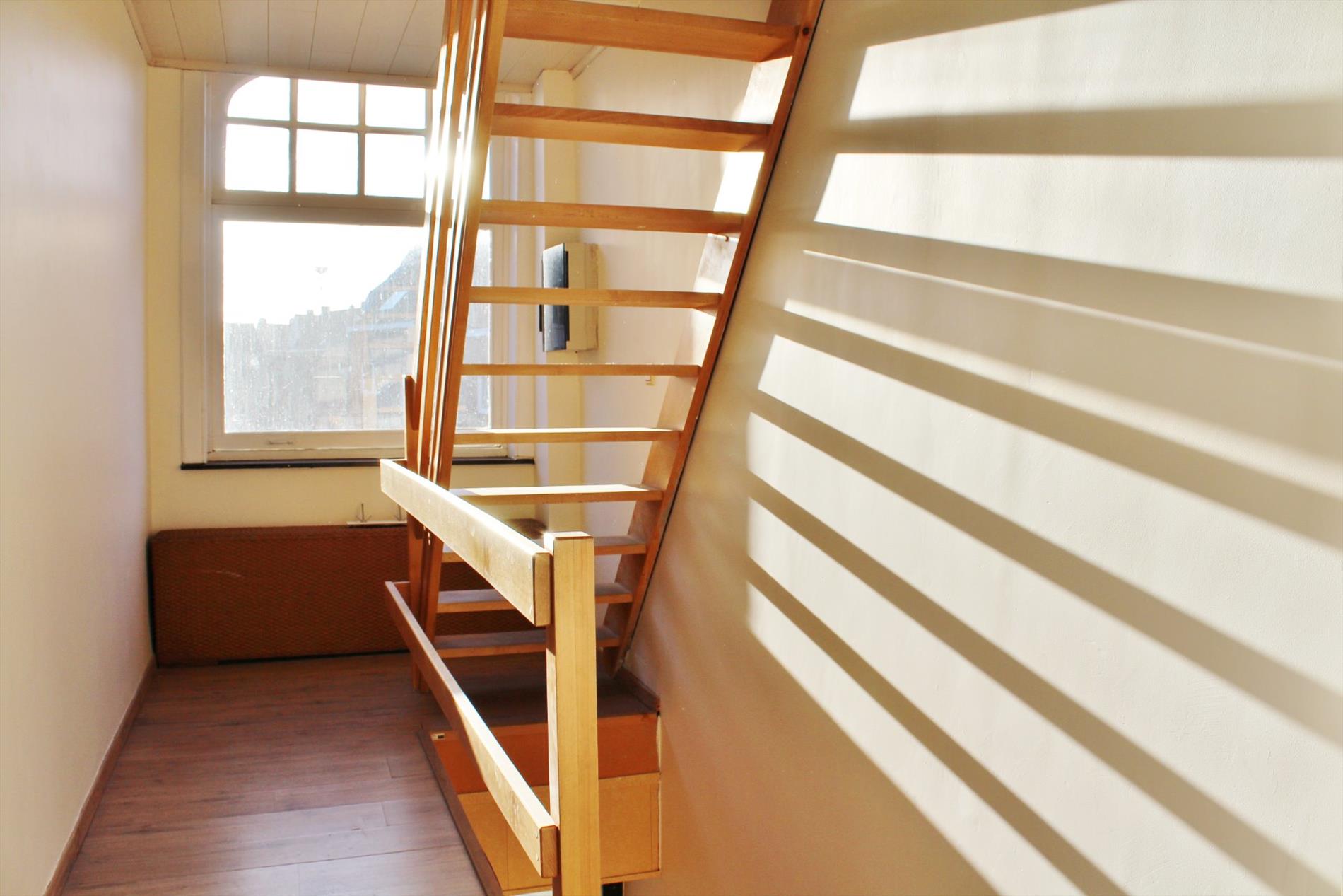 Dit appartement op 300 meter van de menenpoort omvat op de gelijkvloers een aparte inkom met trap naar boven op het eerste verdiep vinden we een gezellige leefruimte, ingerichte keuken en een hall met een trap naar de 2de verdieping waar we een zeer ruime slaapkamer en badkamer met douche, lavabomeubel en toilet terugvinden.