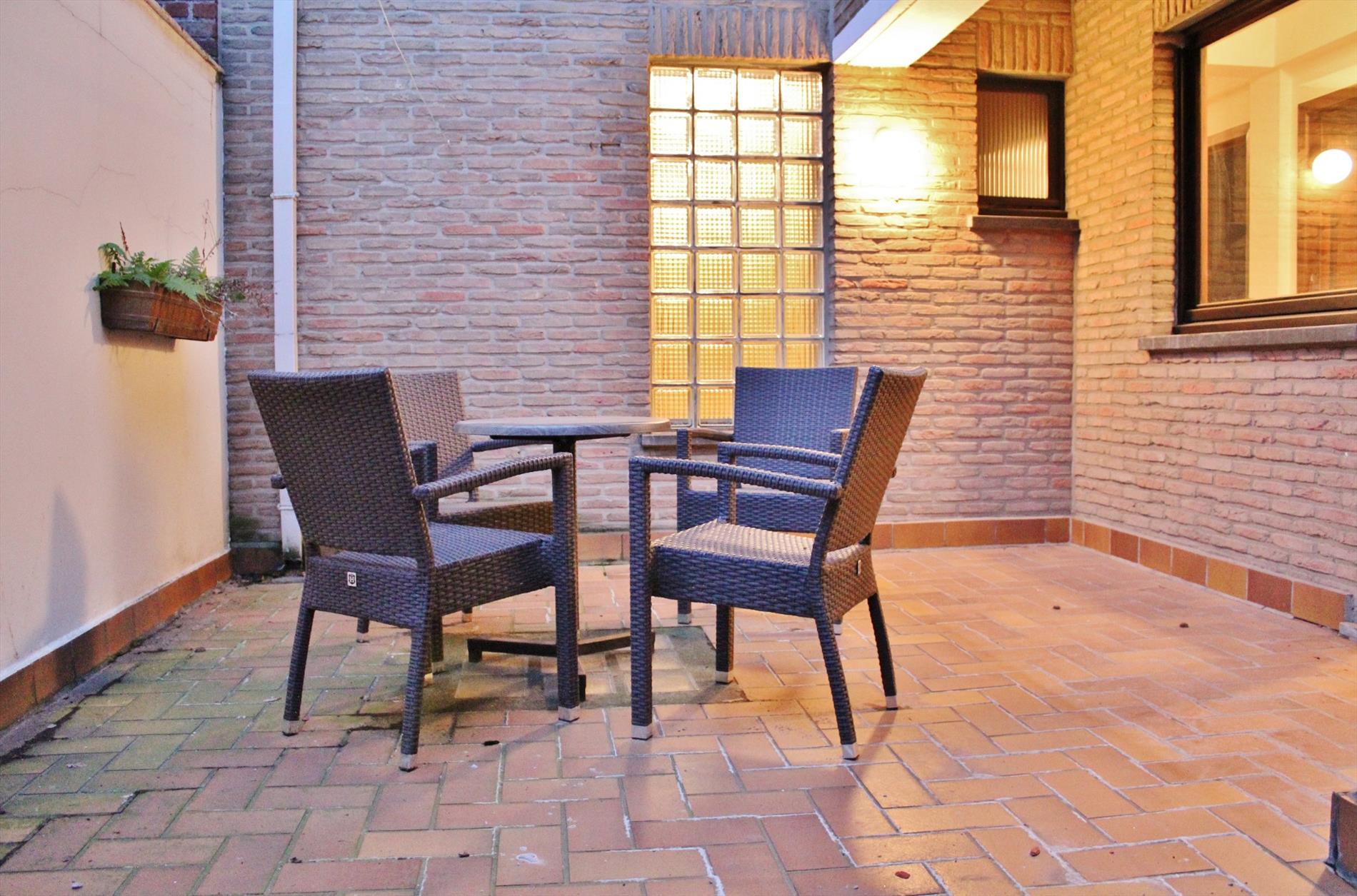 Dit appartement is zeer centraal gelegen in een kleinschalige residentie en omvat een inkom, ruime lichtrijke leefruimte, volledig ingerichte keuken, ( nieuwe toestellen ) bergplaats, 3 ruime slaapkamers, badkamer met bad, lavabomeubel, en toilet, ruim zuid gericht terras met buitenberging. Beneden is een gemeenschappelijke ruimte voor het plaatsen van fietsen en vuilnisbakken.