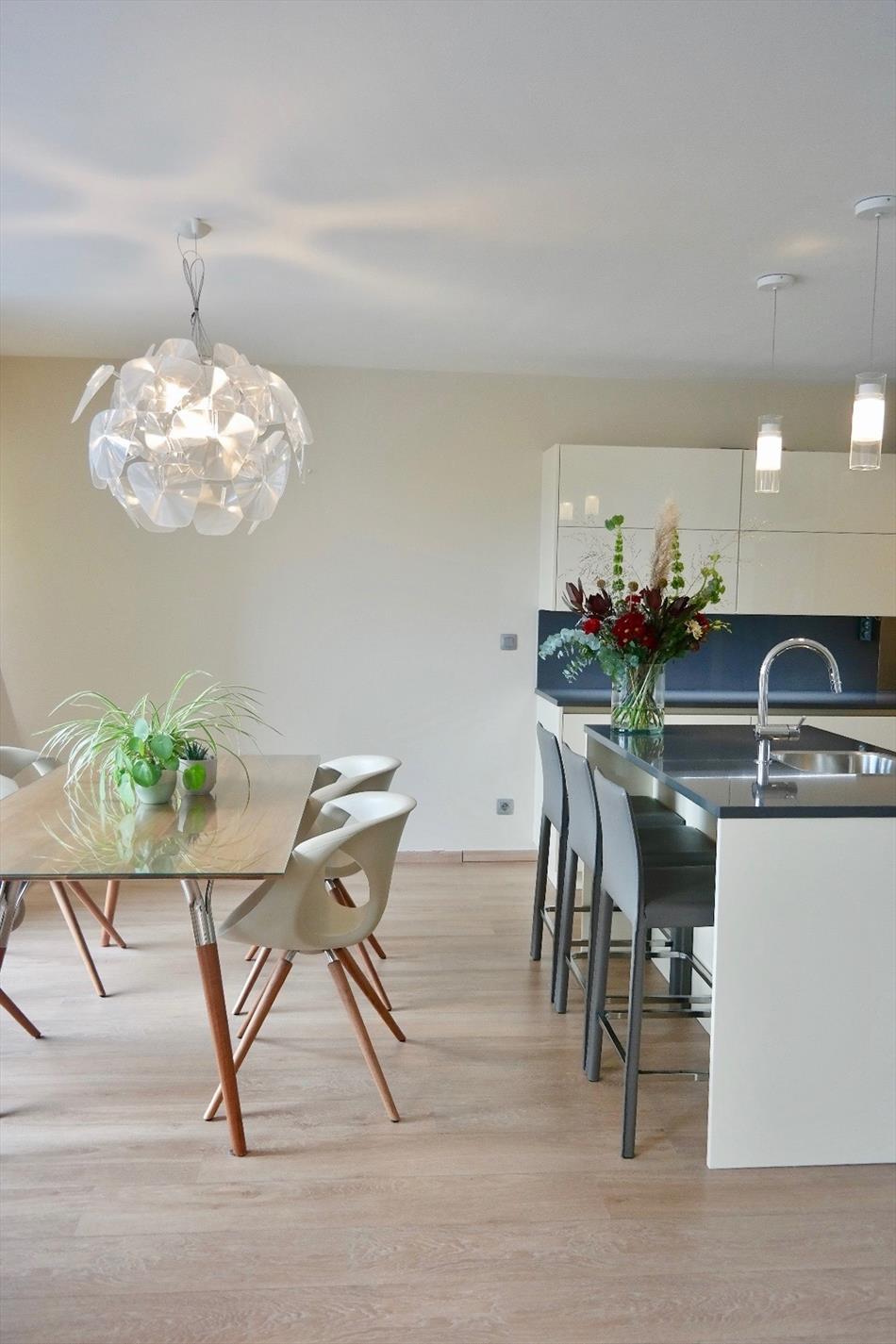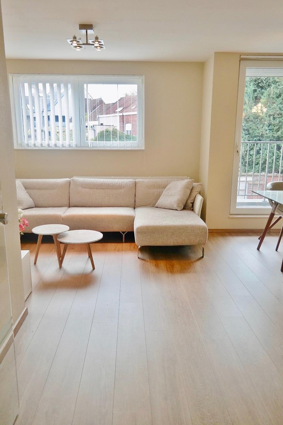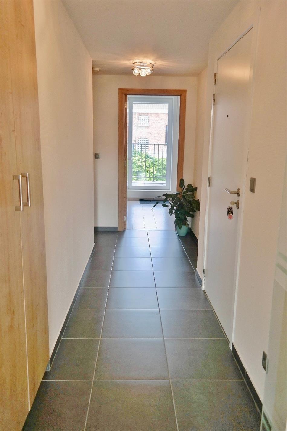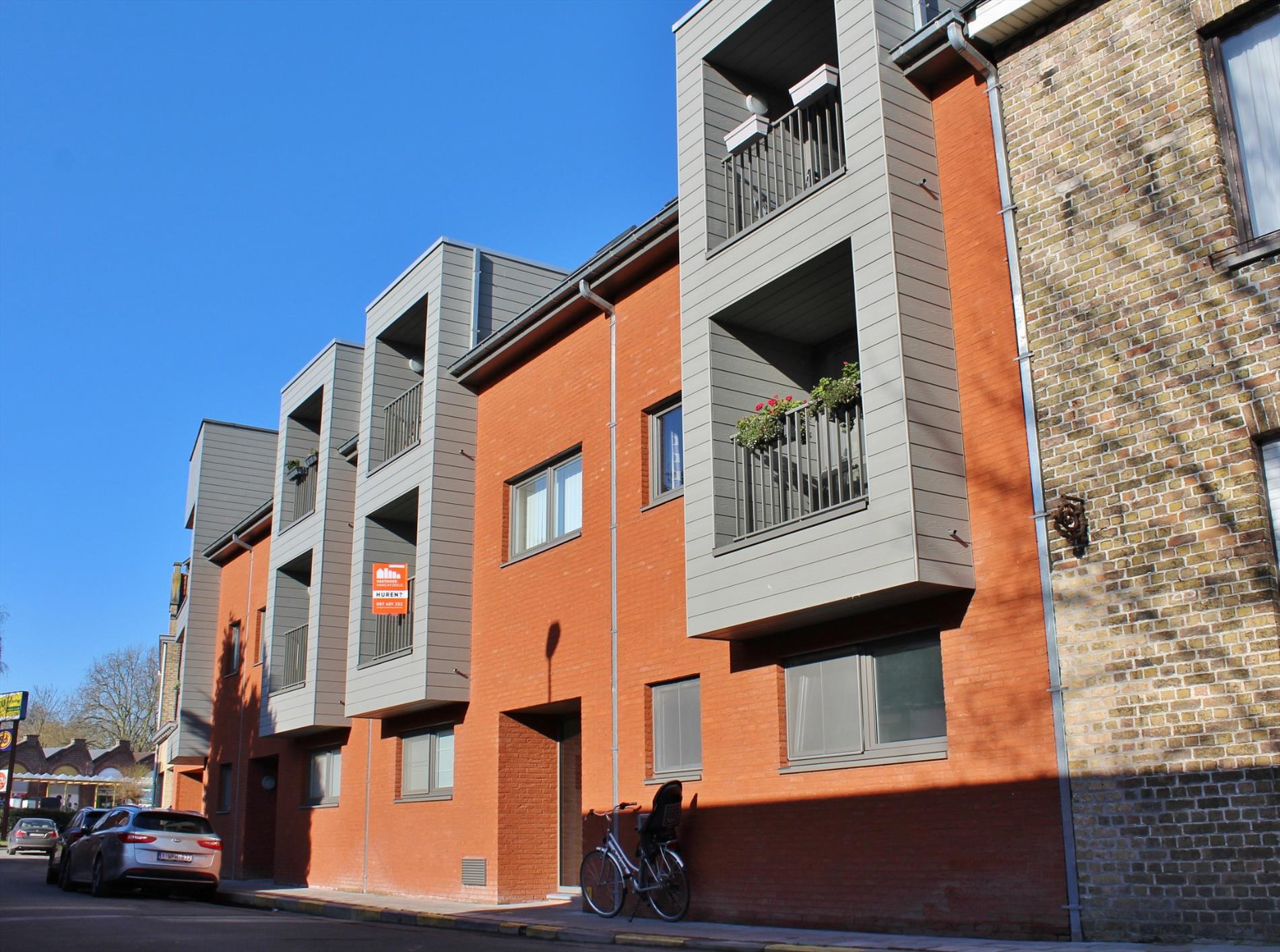 Dit appartement is gelegen op de eerste verdieping van deze recente (bj:2014) residentie en omvat een inkom met ingemaakte kast, apart toilet, ruime lichtrijke leefruimte met eet- en zitplaats en open volledig ingerichte keuken, berging met aansluiting voor wasmachine, 2 ruime slaapkamers en een badkamer met dubbel lavabomeubel en ligbad voorzien van glazen douchewand en regendouche. Er zijn tevens twee terrassen waarvan 1 groot langs achter.