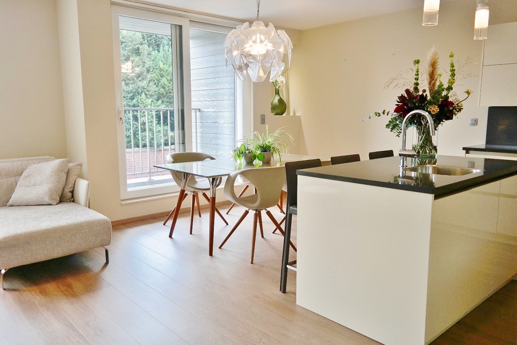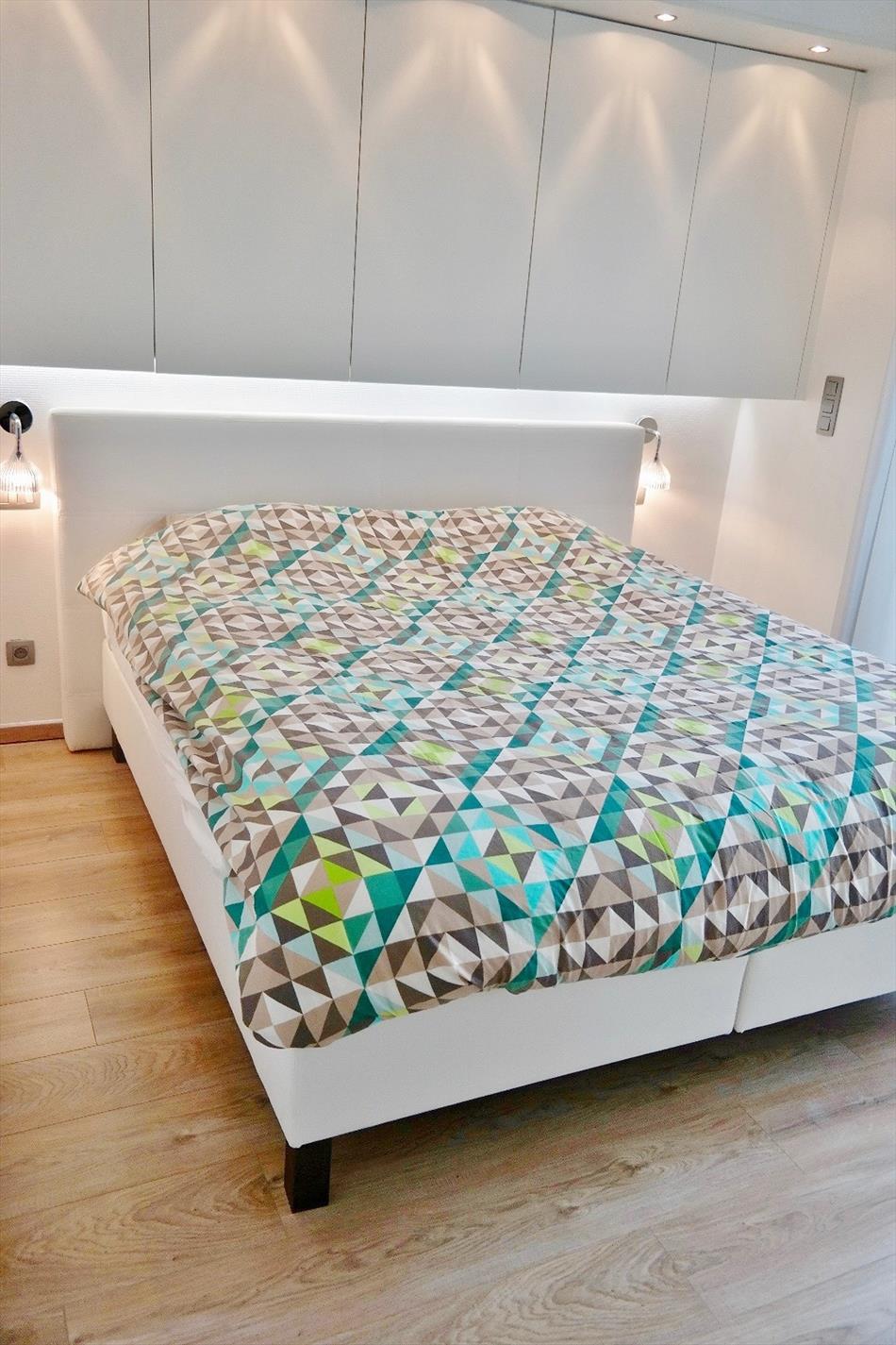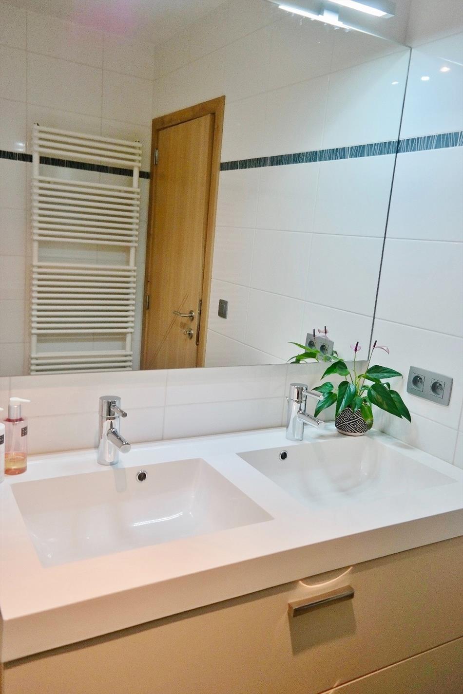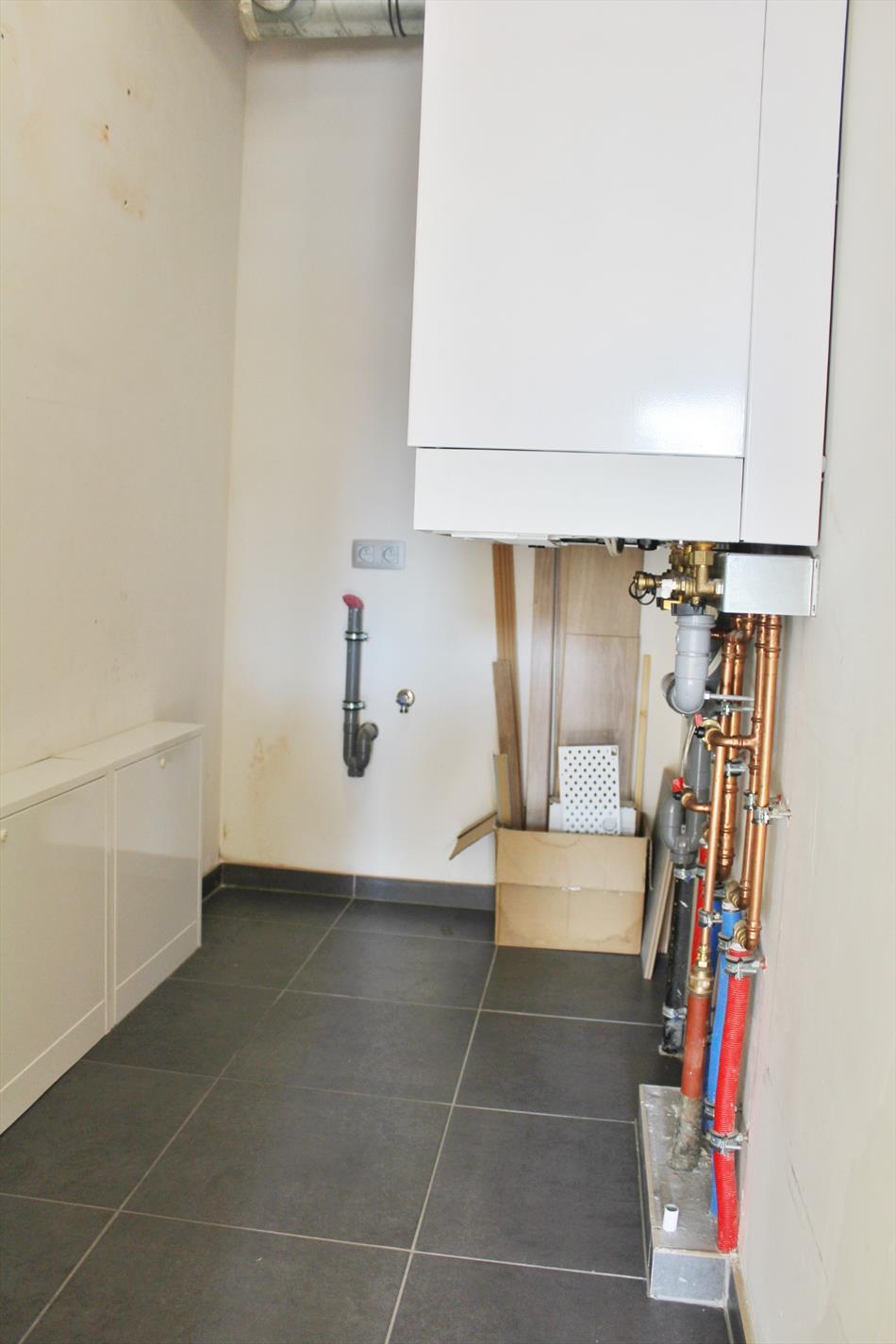 Dit appartement is gelegen op de eerste verdieping van deze recente (bj:2014) residentie en omvat een inkom met ingemaakte kast, apart toilet, ruime lichtrijke leefruimte met eet- en zitplaats en open volledig ingerichte keuken, berging met aansluiting voor wasmachine, 2 ruime slaapkamers en een badkamer met dubbel lavabomeubel en ligbad voorzien van glazen douchewand en regendouche. Er zijn tevens twee terrassen waarvan 1 groot langs achter.