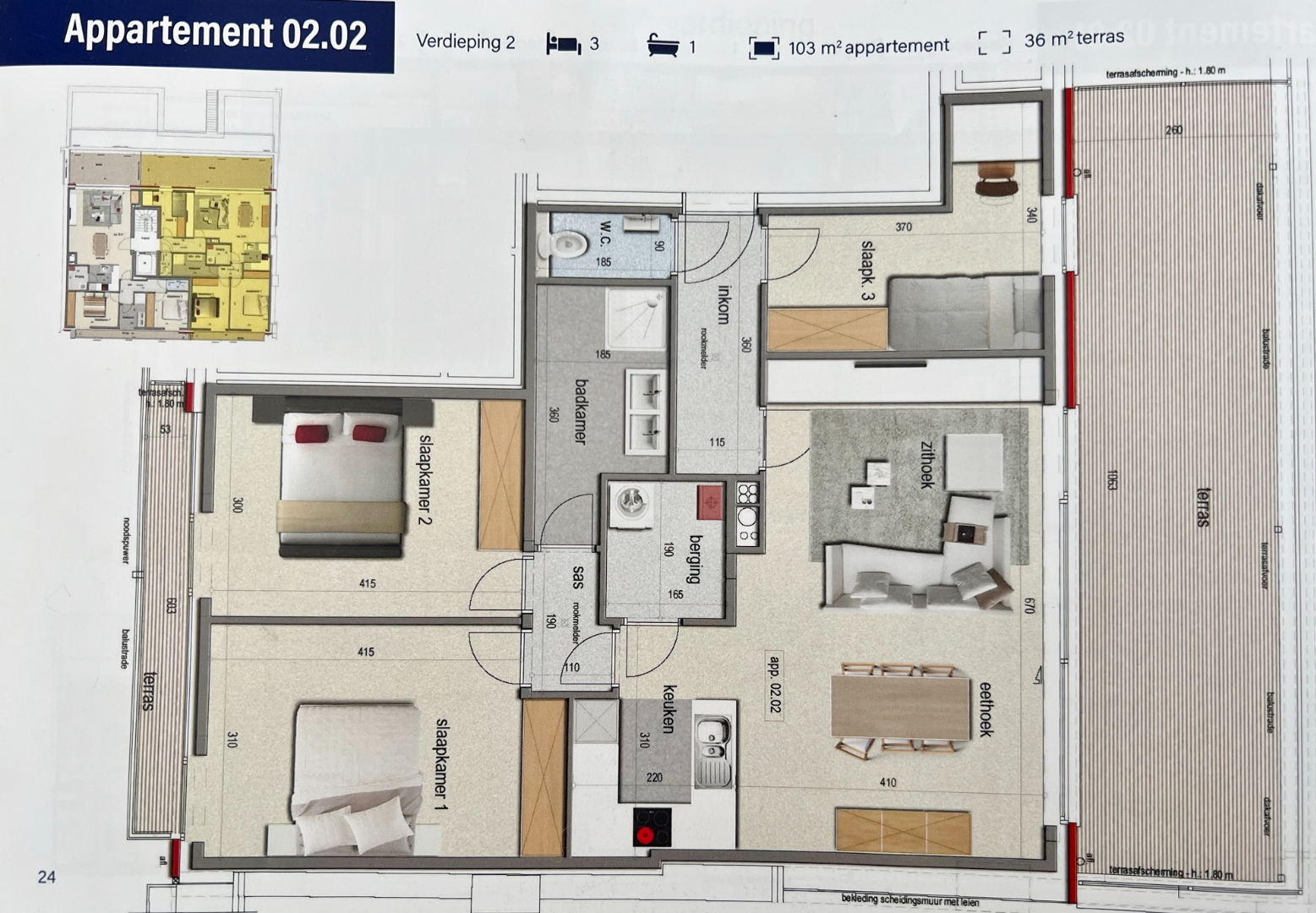 U komt het appartement binnen via een inkomhal met apart toilet. Daarna komt u via de glazen deur terecht in de ruime lichtrijke leefruimte met volledig geïnstalleerde open keuken en toegang tot het zeer ruim zonnig terras. Aanpalend aan de keuken is een ruime berging, hier bevindt zich de aansluiting voor het plaatsen van een wasmachine, etc.. Verder kan u ook 3 slaapkamers terugvinden, de slaapkamers hebben toegang tot een tweede terras er is tevens een badkamer met lavabomeubel, toilet en inloopdouche.