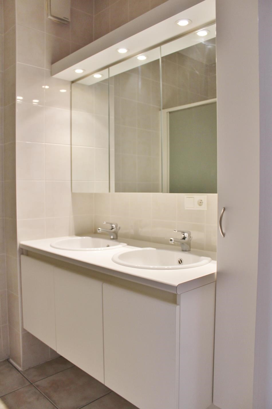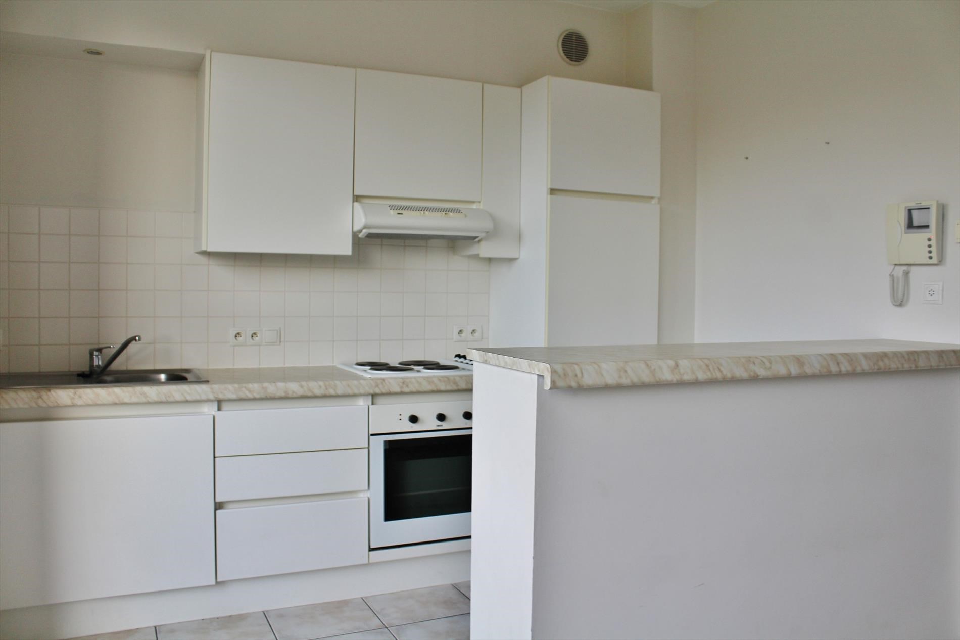 Dit appartement is gelegen op de 3de verdieping van deze stijlvolle residentie en omvat een inkom, apart toilet, ruime lichtrijke leefruimte met open volledig ingerichte keuken, bergplaats, 2 slaapkamers, badkamer met douche, lavabomeubel en aansluiting voor wasmachine.