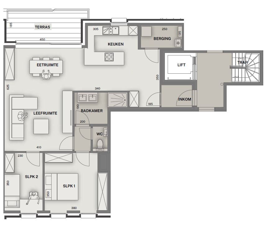 het appartement omvat een inkom, ruime lichtrijke leefruimte met volledig ingerichte open keuken en aansluitende bergruimte, 2 slaapkamers, apart toilet en een badkamer met inloopdouche en dubbel lavabomeubel. Aansluitend aan de leefruimte is een zonnig terras (west-gericht)