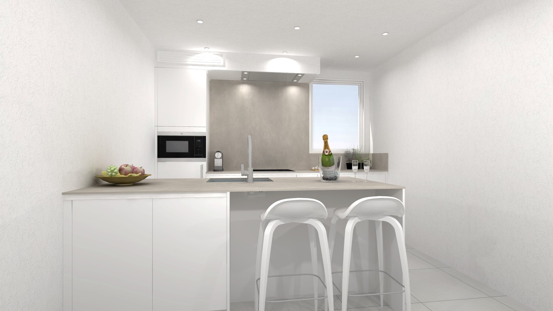 het appartement omvat een inkom, apart toilet, ruime lichtrijke leefruimte met volledig ingerichte open keuken en aansluitende bergruimte, 2 slaapkamers, en een badkamer met inloopdouche en dubbel lavabomeubel. Aansluitend aan de leefruimte is een zonnig terras. (zuidwest-gericht)