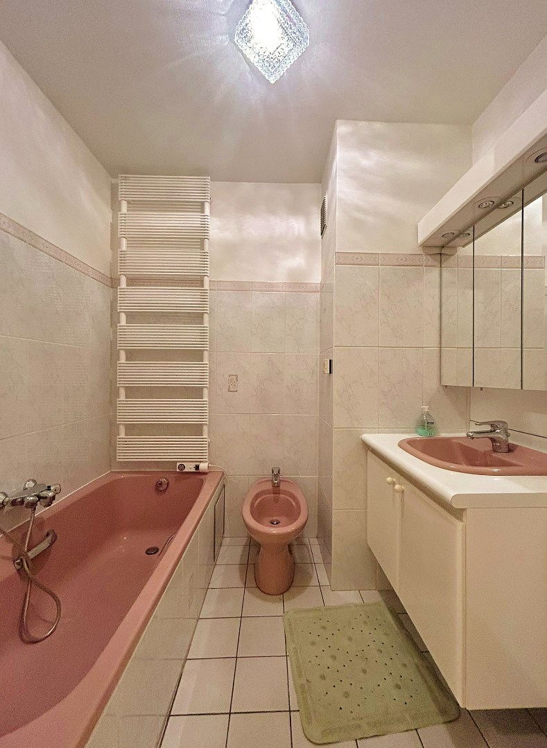 De ene badkamer beschikt over een lavabomeubel en bad, de andere enkel over een douche.