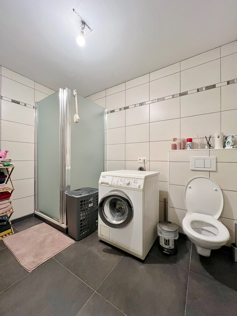 Via een vaste trap is er toegang tot de badkamer met lavabomeubel, douche, toilet en aansluiting voor de wasmachine, alsook tot 2 slaapkamers.