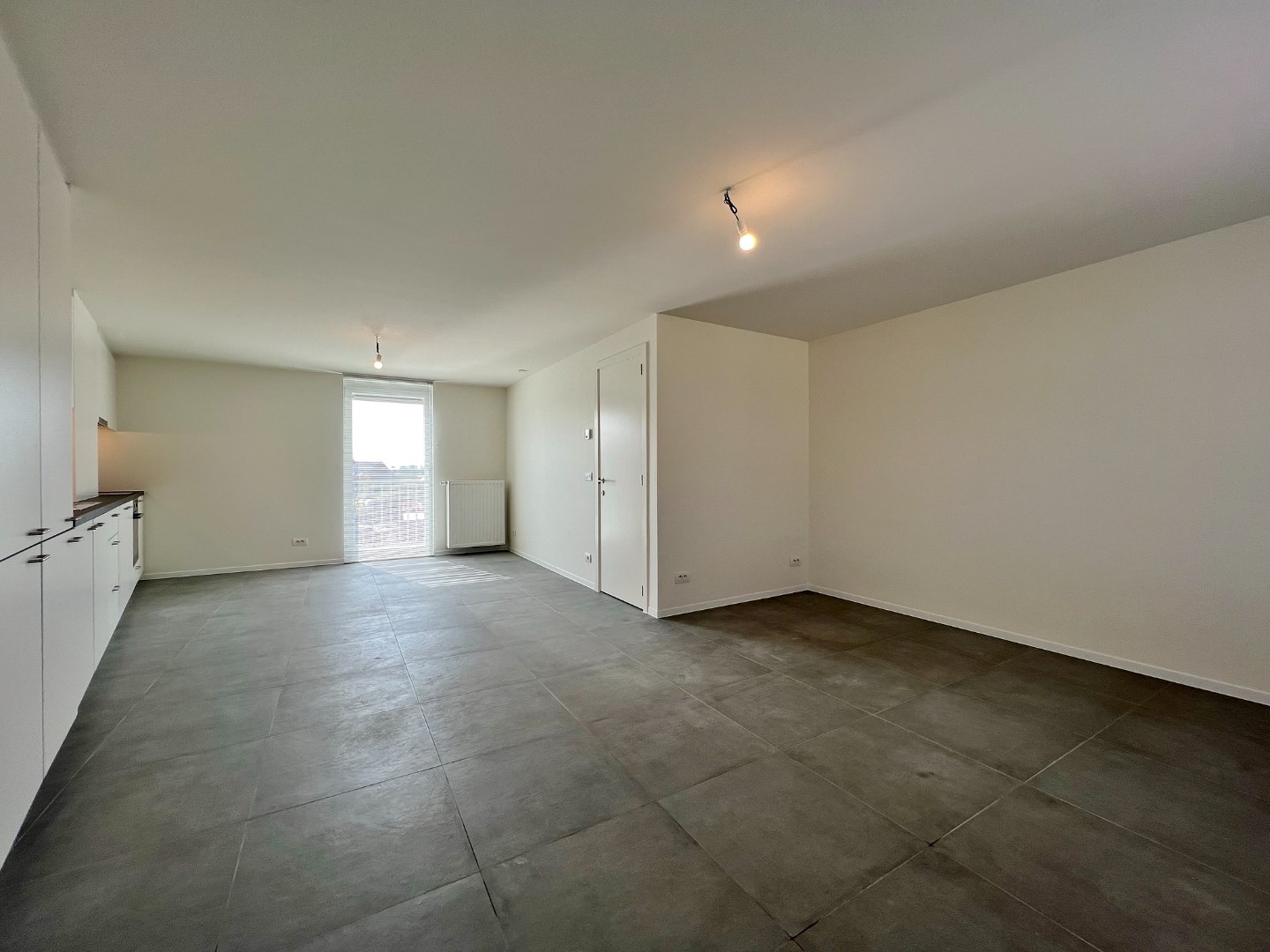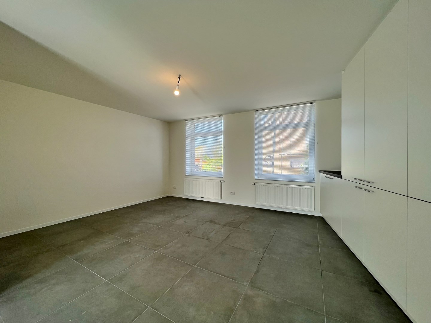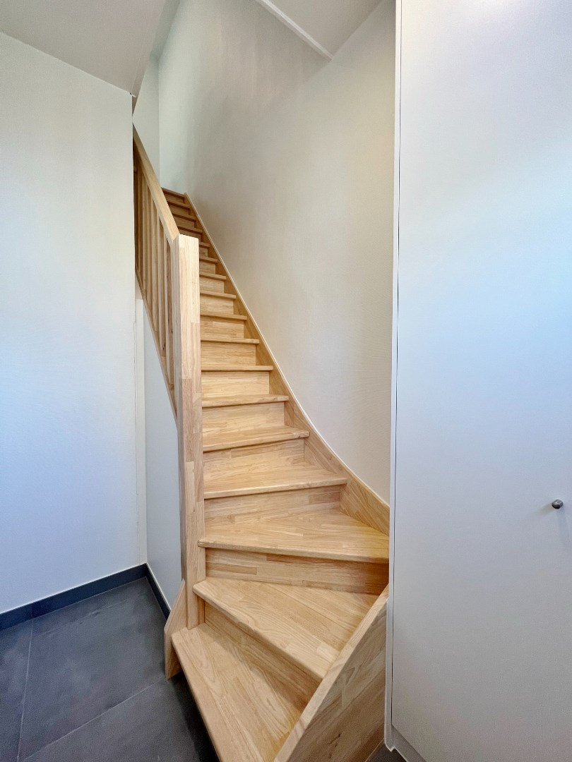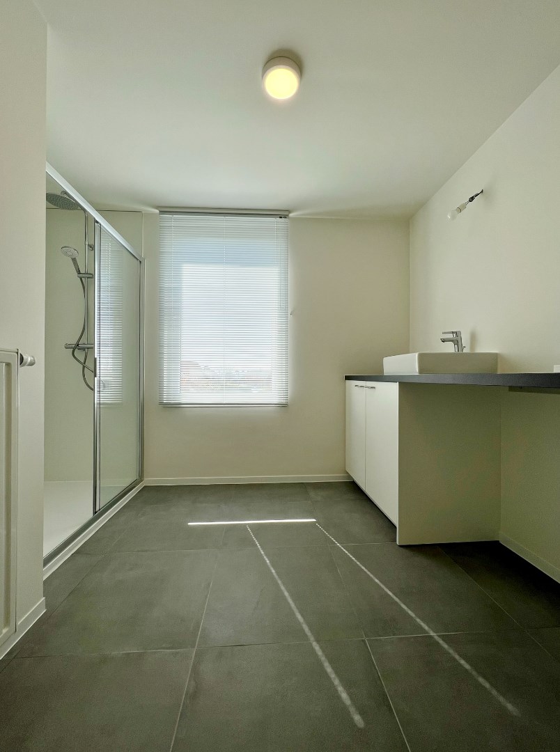 - op de eerste verdieping: een ruime lichtrijke leefruimte met open volledig ingerichte keuken met aansluitend zonnig terras, apart toilet, badkamer met lavabomeubel, douche en aansluiting voor wasmachine en droogkast.