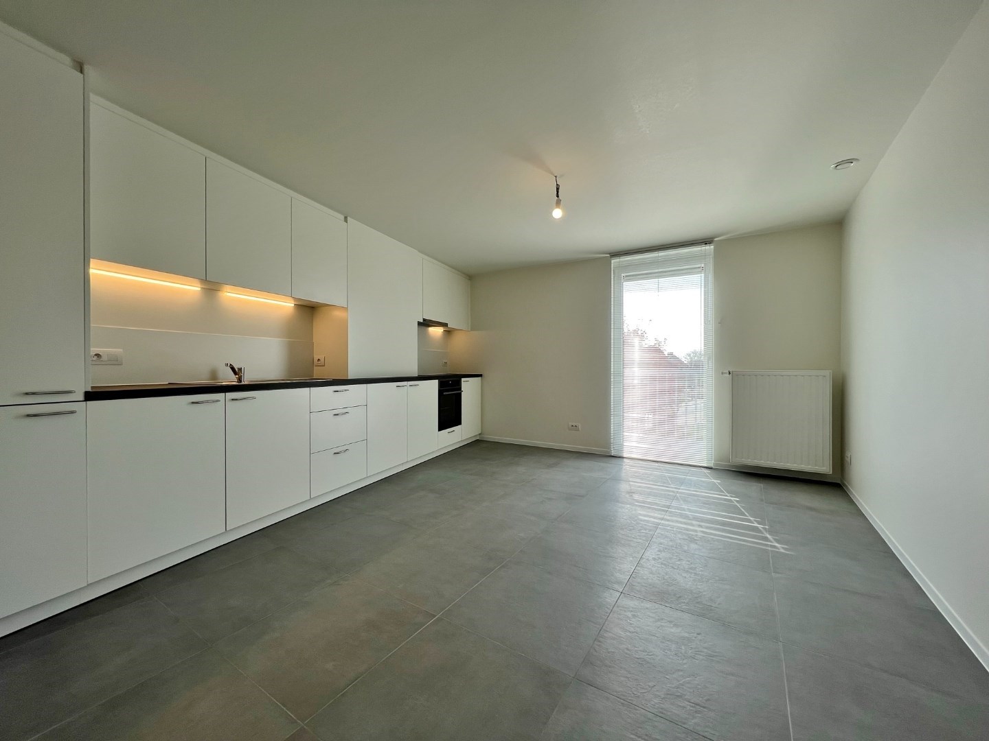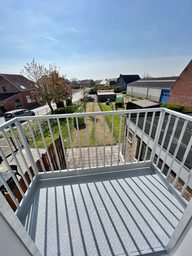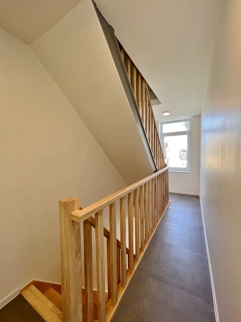 - op de eerste verdieping: een ruime lichtrijke leefruimte met open volledig ingerichte keuken met aansluitend zonnig terras, apart toilet, badkamer met lavabomeubel, douche en aansluiting voor wasmachine en droogkast.