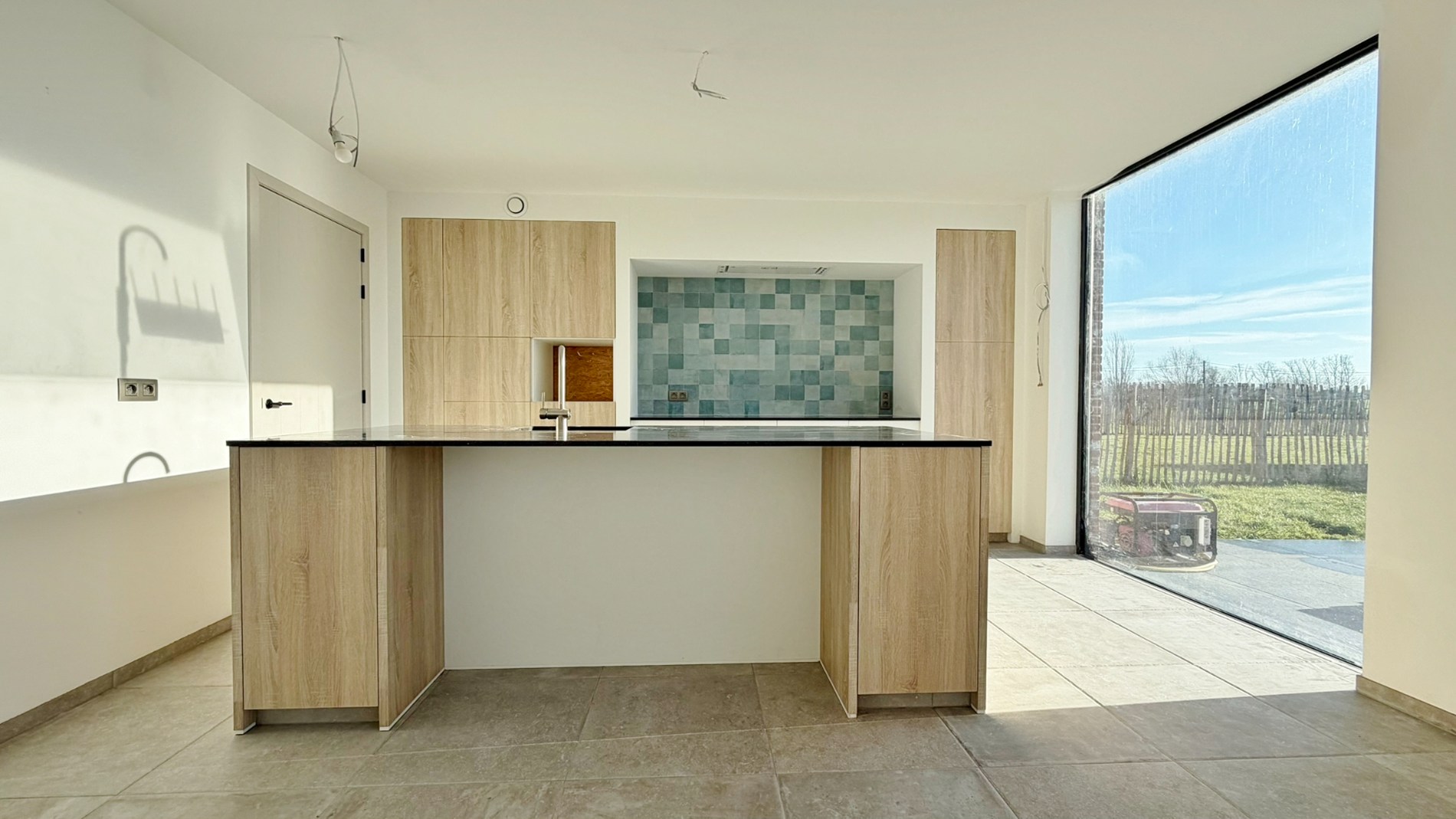Inkomhal, apart toilet, ruime en lichtrijke leefruimte met open, volledig ingerichte keuken voorzien van inductiekookplaat, dampkap, koelkast, oven en vaatwasmachine.