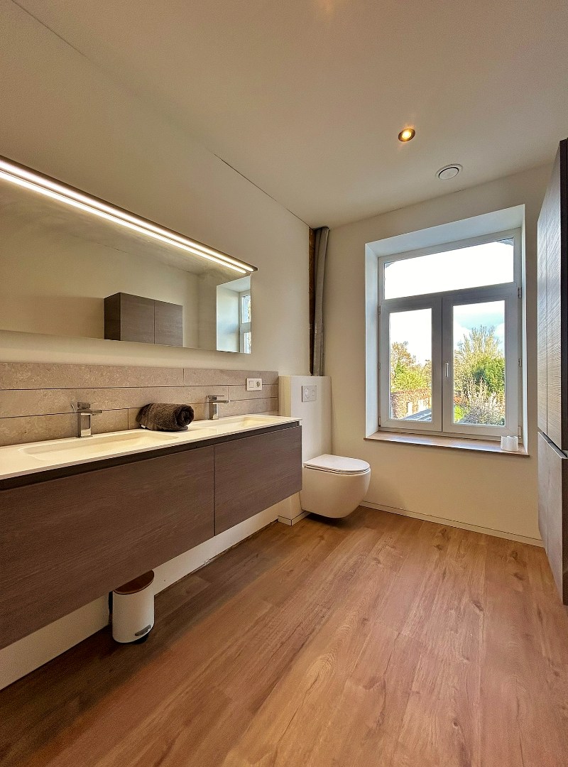 Op het eerste verdiep bevinden zich twee slaapkamers en een badkamer met dubbel lavabomeubel, inloopdouche en toilet.