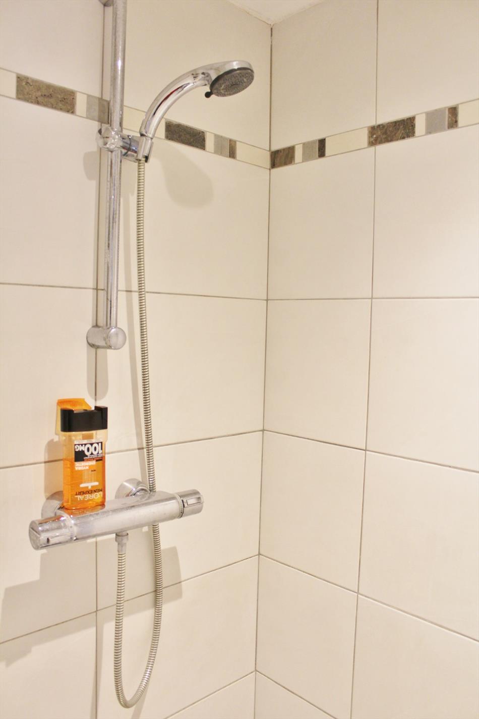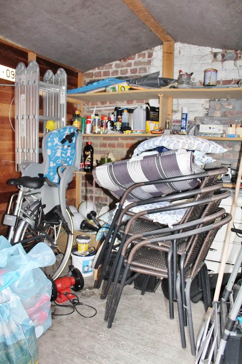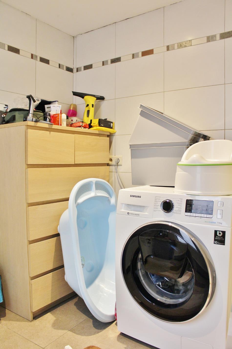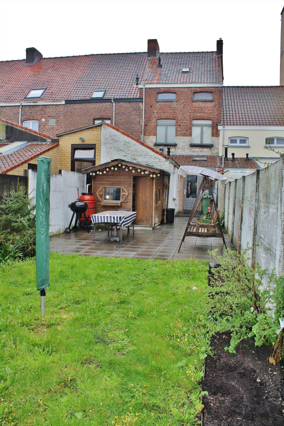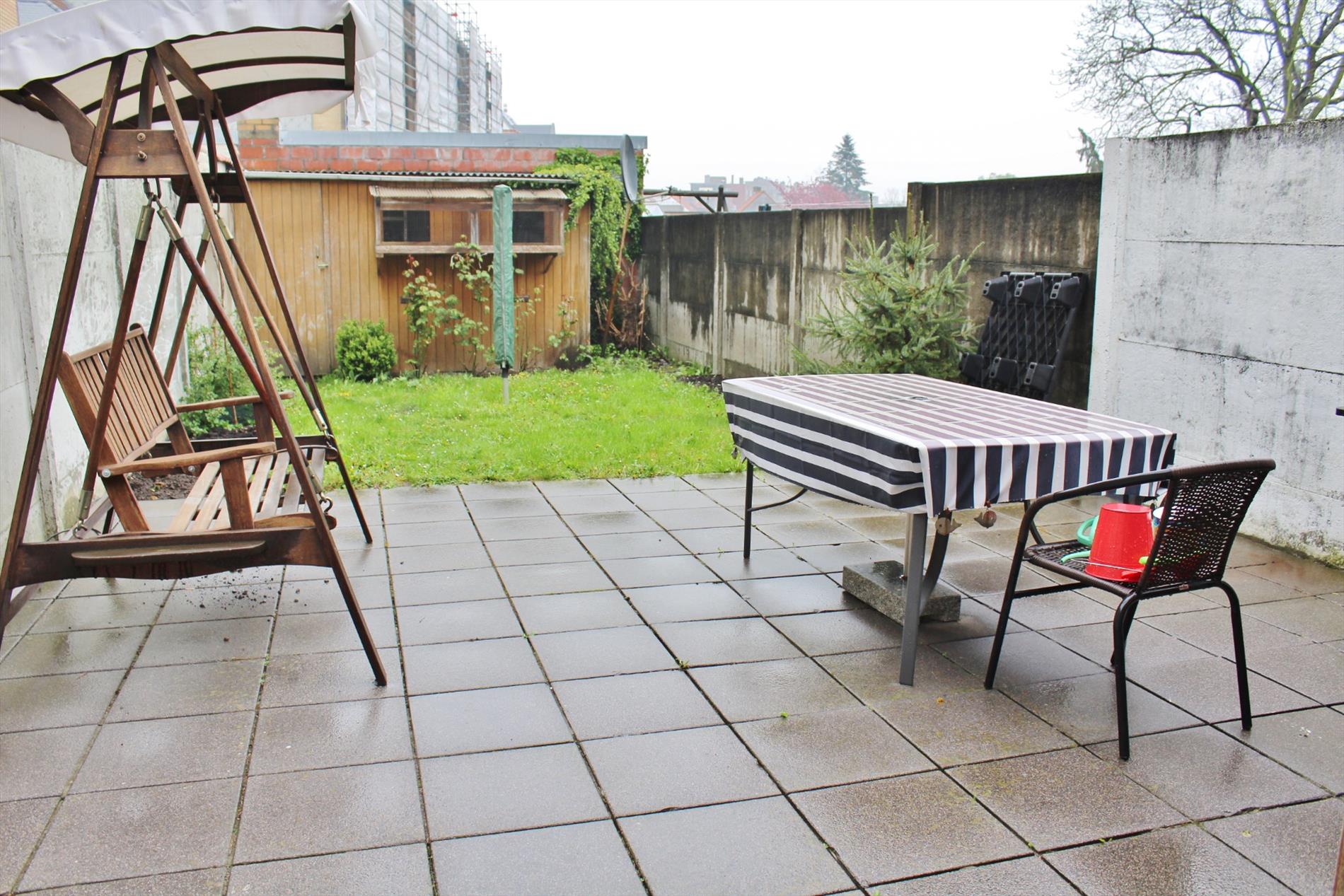 Buiten is een volledig afgesloten zonnige tuin met buitenberging.