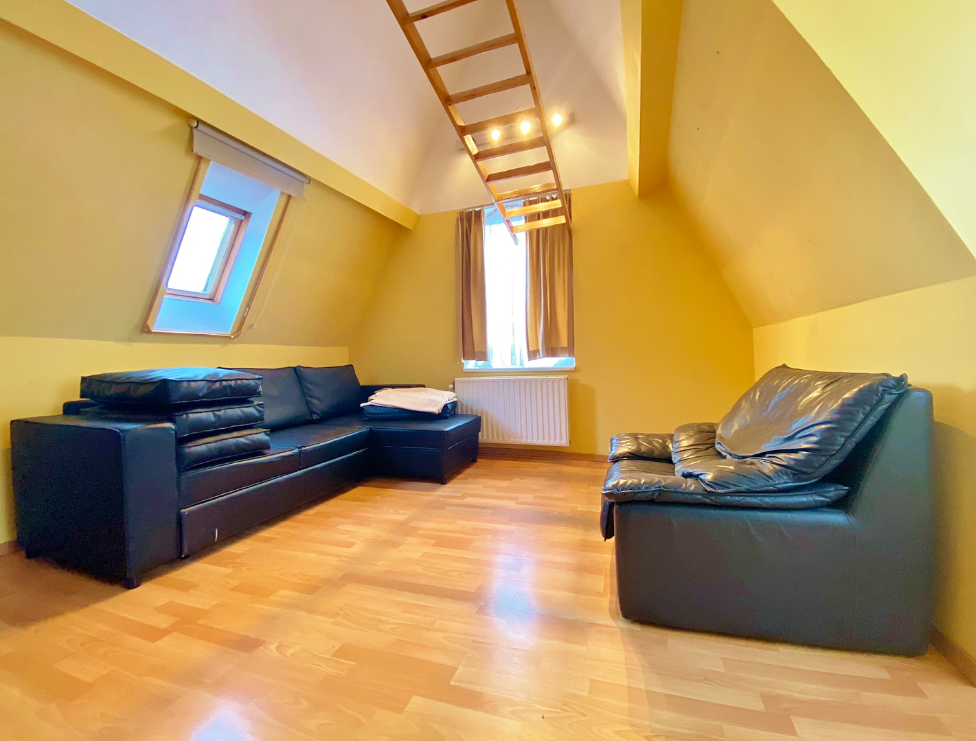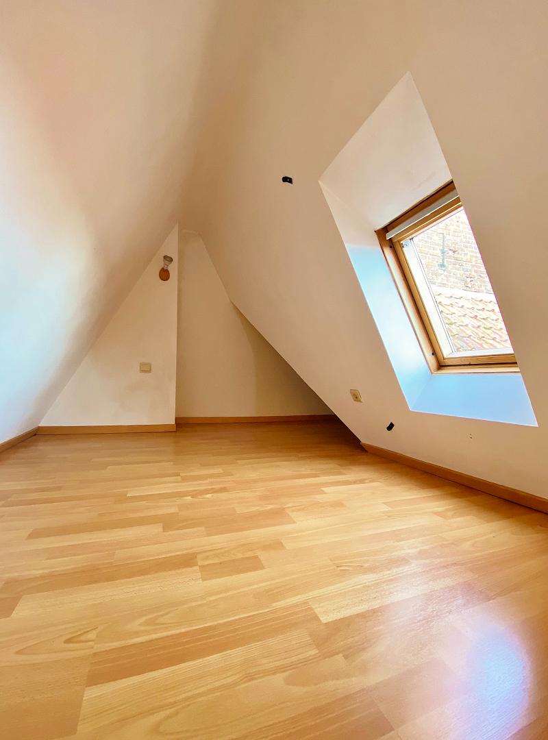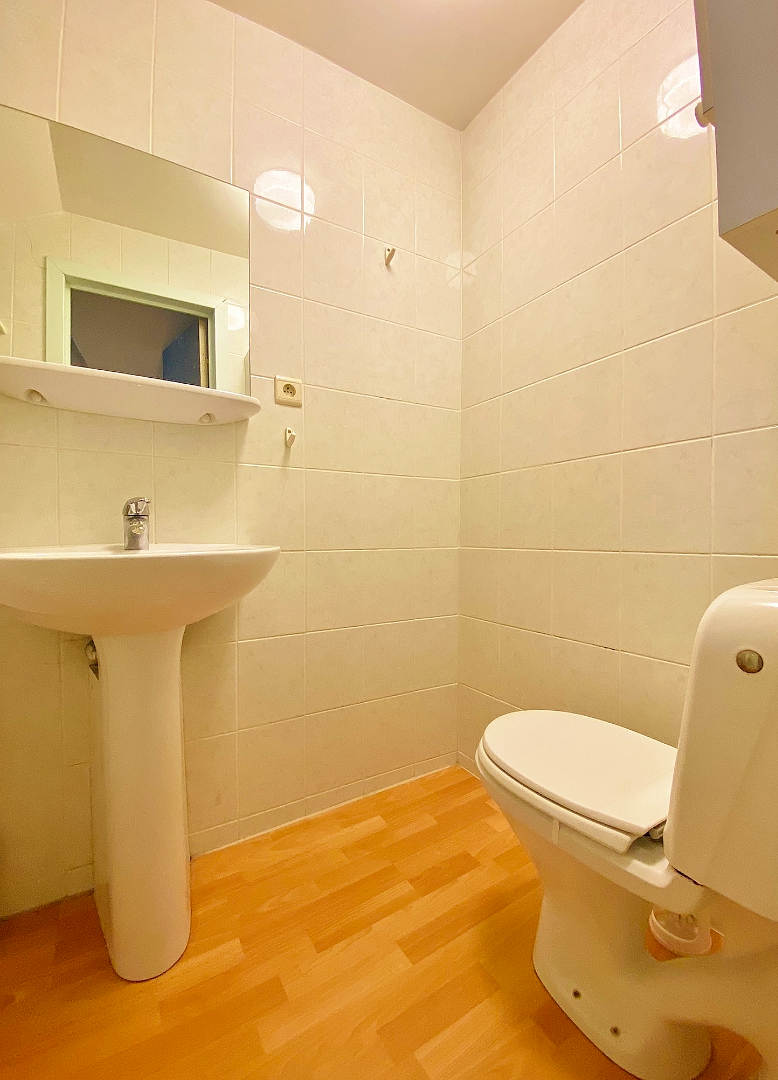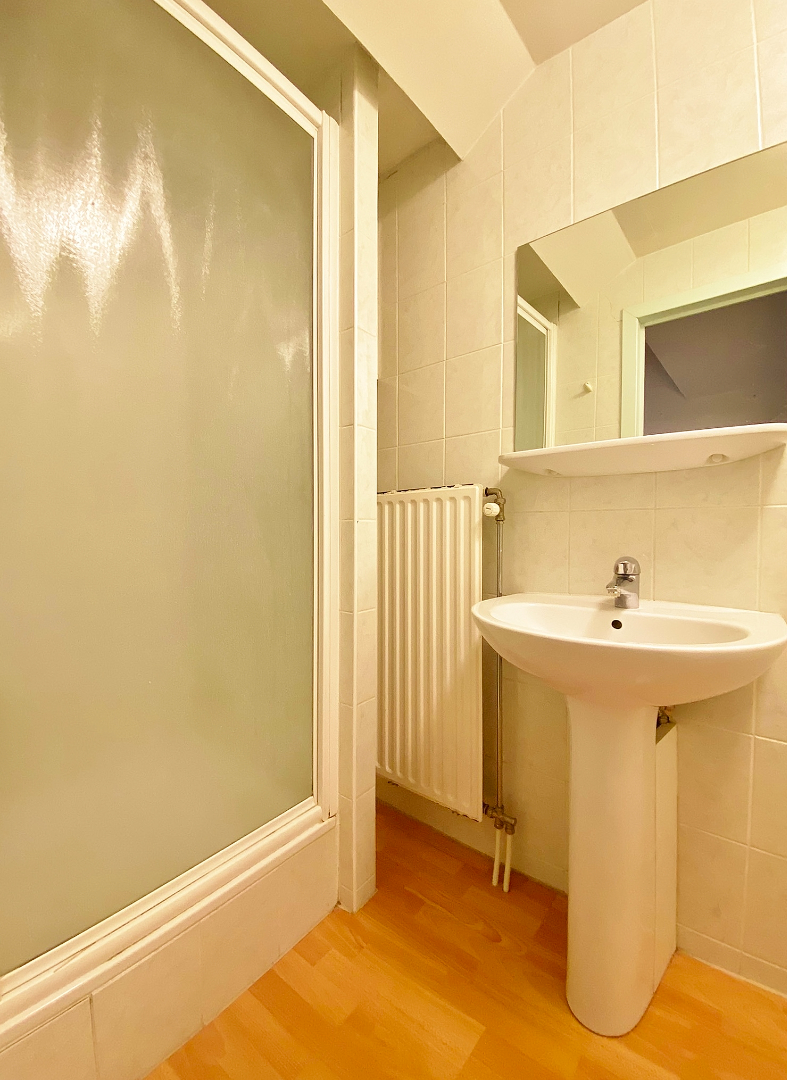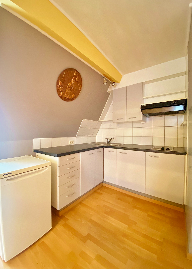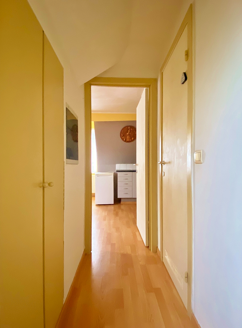 Deze studio bevindt zich op de tweede verdieping van een kleinschalige residentie en omvat een inkomhal met ingemaakte kast, leefruimte/slaapkamer met open keuken, badkamer met lavabomeubel, douche en toilet en een mezzanine (bergplaats).