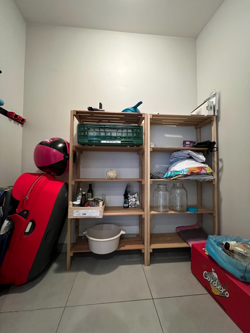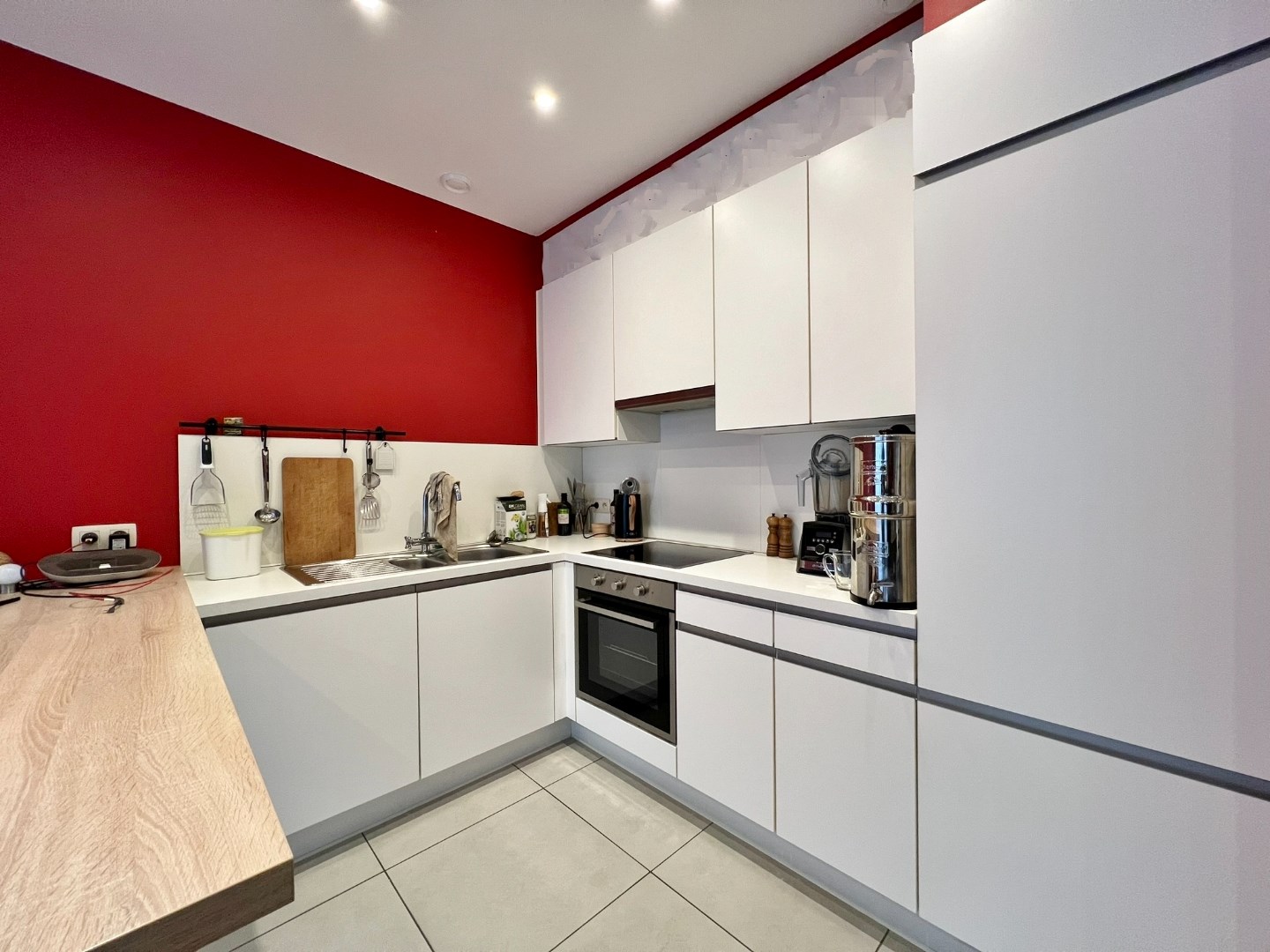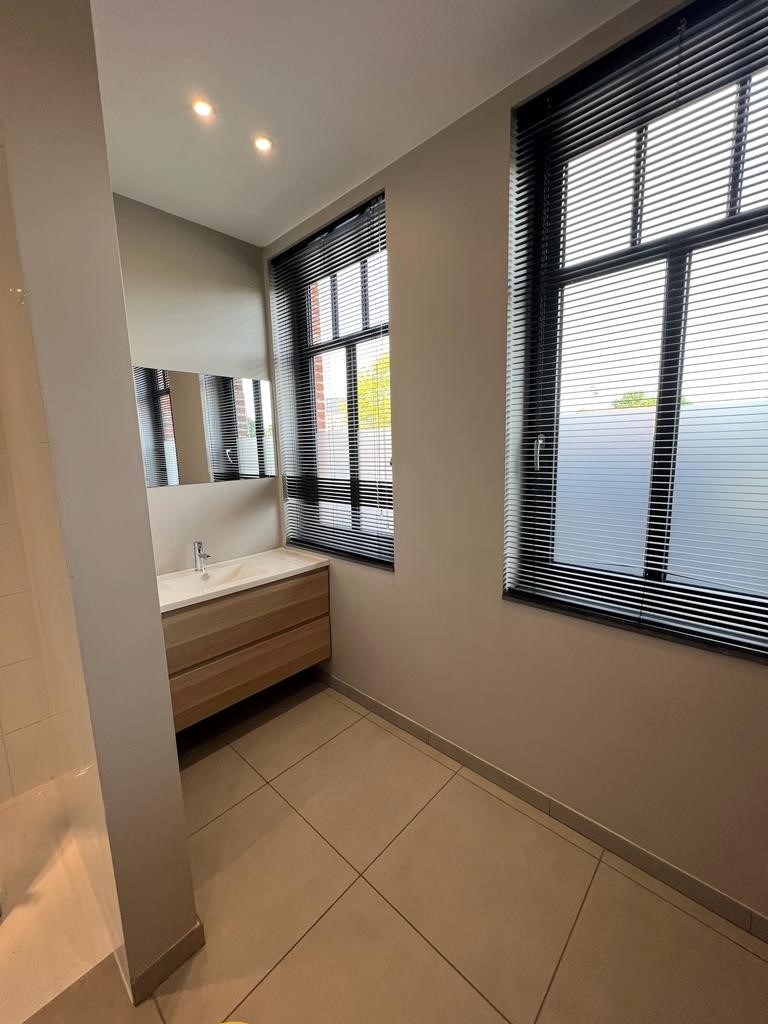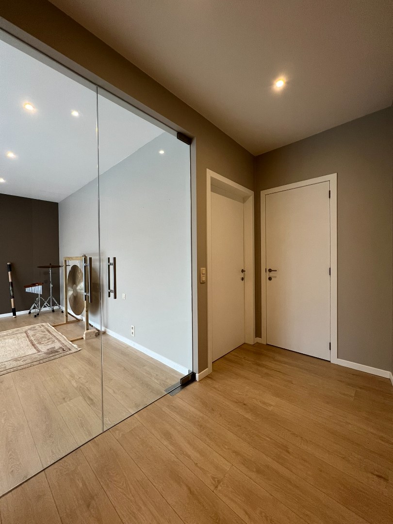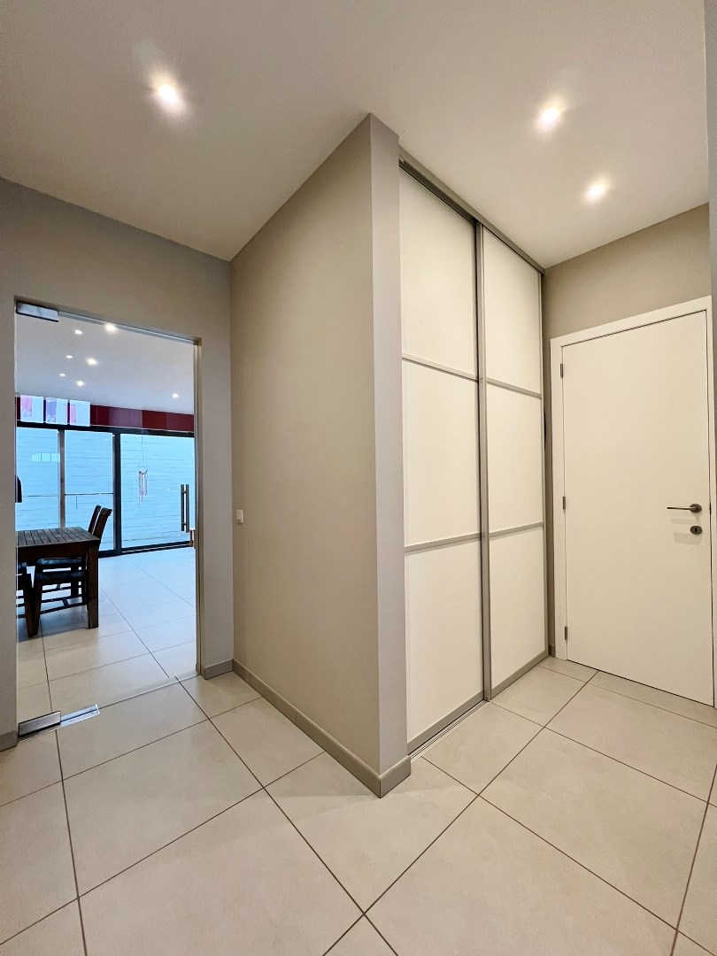Deze woning omvat een gelijkvloerse verdieping met Inkom voorzien van ingemaakte kast, apart toilet, badkamer met inloopdouche en lavabomeubel, bureau/dressing/bergruimte, lichtrijke leefruimte met volledig ingerichte open keuken en aansluitende bergruimte. Via een groot openschuivend raam is er toegang tot de koer.
