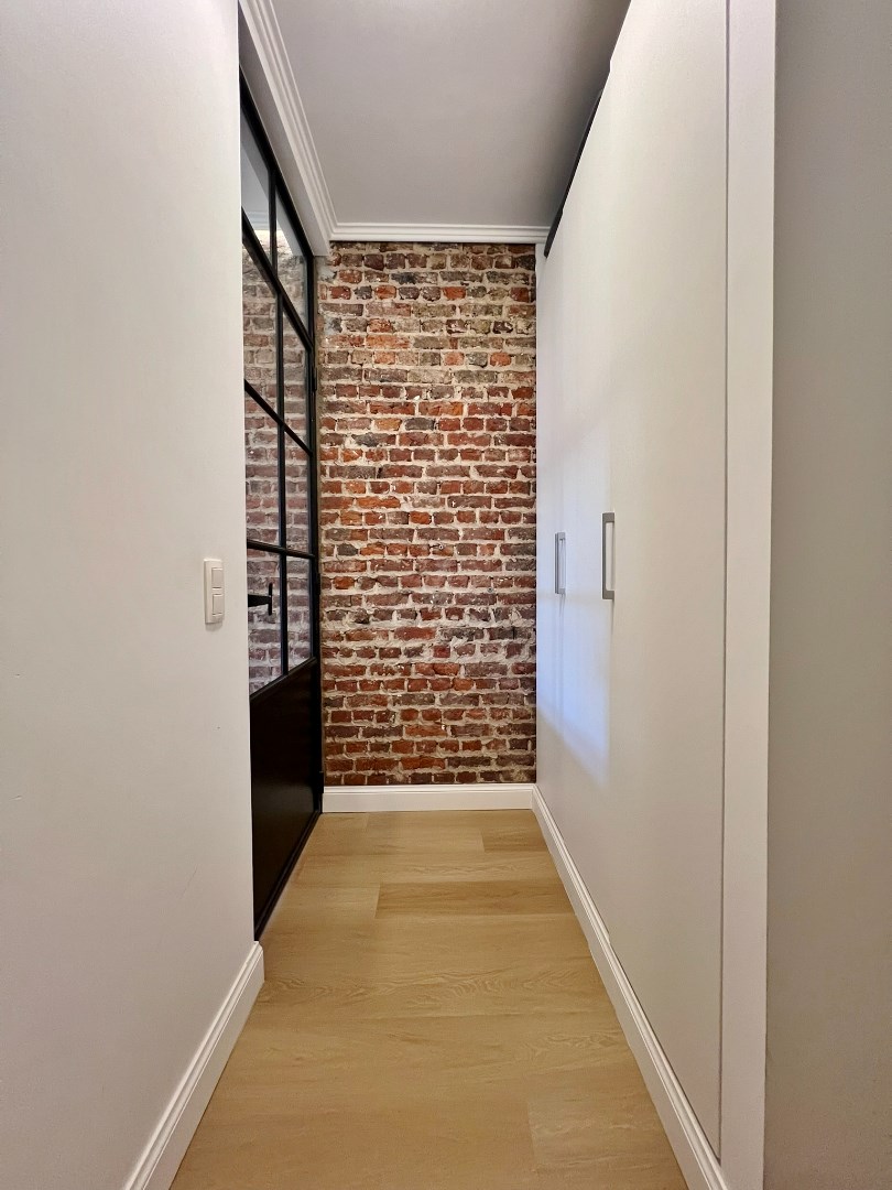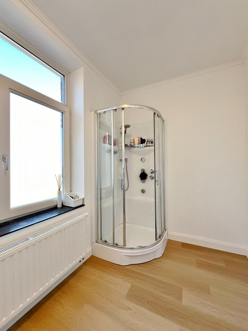 Op het tweede verdiep kan de eerste slaapkamer teruggevonden worden en via een gang met ingemaakte kast kom je bij een apart toilet en een badkamer met dubbel lavabomeubel en douche.