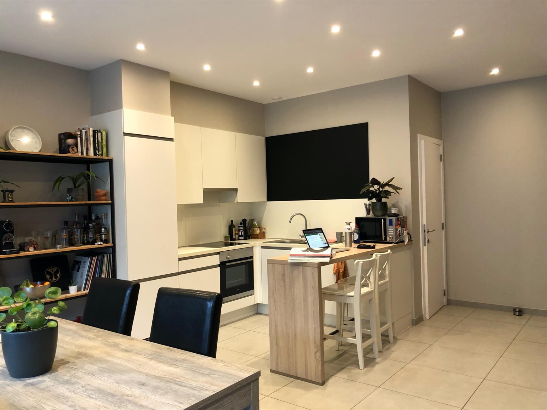 Lichtrijke living met open volledig ingerichte keuken.