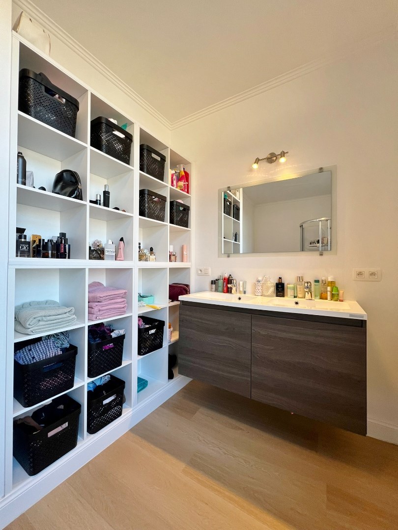 Op het tweede verdiep kan de eerste slaapkamer teruggevonden worden en via een gang met ingemaakte kast kom je bij een apart toilet en een badkamer met dubbel lavabomeubel en douche.