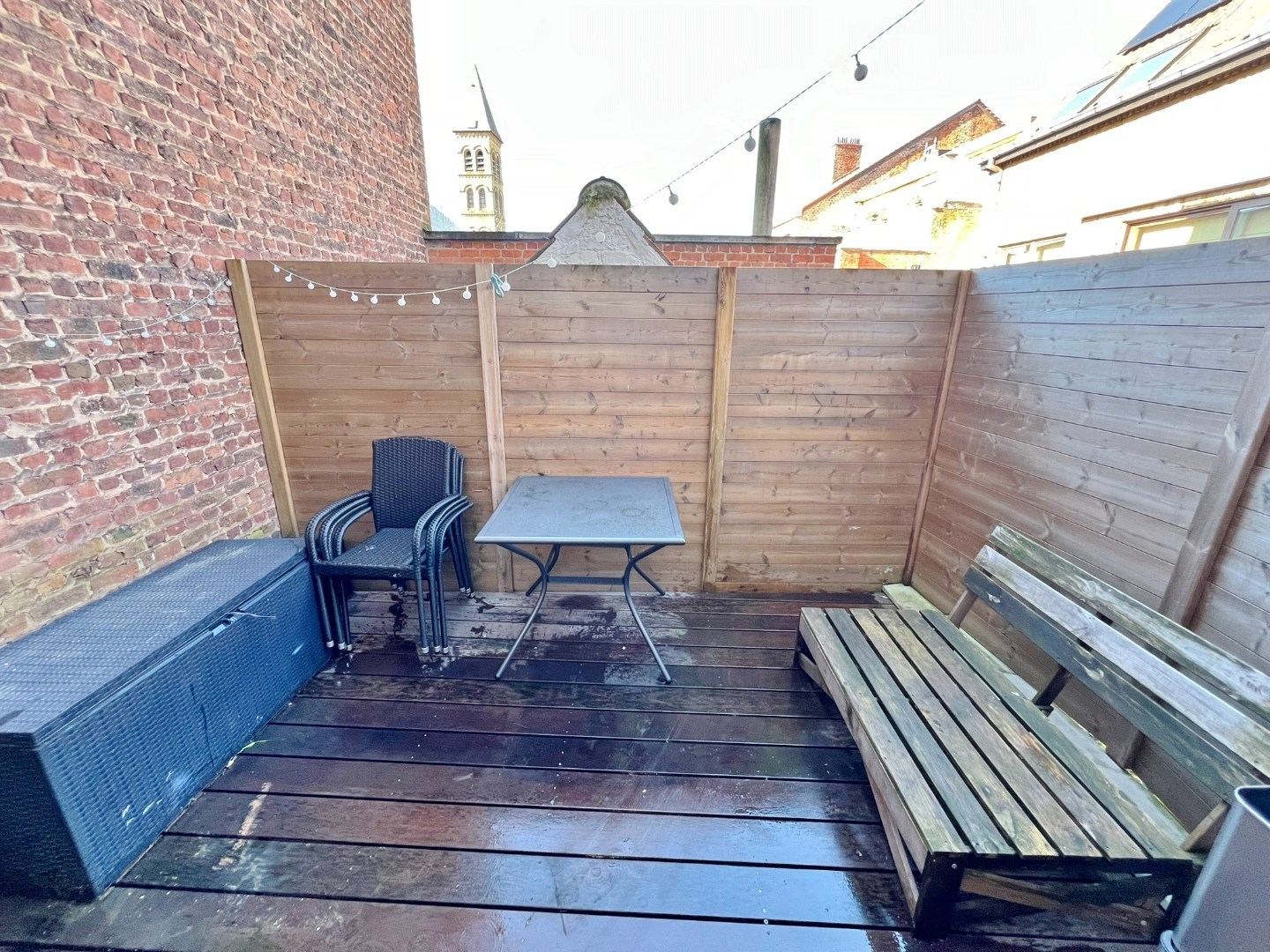 Op het eerste verdiep bevindt zich de ruime lichtrijke leefruimte en de volledig geïnstalleerde keuken, met aansluitend een gezellig terras.