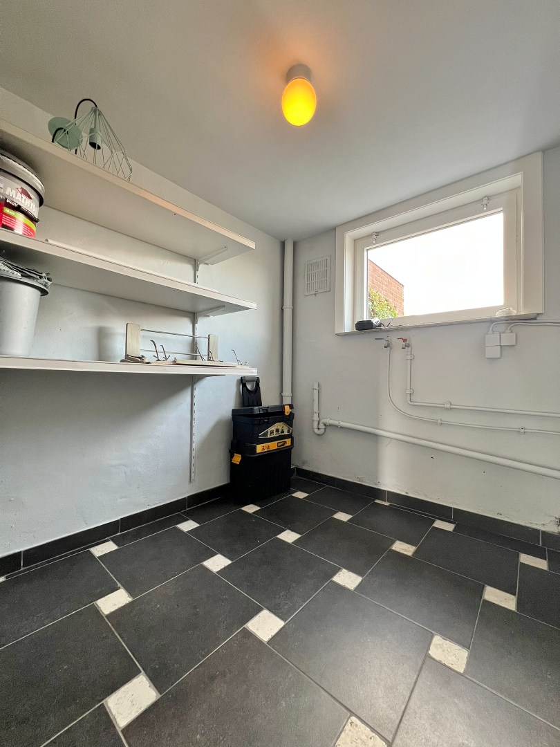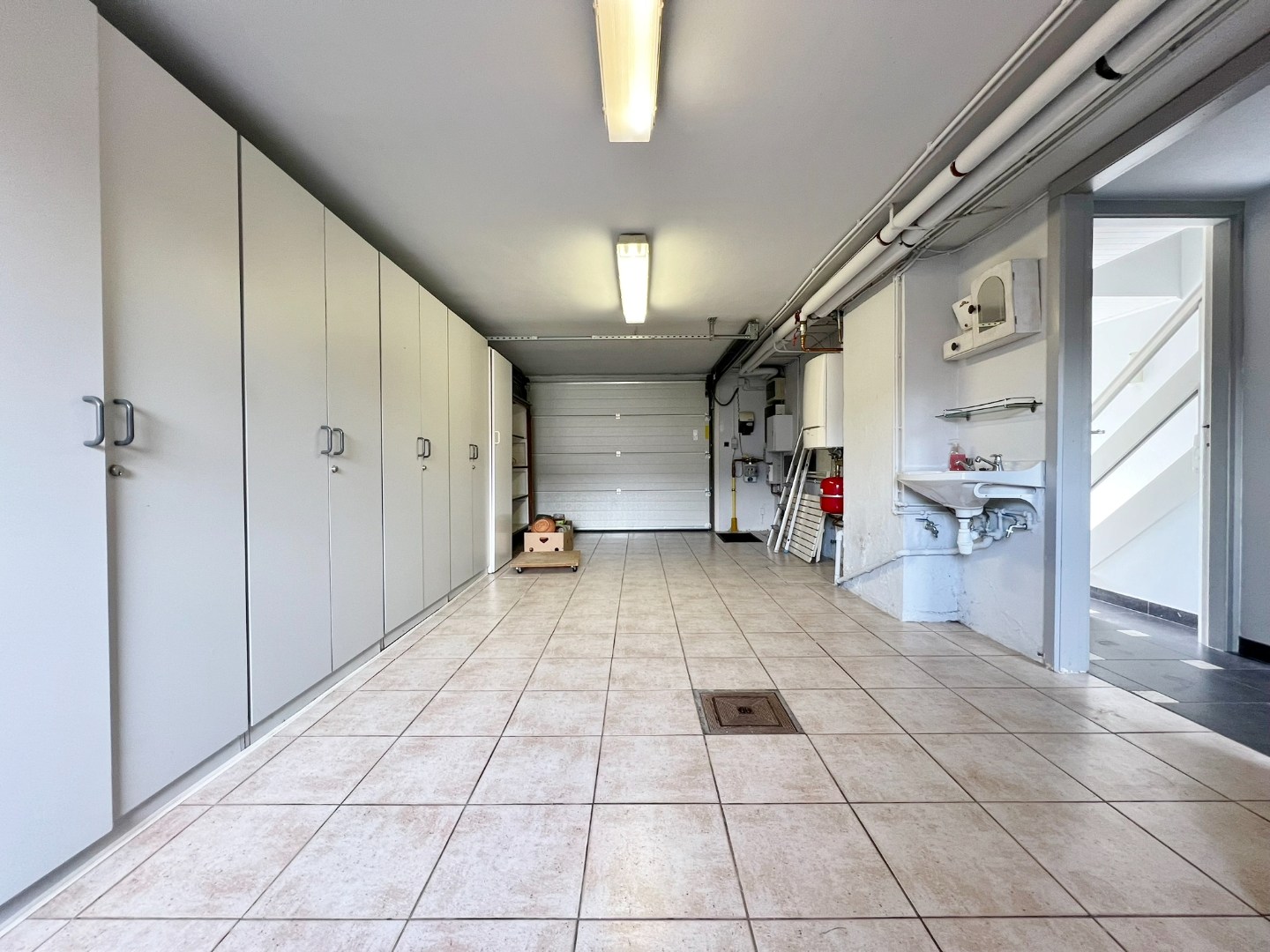 Een gelijkvloerse verdieping met: inkom, wasplaats, ruime garage met ingemaakt kasten.