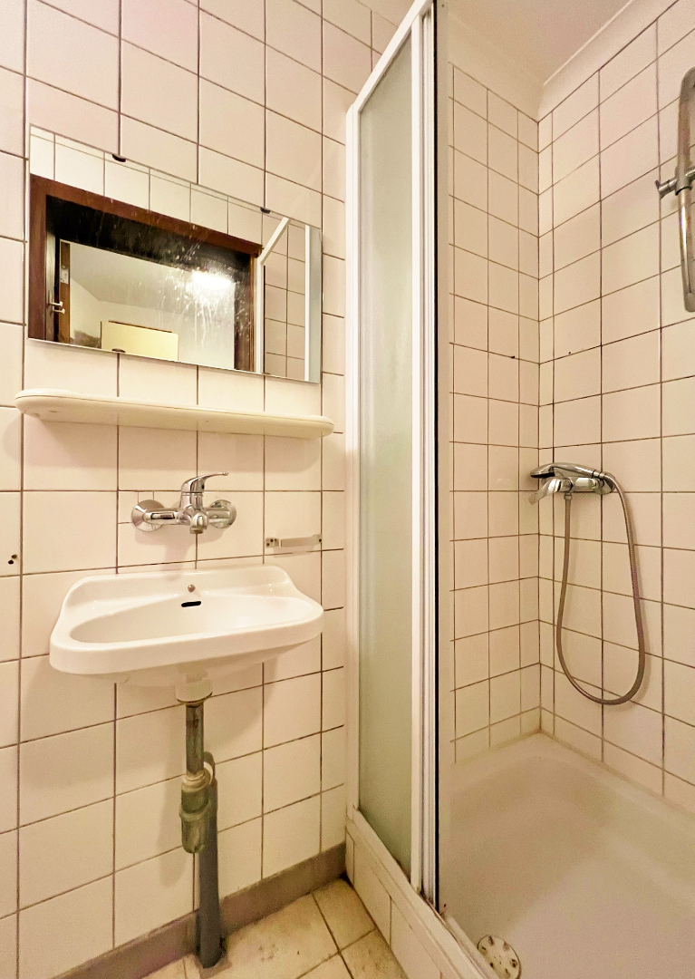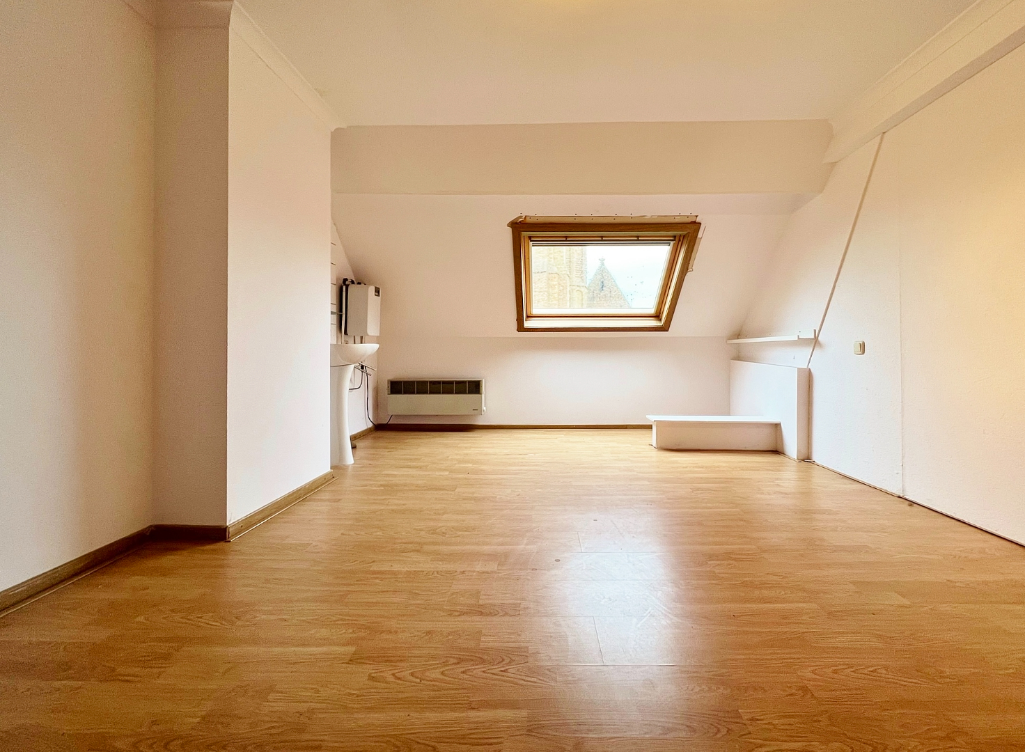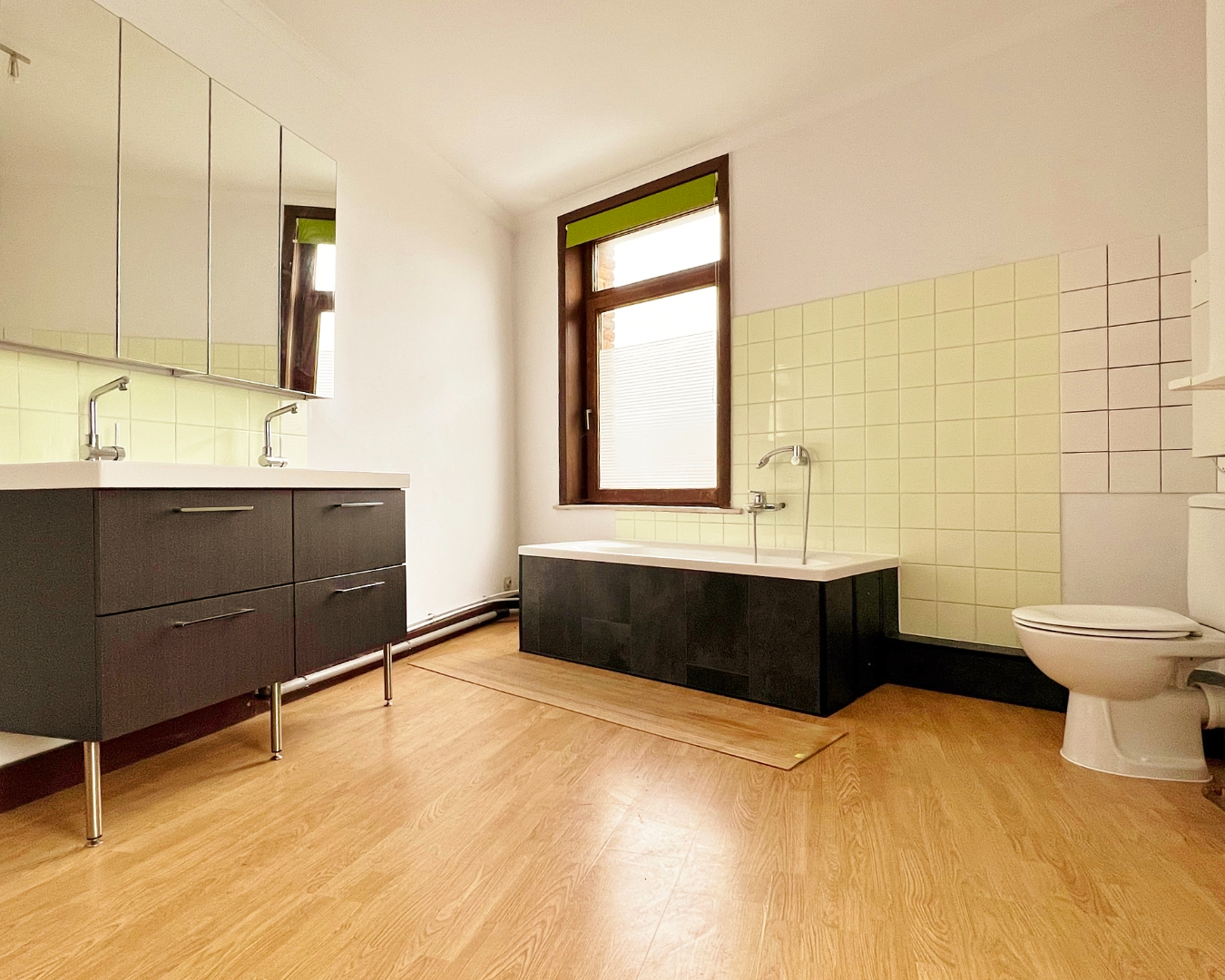 De eerste verdieping bevat een ruime lichtrijke slaapkamer en een badkamer met lavabomeubel, bad en toilet.