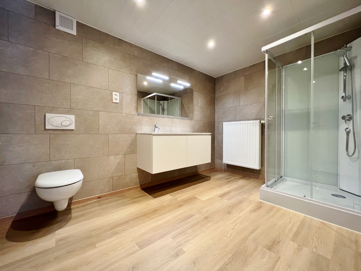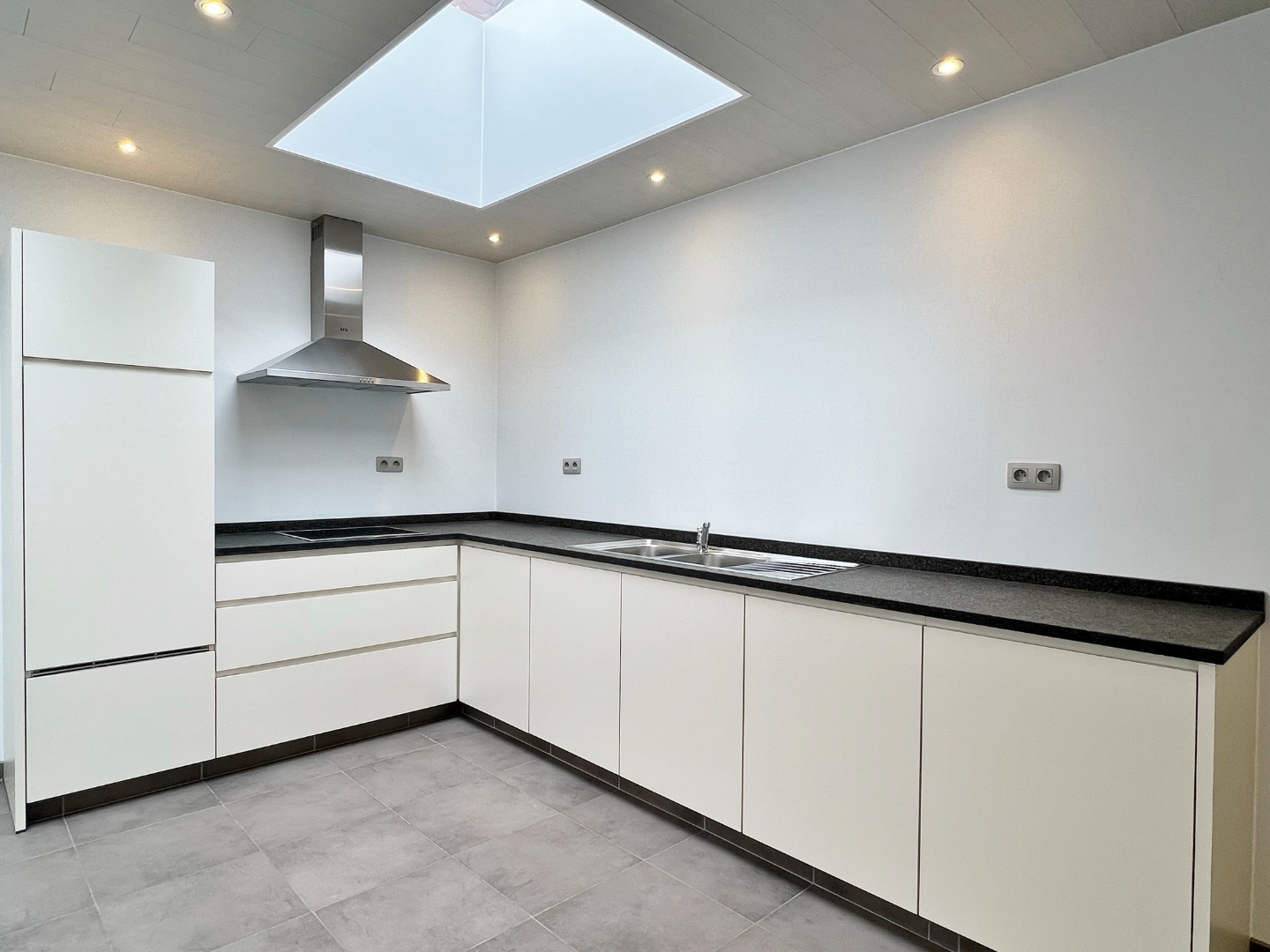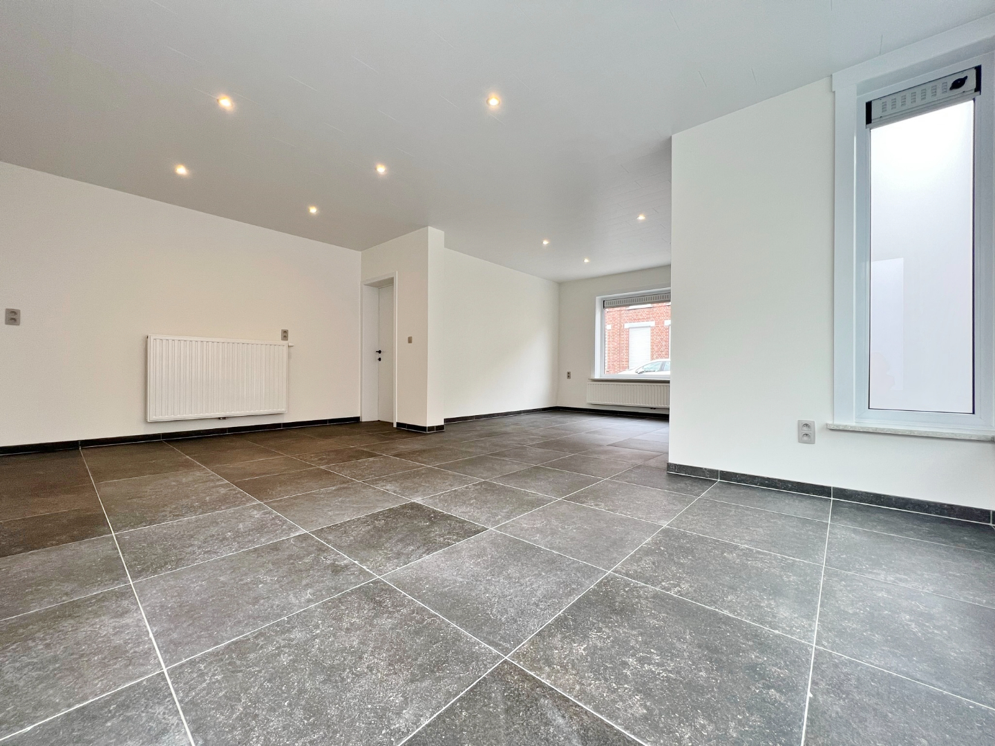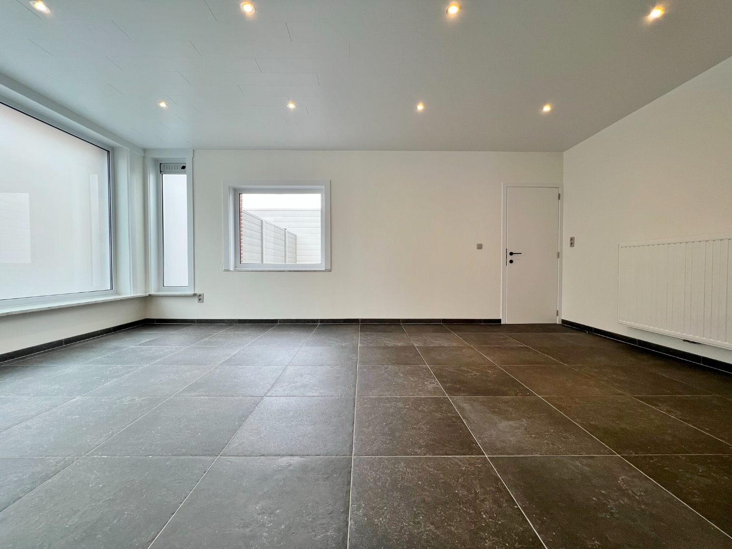 Deze ruime woning werd volledig gerenoveerd en omvat op de gelijkvloers een inkomhal, bureel/bergruimte, ruime en lichtrijke leefruimte, volledig ingerichte keuken, zeer ruime berging/wasplaats en een apart toilet.