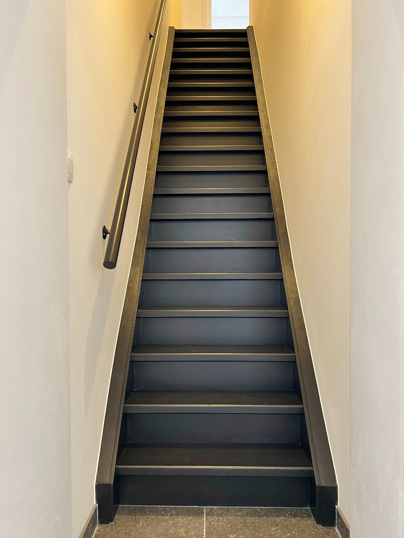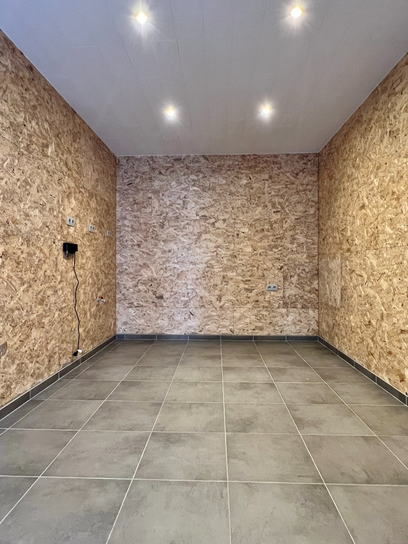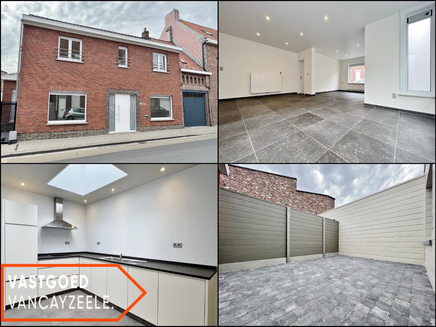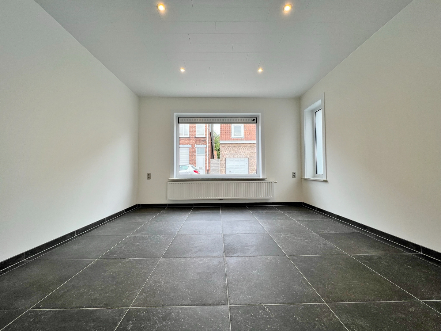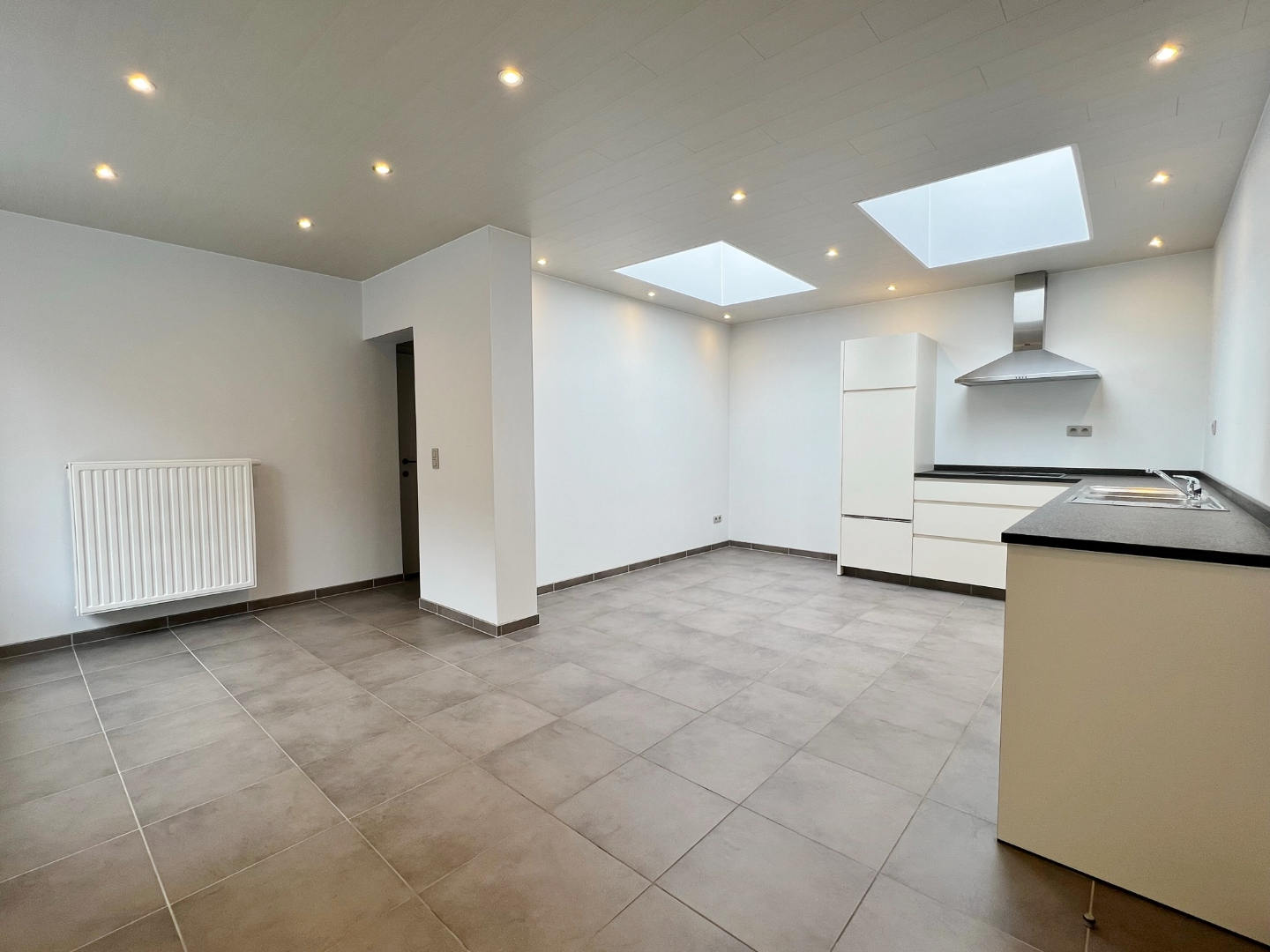 Deze ruime woning werd volledig gerenoveerd en omvat op de gelijkvloers een inkomhal, bureel/bergruimte, ruime en lichtrijke leefruimte, volledig ingerichte keuken, zeer ruime berging/wasplaats en een apart toilet.