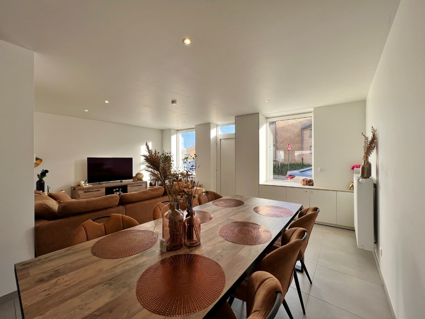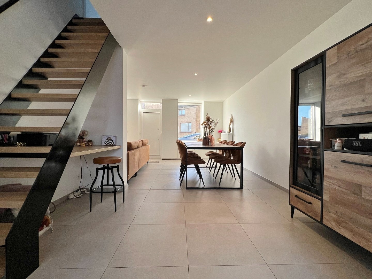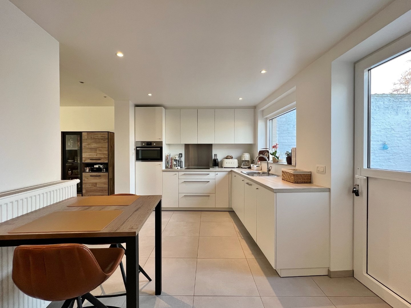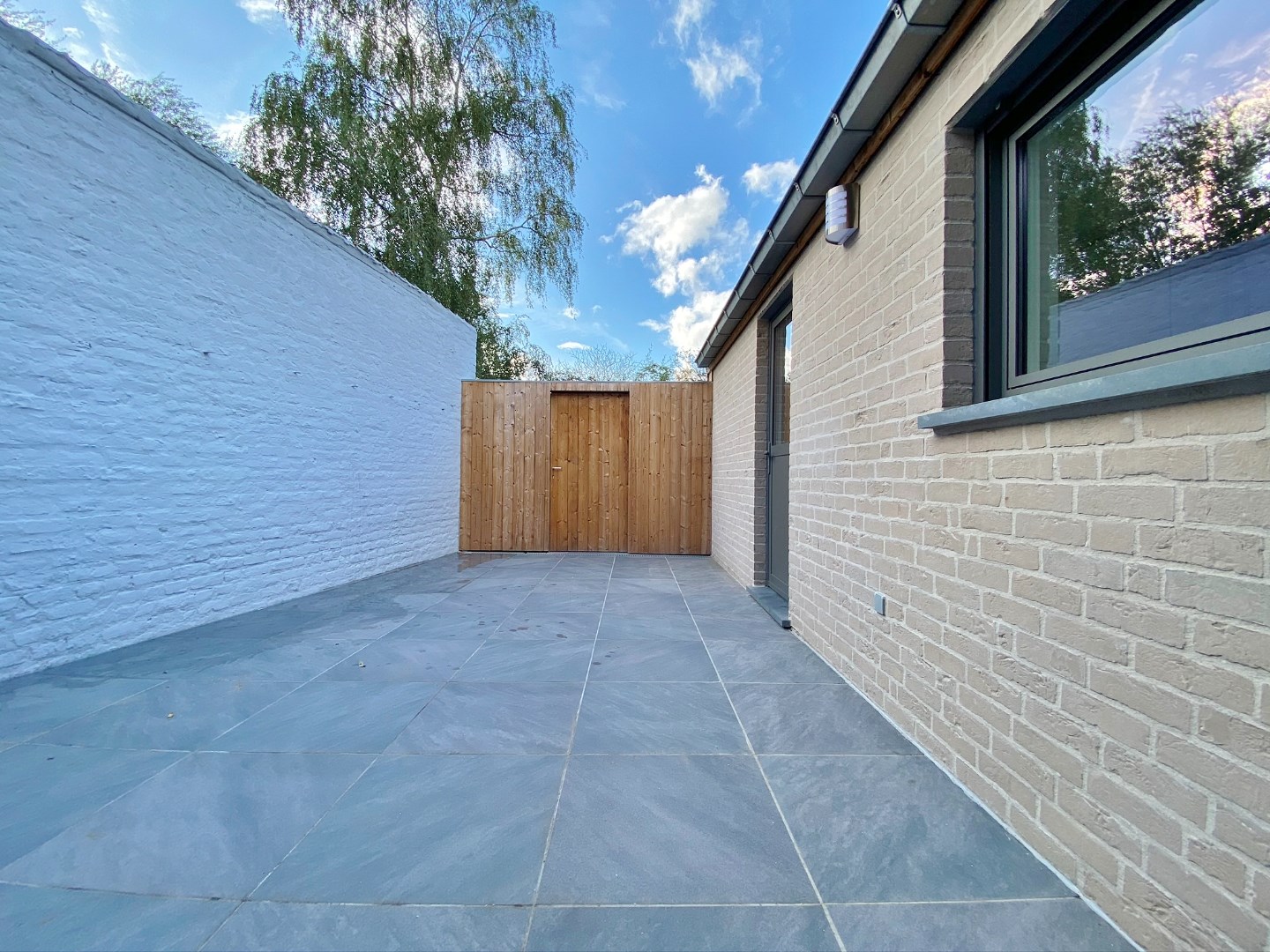Deze centraal gelegen woning werd volledig vernieuwd en omvat een ruime lichtrijke leefruimte met open volledig ingerichte keuken, bergplaats/wasplaats, apart toilet, badkamer met inloopdouche en lavabomeubel. Op het eerste verdiep zijn 2 slaapkamers. Buiten is een volledig afgesloten koer met buitenberging en uitweg langs achter via het wandelpad.