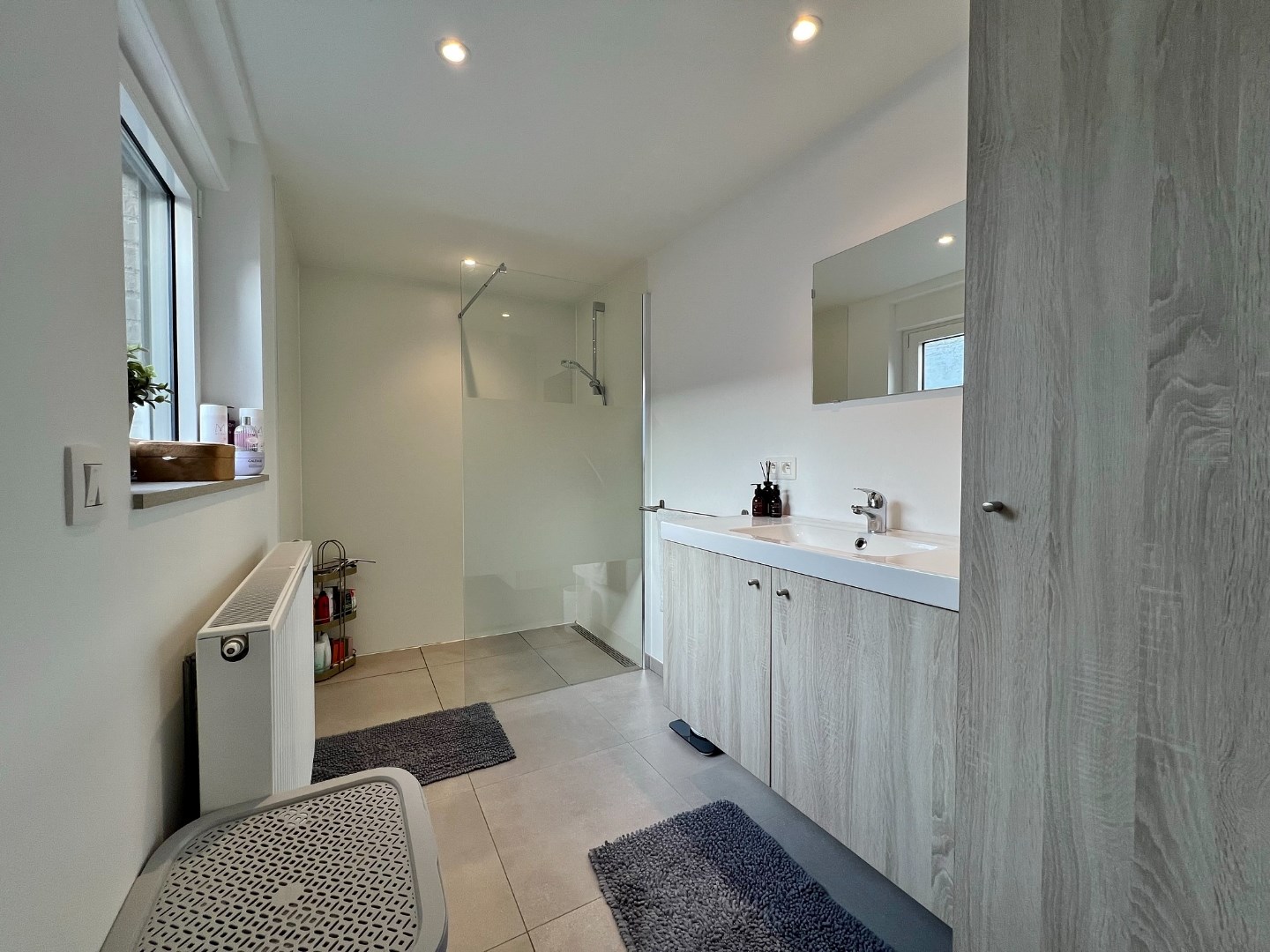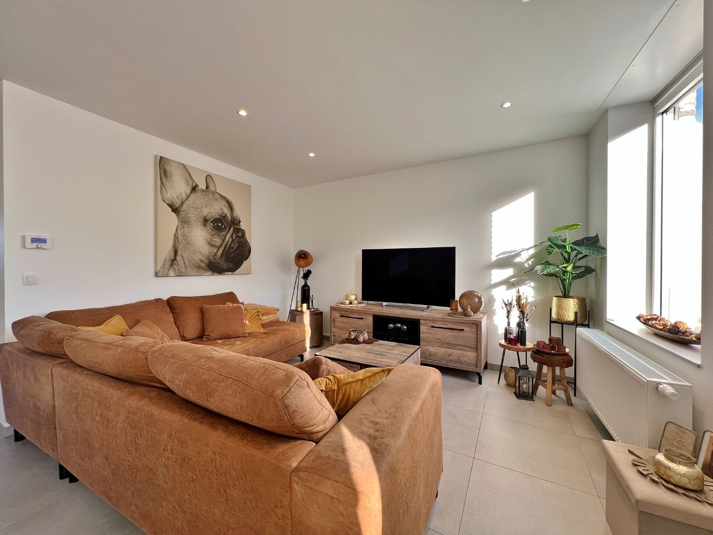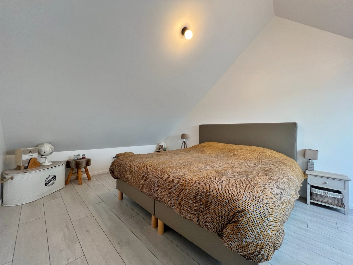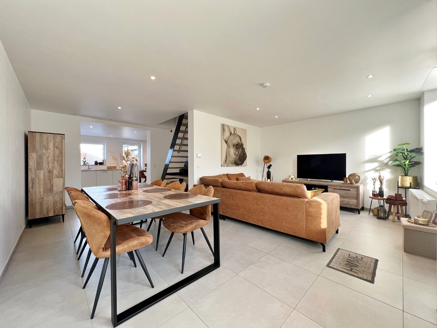 Deze centraal gelegen woning werd volledig vernieuwd en omvat een ruime lichtrijke leefruimte met open volledig ingerichte keuken, bergplaats/wasplaats, apart toilet, badkamer met inloopdouche en lavabomeubel. Op het eerste verdiep zijn 2 slaapkamers. Buiten is een volledig afgesloten koer met buitenberging en uitweg langs achter via het wandelpad.