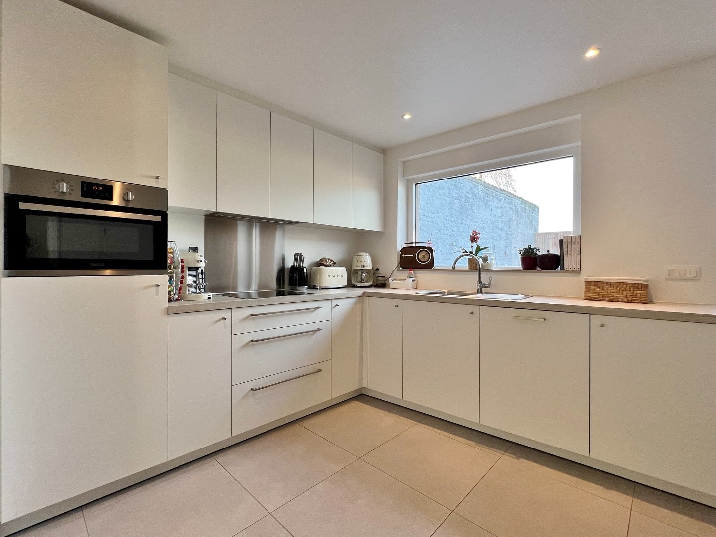 Deze centraal gelegen woning werd volledig vernieuwd en omvat een ruime lichtrijke leefruimte met open volledig ingerichte keuken, bergplaats/wasplaats, apart toilet, badkamer met inloopdouche en lavabomeubel. Op het eerste verdiep zijn 2 slaapkamers. Buiten is een volledig afgesloten koer met buitenberging en uitweg langs achter via het wandelpad.