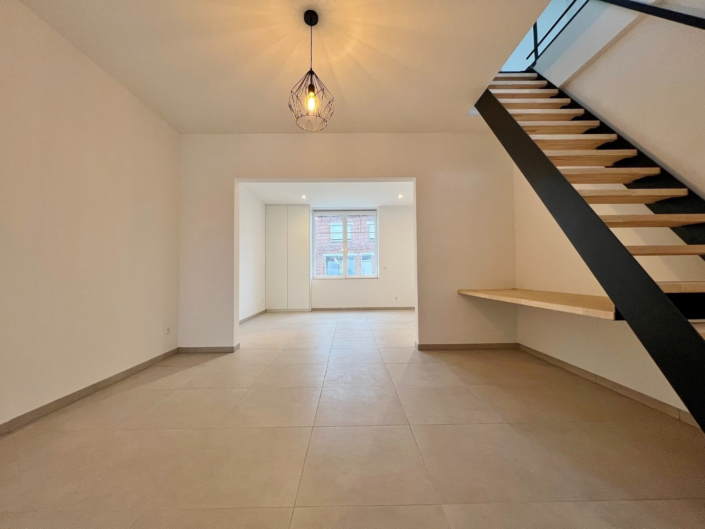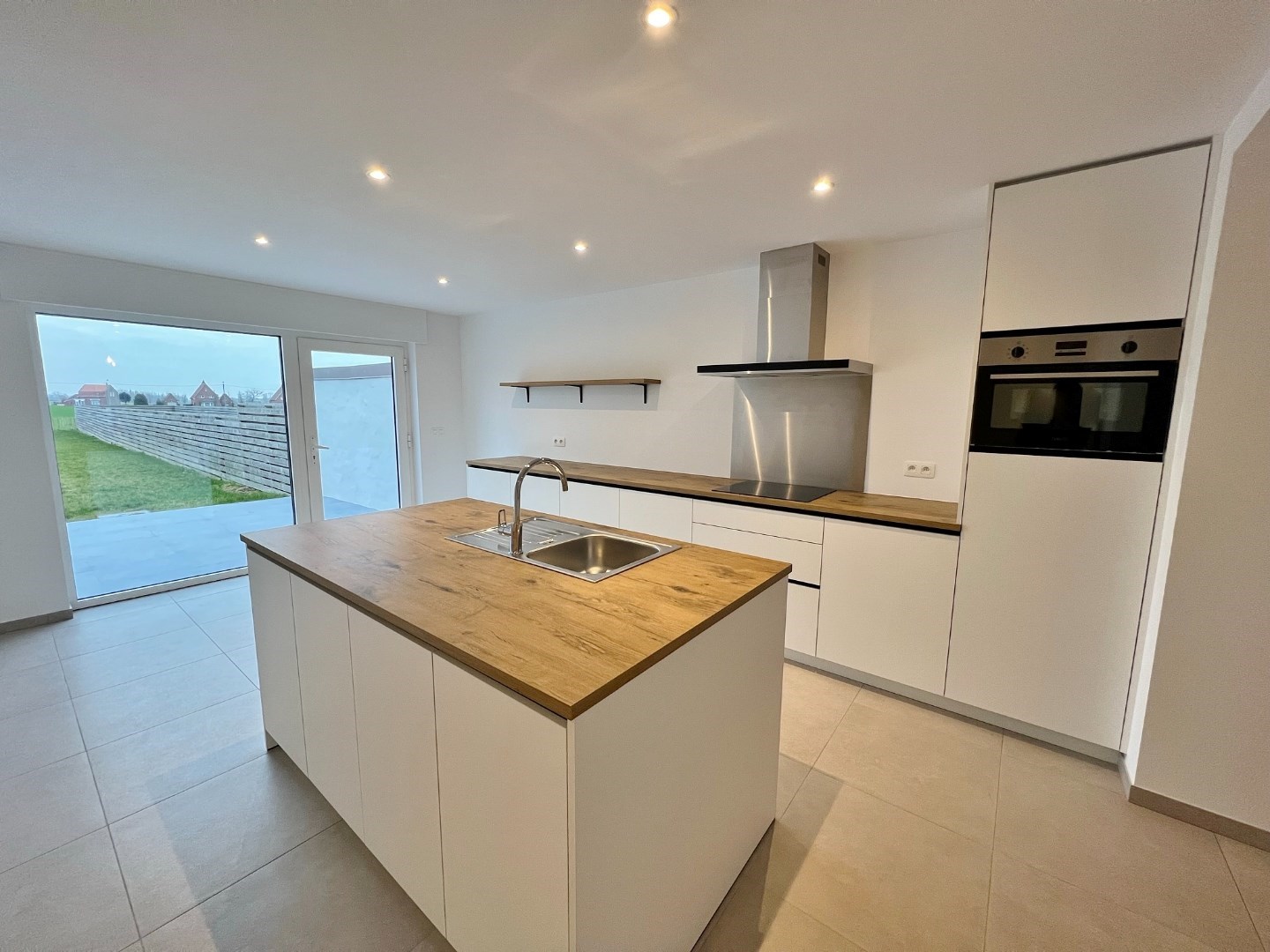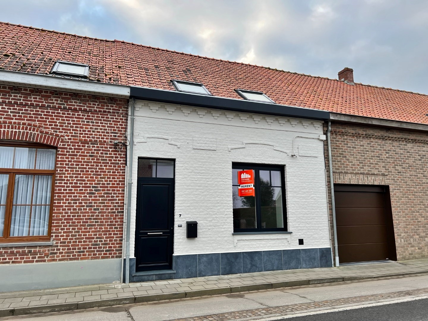Roesbrugge - Deze rijwoning werd onlangs volledig gerenoveerd en omvat op de gelijkvloers een inkomhal, apart toilet, ruime en lichtrijke leefruimte, volledig geïnstalleerde open keuken met zicht op de tuin, berging/wasplaats, badkamer met lavabomeubel en inloopdouche.