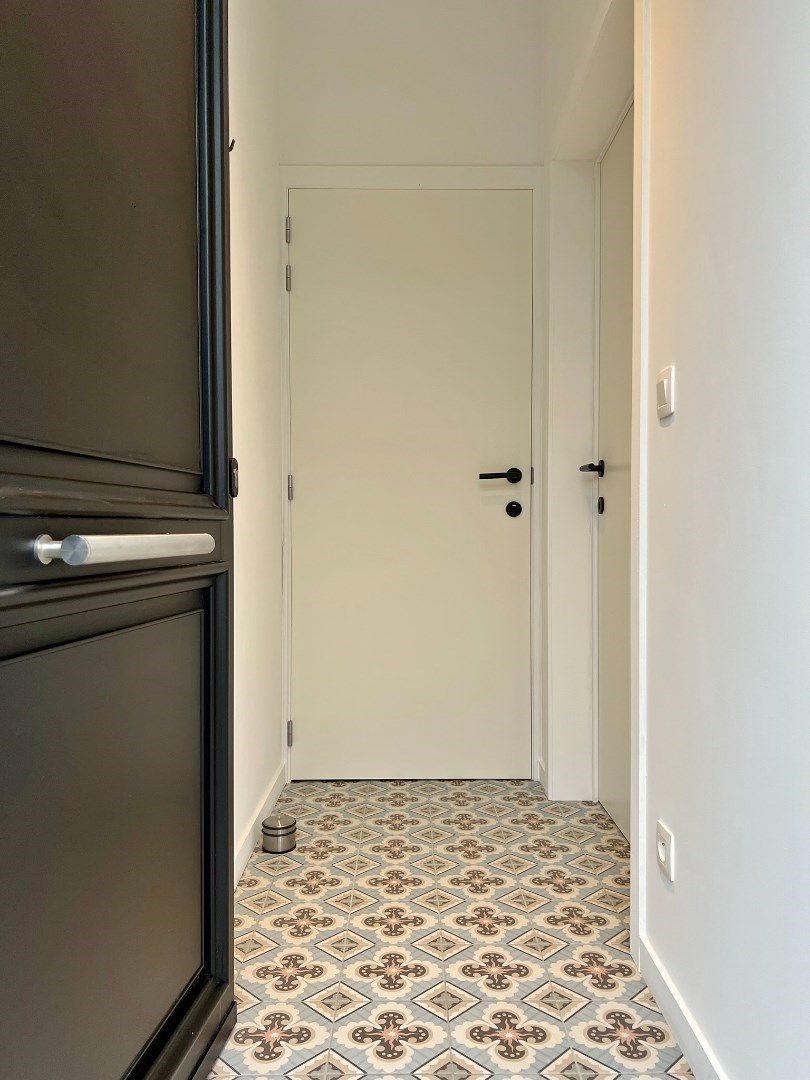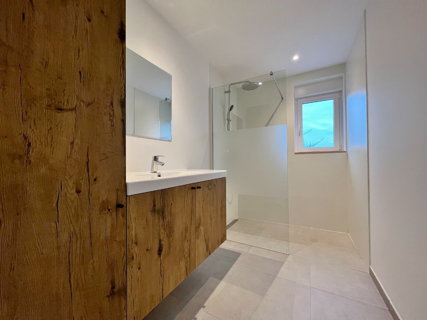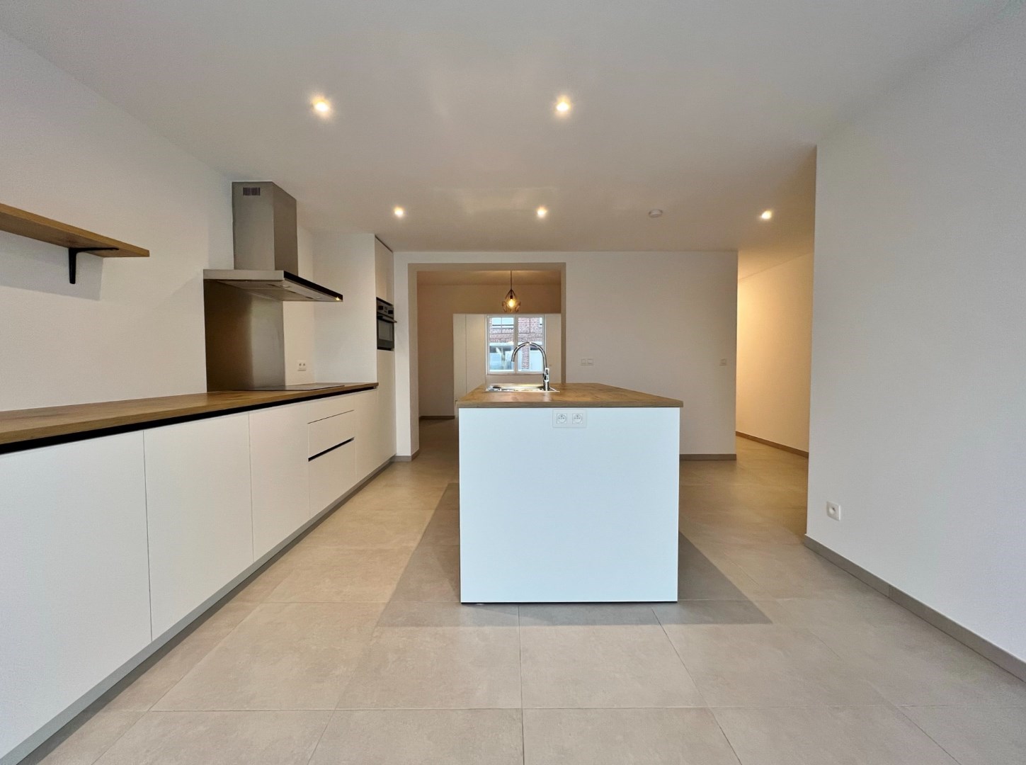 Roesbrugge - Deze rijwoning werd onlangs volledig gerenoveerd en omvat op de gelijkvloers een inkomhal, apart toilet, ruime en lichtrijke leefruimte, volledig geïnstalleerde open keuken met zicht op de tuin, berging/wasplaats, badkamer met lavabomeubel en inloopdouche.