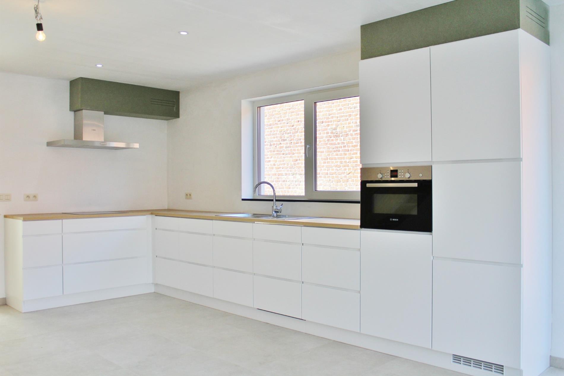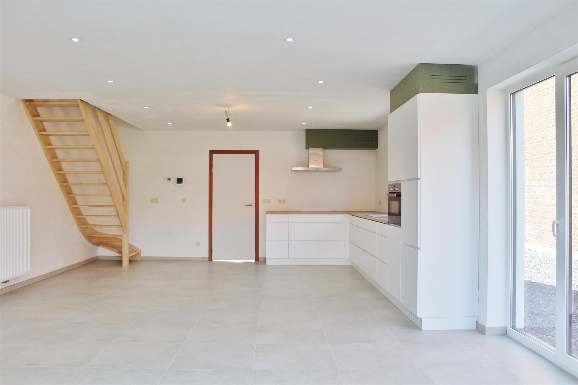 Deze woning is volledig nieuw en bestaat uit een inkomhal, gastentoilet met handwasser, een leefruimte met veel lichtinval van 45m2 met volledig ingerichte open keuken in L-vorm (toestellen aanwezig), groot schuifraam dat toegang geeft tot het terras. wasplaats met de tellers, ventilatie D-systeem, een uitgietbak en condensatieketel Vaillant.