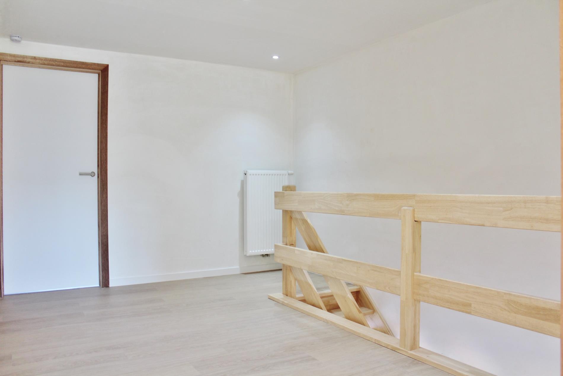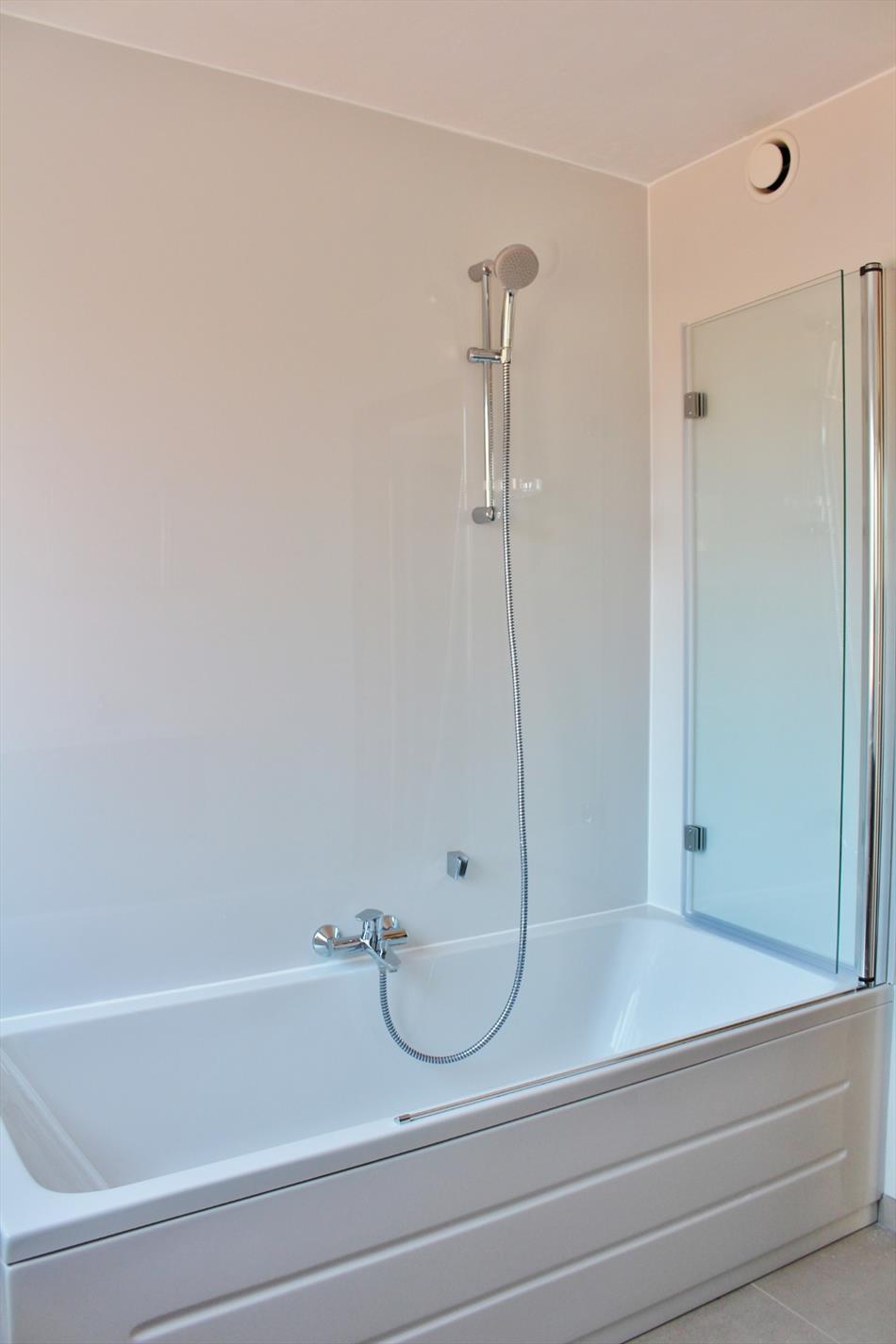Een open trap naar het verdiep met een apart toilet, 3 slaapkamers (10,45+11,10+12,35 m²) en een badkamer met ligbad + glaswand om te douchen , dubbel lavabomeubel met spiegel.
