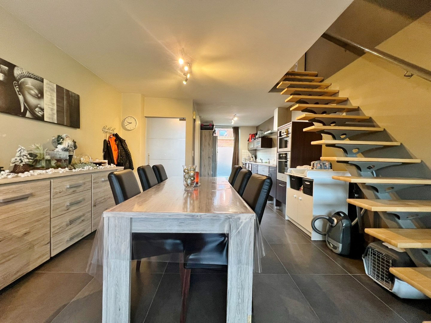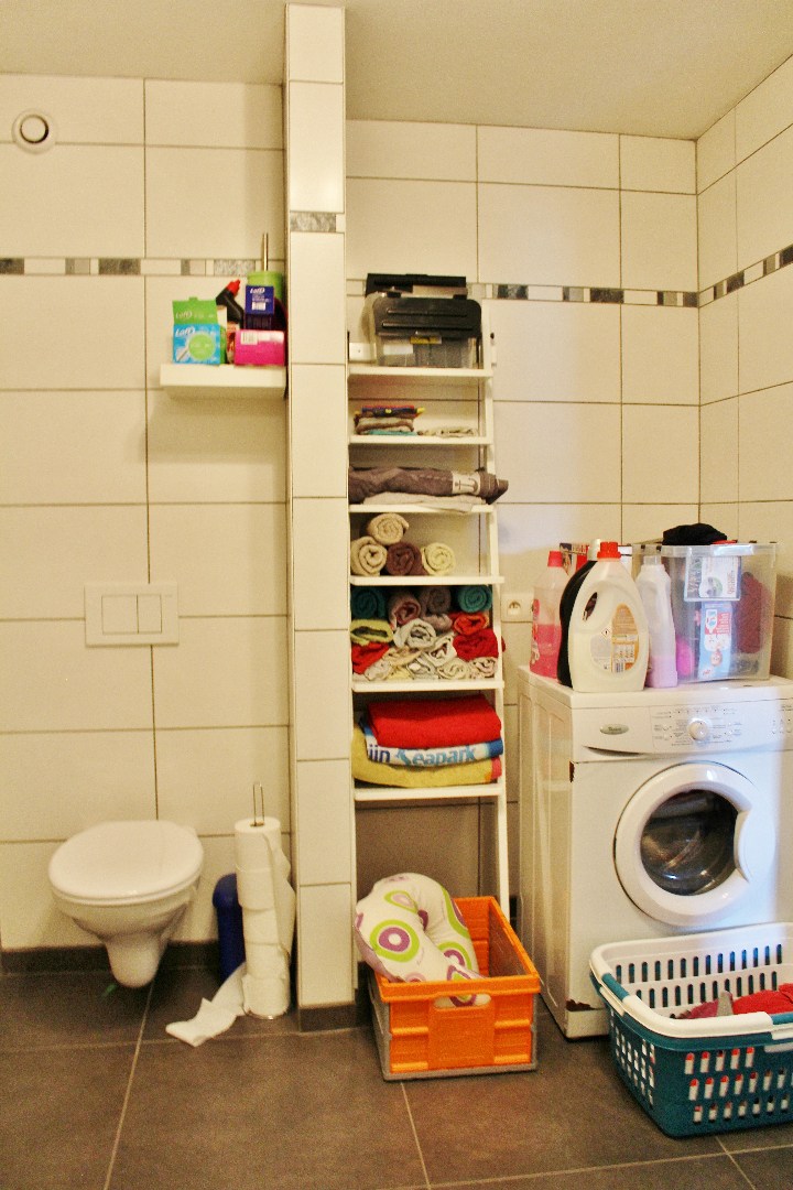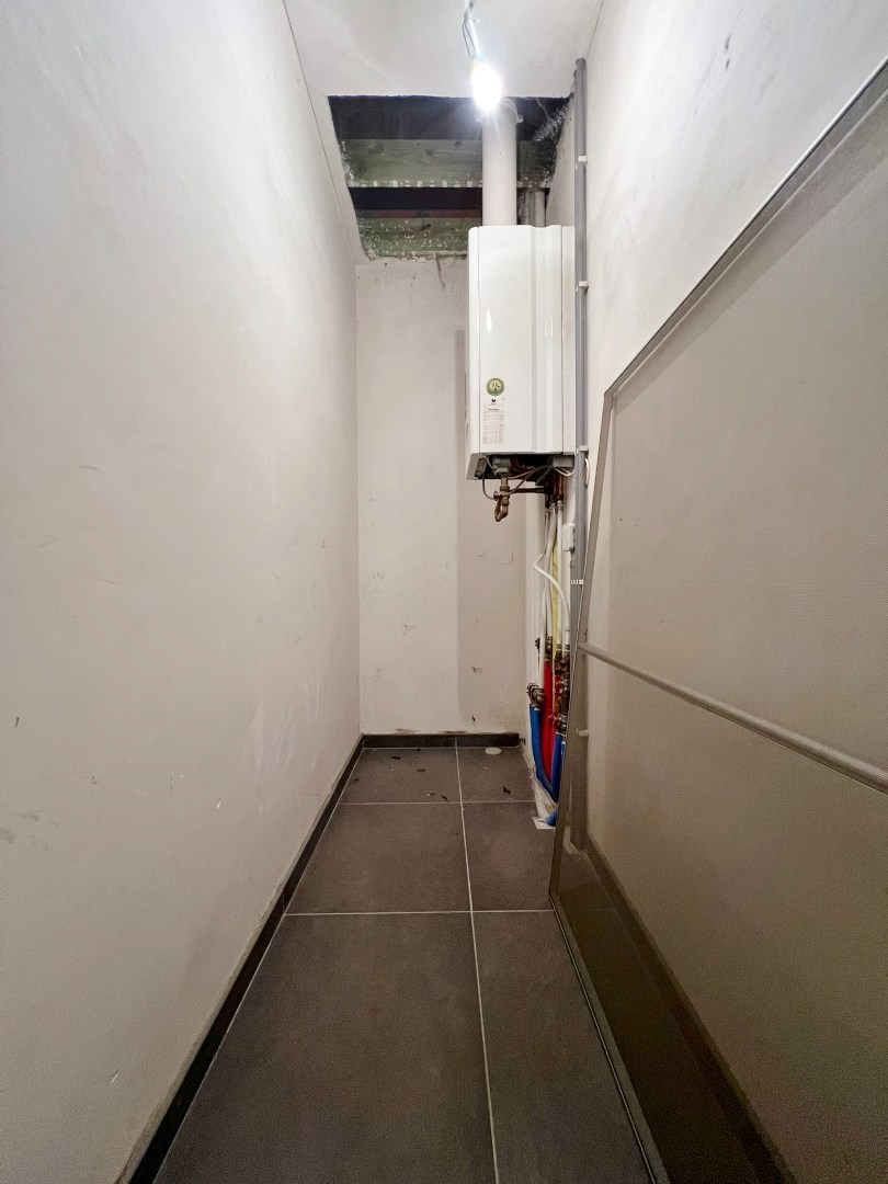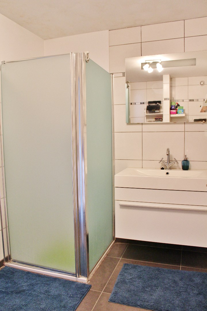 Deze woning bestaat uit een inkom met gastentoilet, ruime leefruimte met schuifraam naar achter en open ingerichte keuken. Op de eerste verdieping zijn 2 ruime slaapkamers en een badkamer met douche, lavabomeubel, toilet en aansluiting voor wasmachine. Op de tweede verdieping zijn 2 ruime slaapkamers en een bergruimte. De koer is achteraan toegankelijk langs het garagepark.