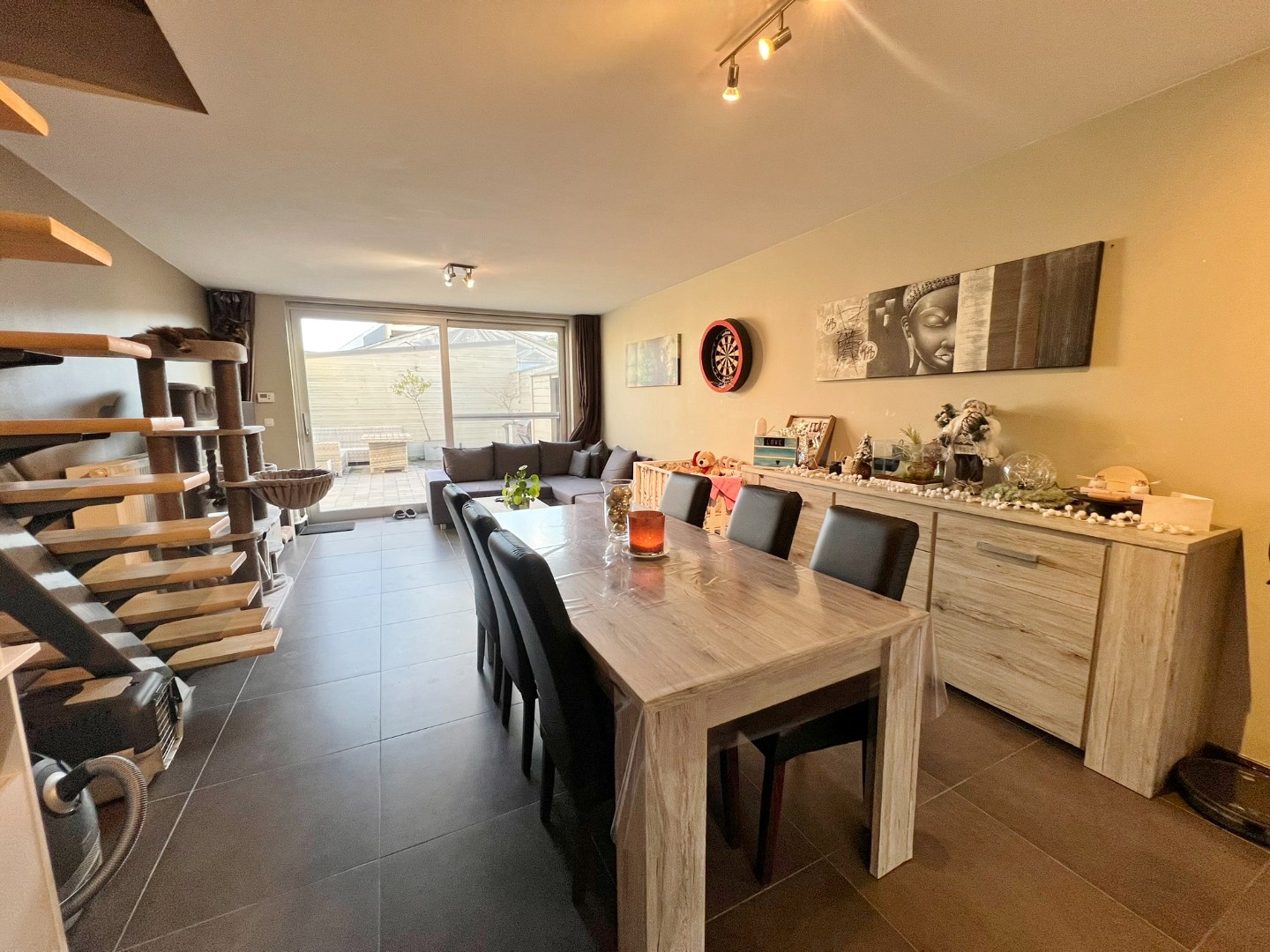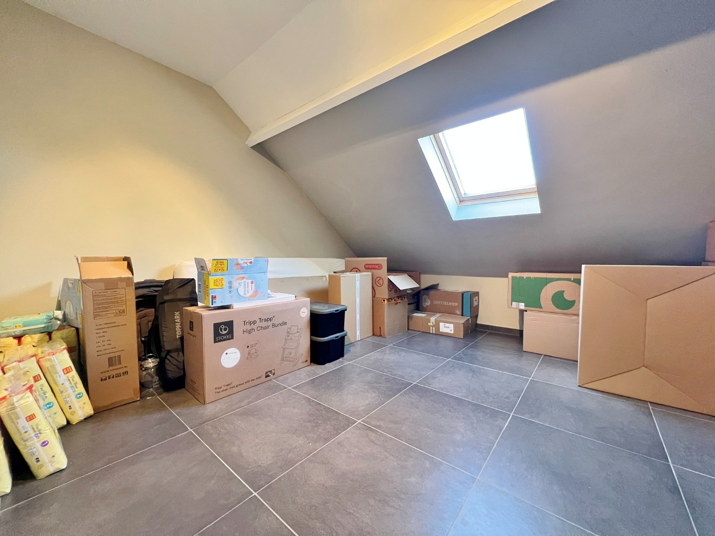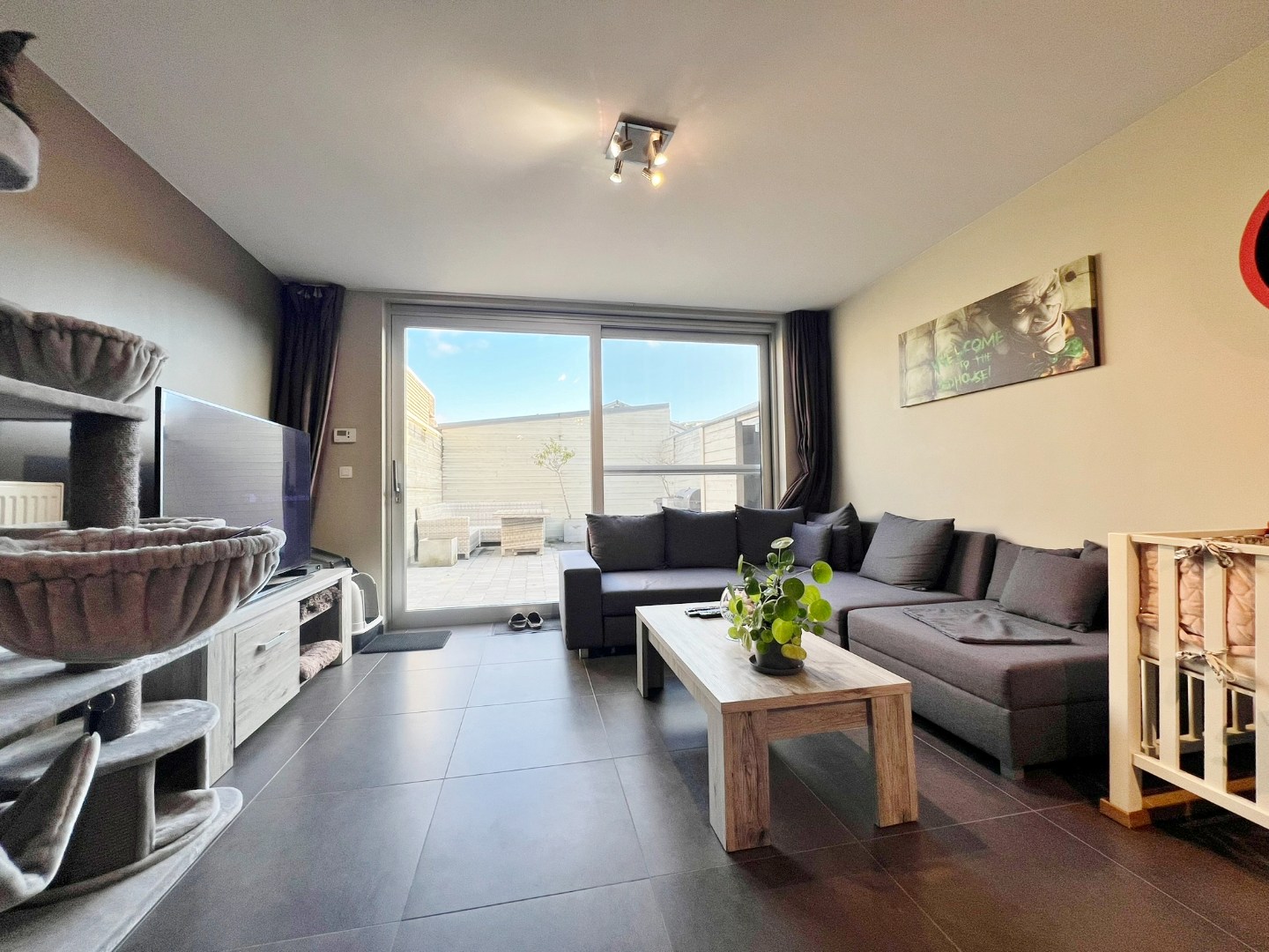 Deze woning bestaat uit een inkom met gastentoilet, ruime leefruimte met schuifraam naar achter en open ingerichte keuken. Op de eerste verdieping zijn 2 ruime slaapkamers en een badkamer met douche, lavabomeubel, toilet en aansluiting voor wasmachine. Op de tweede verdieping zijn 2 ruime slaapkamers en een bergruimte. De koer is achteraan toegankelijk langs het garagepark.