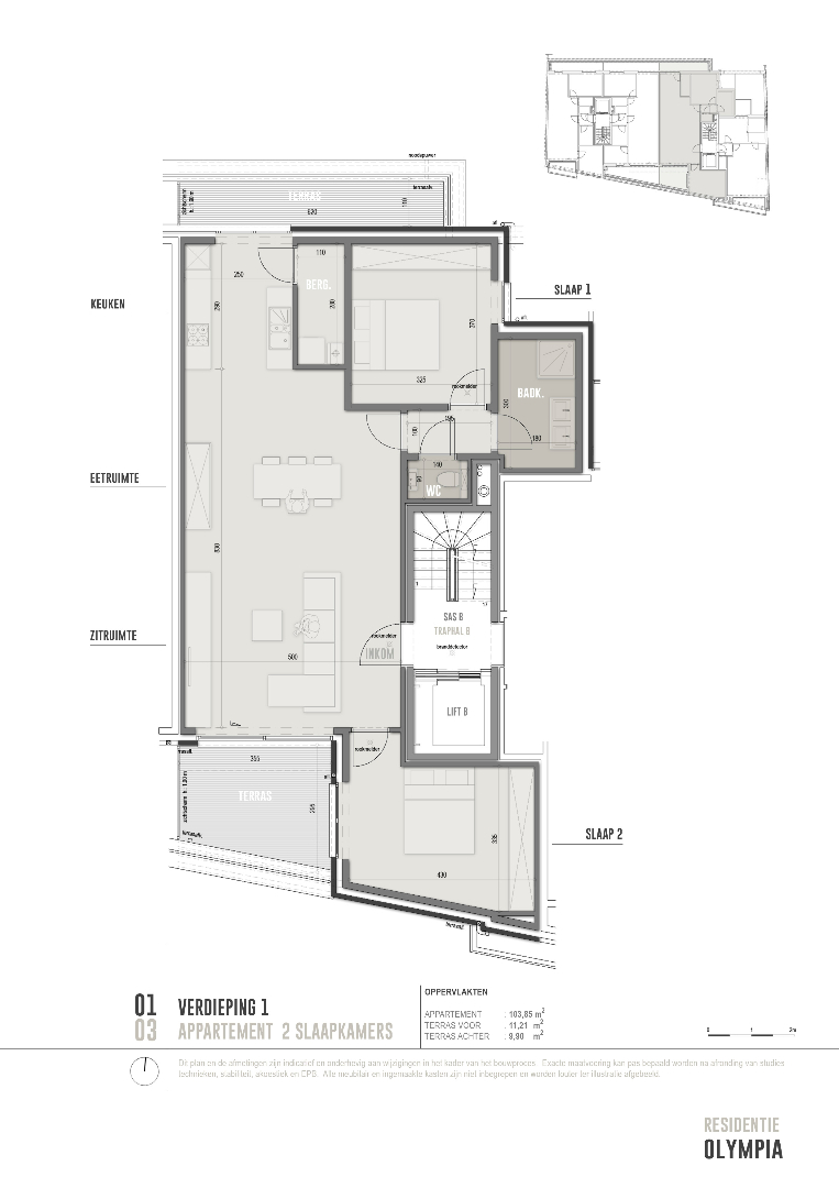 Appartement 1.03 is gelegen op het eerste verdiep en is ingedeeld als volgt: een ruime lichtrijke leefruimte met open keuken waar je via een groot schuifraam toegang hebt tot het zuid-gericht terras en achteraan toegang tot een tweede terras, bergruimte, apart toilet, twee ruime slaapkamers waarvan 1 met rechtstreekse toegang tot de badkamer met douche en dubbel lavabomeubel.