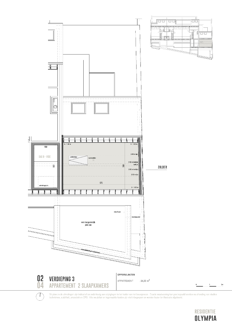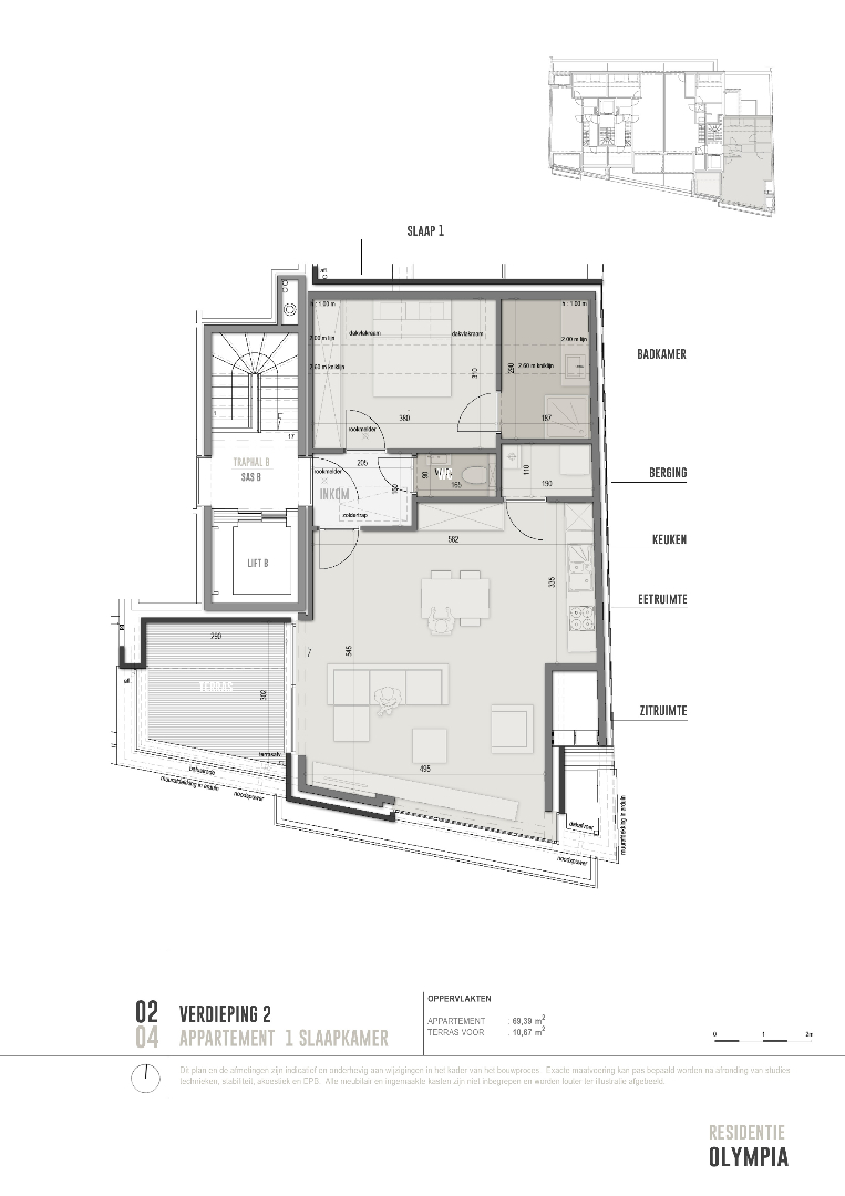 Appartement 2.04 is gelegen op het tweede verdiep en is ingedeeld als volgt: een inkom, apart toilet, ruime lichtrijke leefruimte met open keuken waar je via een groot schuifraam toegang hebt tot het zuid-gericht terras, bergruimte, ruime slaapkamer met rechtstreekse toegang tot badkamer met douche en lavabomeubel. Er is tevens een zolderverdieping bereikbaar via zoldertrap in de inkom.