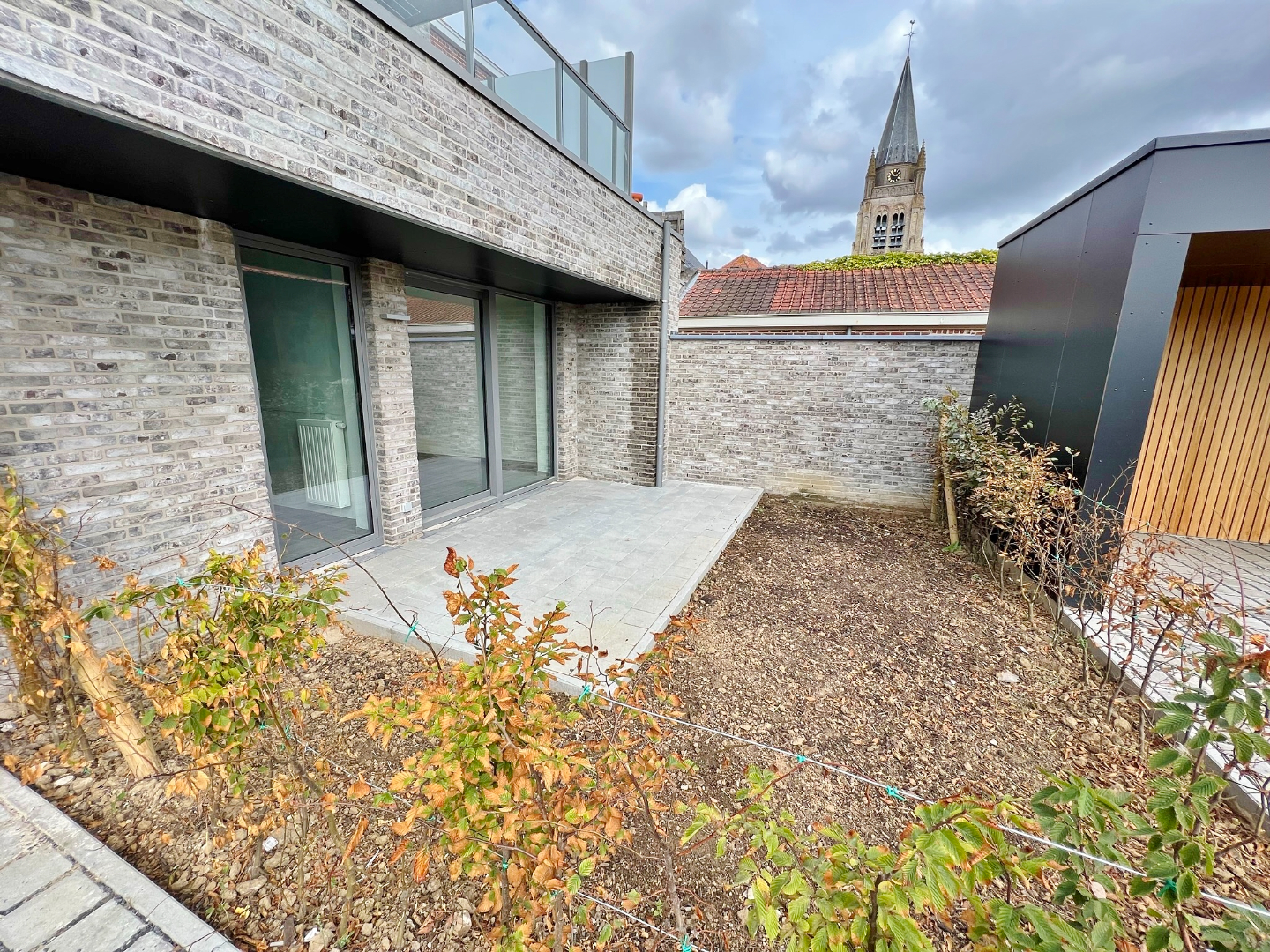De tuin met aangelegd terras bevindt zich achter het gebouw aan de zuidkant.