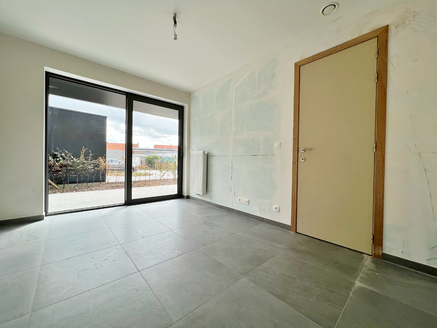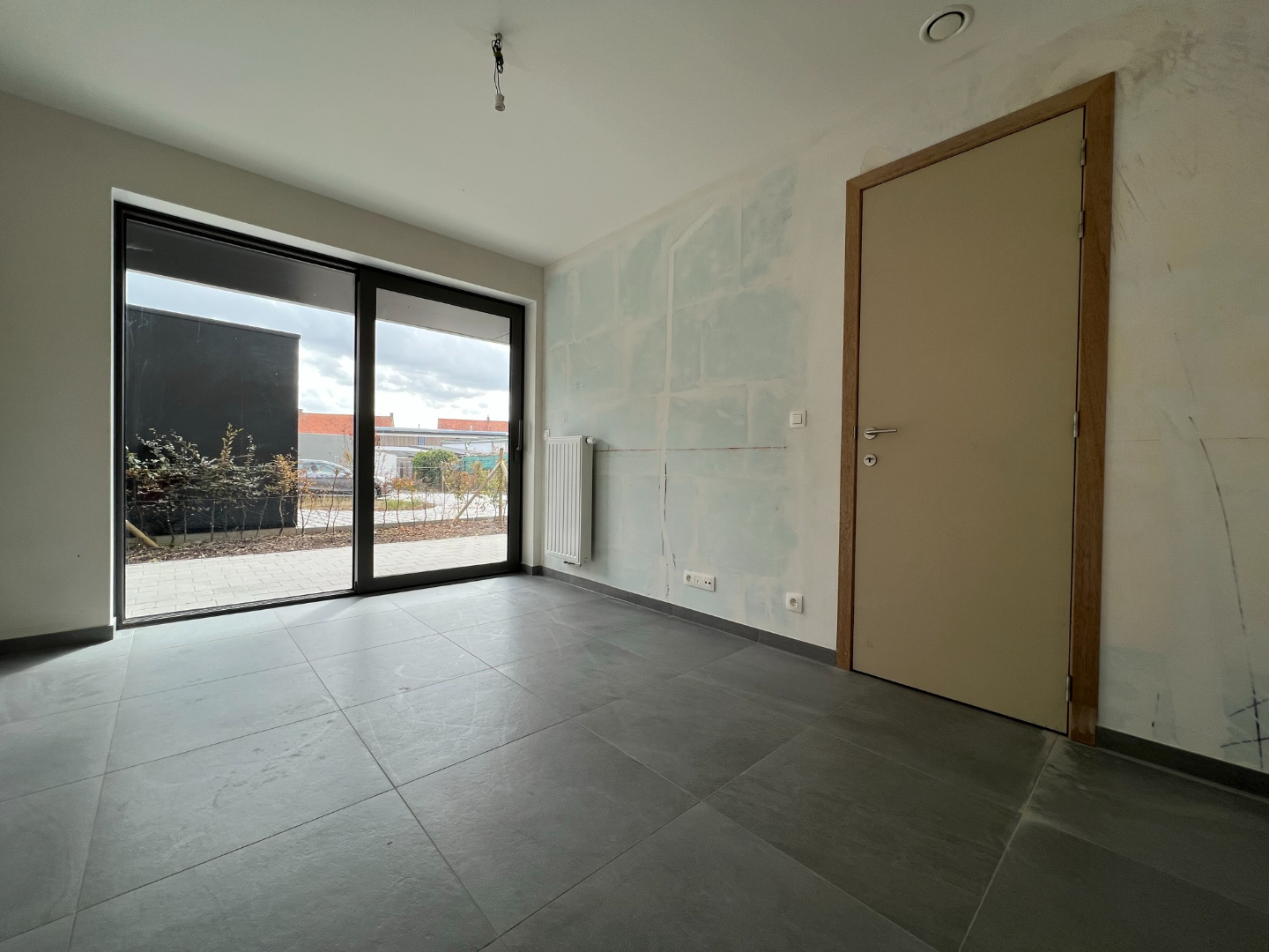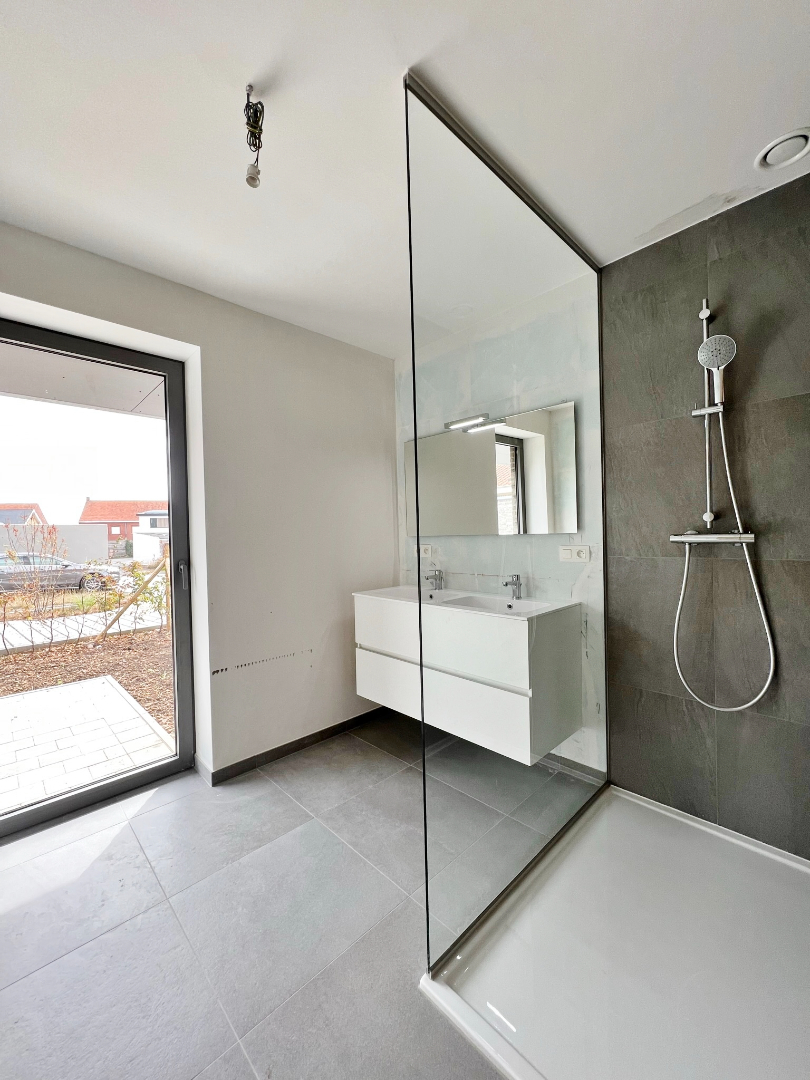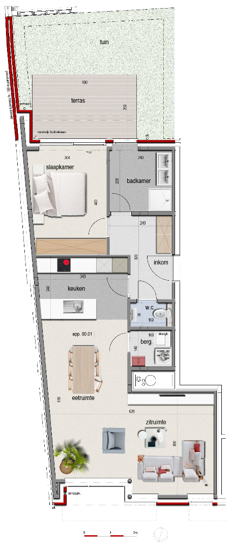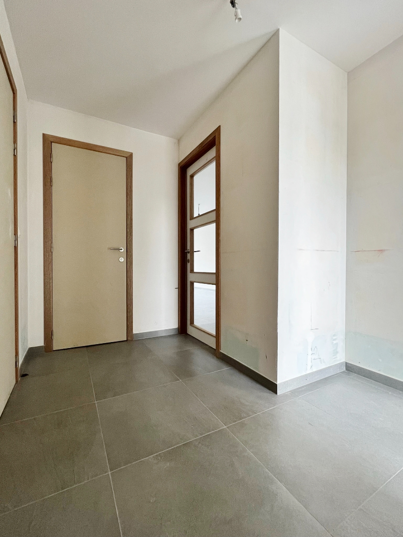 Appartement 0.1 bevindt zich op de gelijkvloerse verdieping, er zijn slechts 2 appartementen op dit verdiep. Wanneer u het appartement binnenkomt, komt u terecht in de inkomhal met apart toilet.