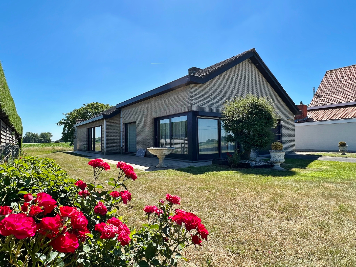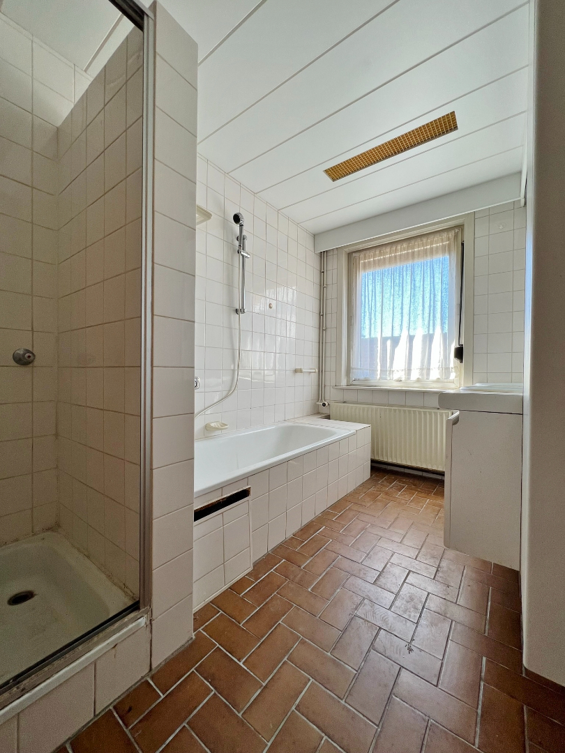 Deze op te frissen gelijkvloerse villa is rustig gelegen met open zicht over de velden en omvat een gelijkvloerse verdieping met inkom, ruime lichtrijke leefruimte, keuken, wasplaats, 3 ruime slaapkamers, badkamer met bad, douche en lavabomeubel, apart toilet en een ruime garage. Er is tevens een zolder.