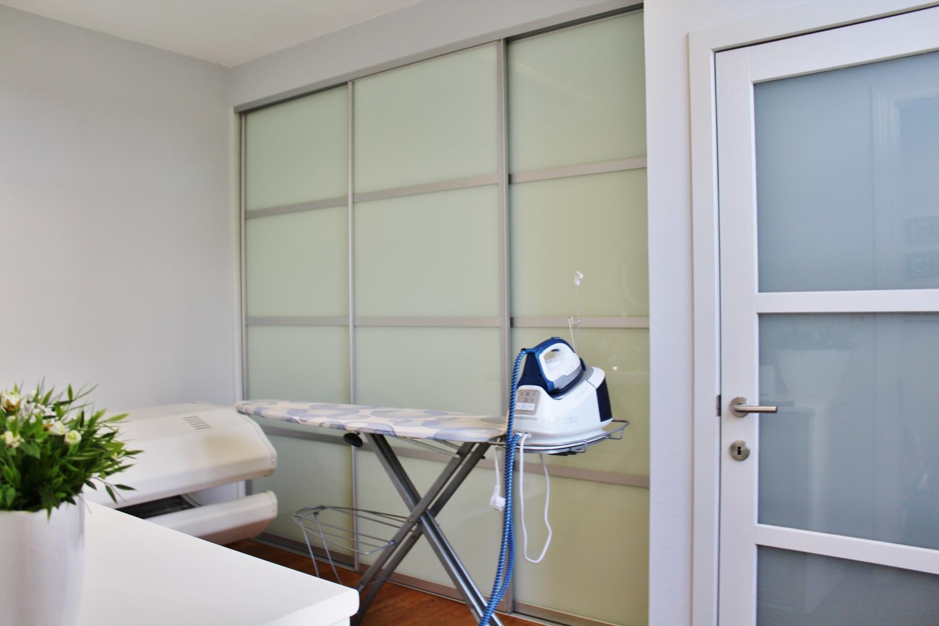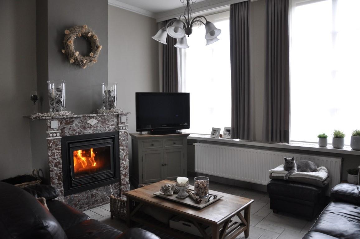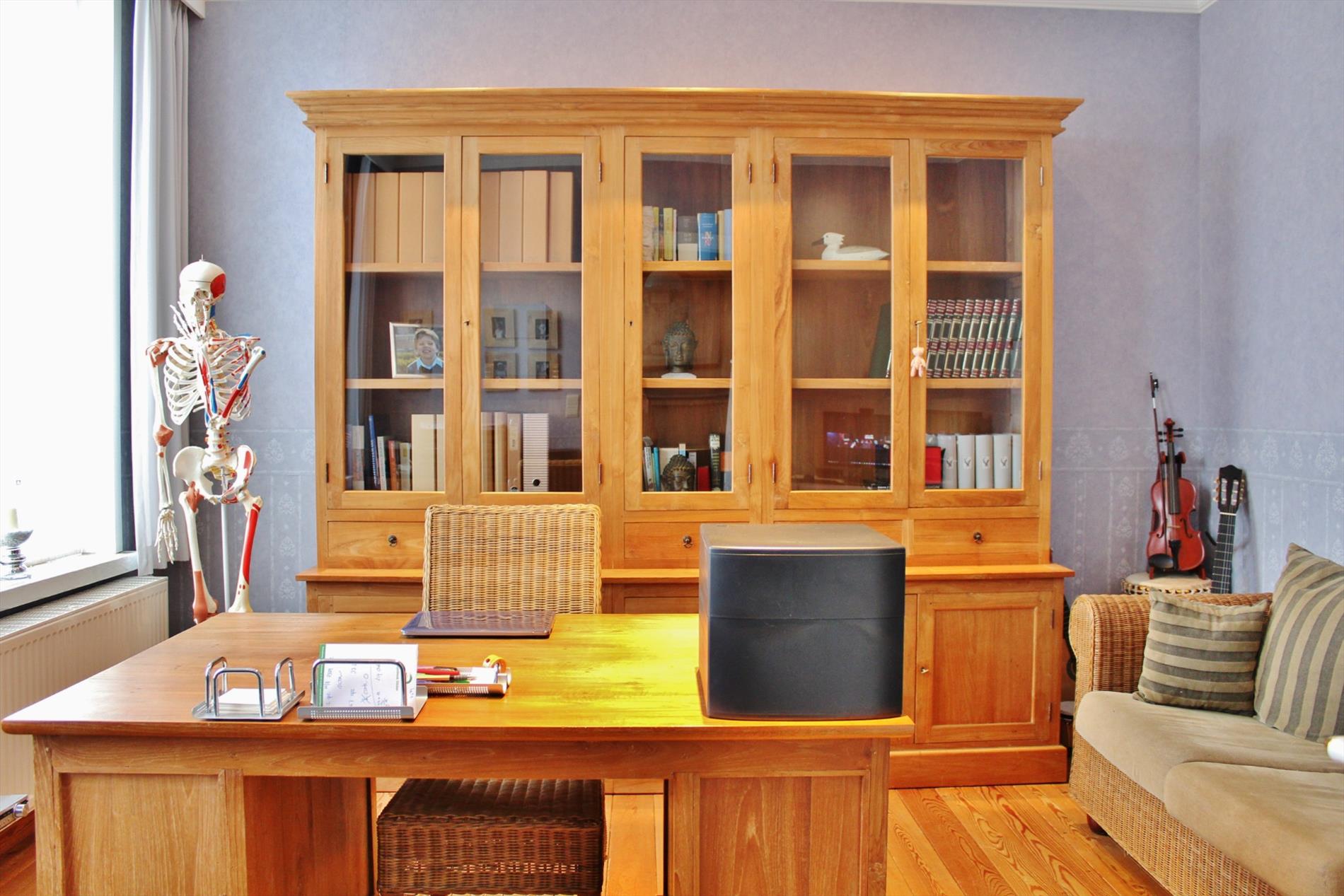 - Op het gelijkvloers: een inkom, ruime leefruimte met inbouwhaard op hout, volledig ingerichte keuken, bijkeuken met lavabo en douche, ruime bureau, strijkkamer met ingebouwde kasten en lavabo, toilet.