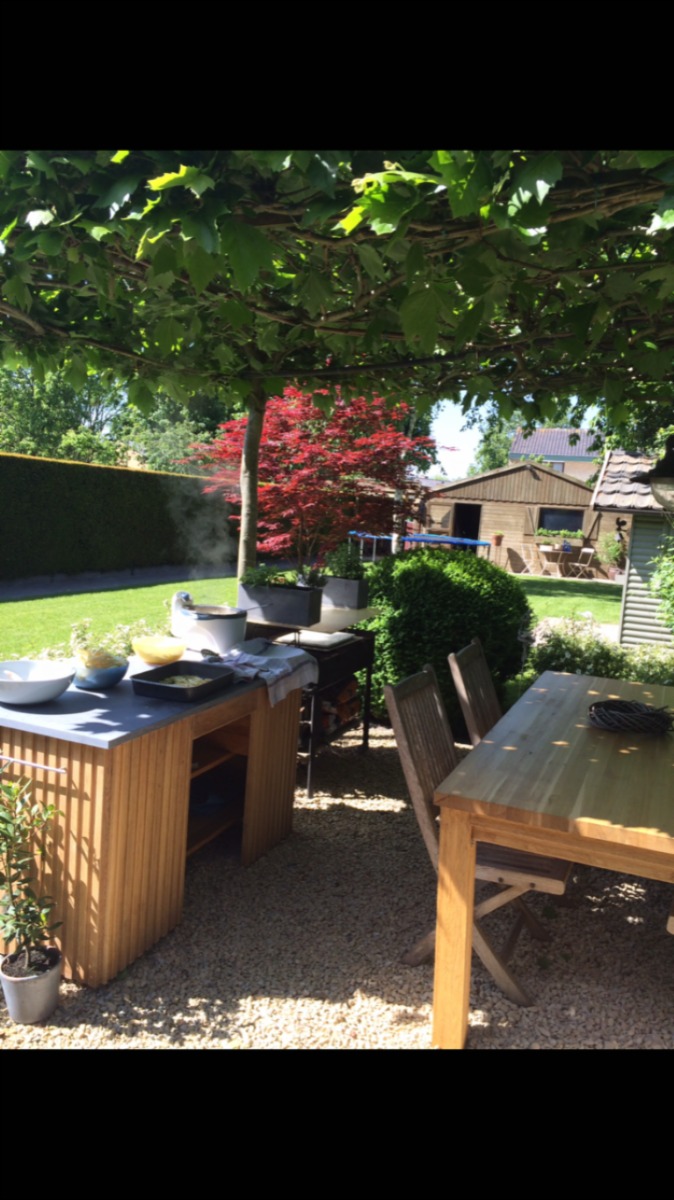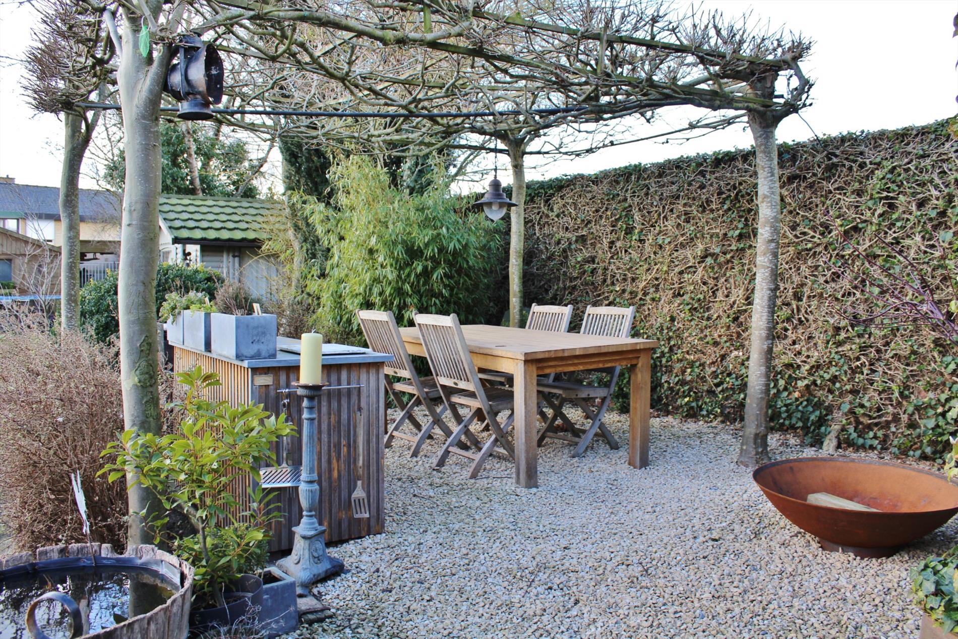 Achteraan de woning vinden we een prachtige zuidgerichte tuin met verschillende terrassen, een pergola met gezellige buitenkeuken en een tuinhuis.