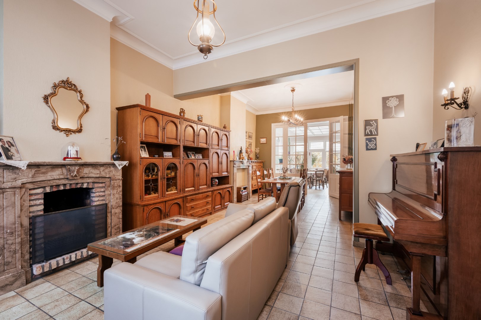 Glv: impressionante inkomhal (10.75m²) - living met open haard (36m²) - leefkeuken met vaatwas, elektrische kookplaat + oven, frigo en dubbele inox spoelbak (26m²) - terras (24m²) - zuidgerichte tuin met achteruitweg en bijgebouw/tuinberging (27m²) met zolder (20m²)