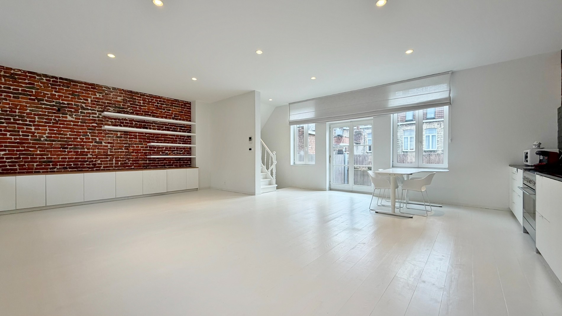 De eerste verdieping verrast met een open leefruimte in loftstijl, waar grote raampartijen en authentieke elementen zorgen voor een prachtige sfeer en overvloedige lichtinval. Vanuit deze leefruimte heeft u toegang tot een ruim, zonnig terras, ideaal om in alle rust te genieten. De stijlvolle, volledig ingerichte keuken sluit naadloos aan bij de leefruimte en biedt bovendien een uniek zicht op de Sint-Maartenskerk.