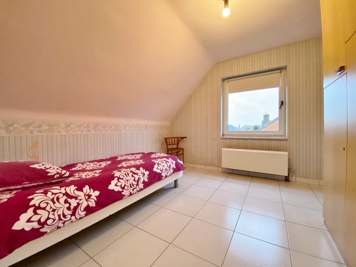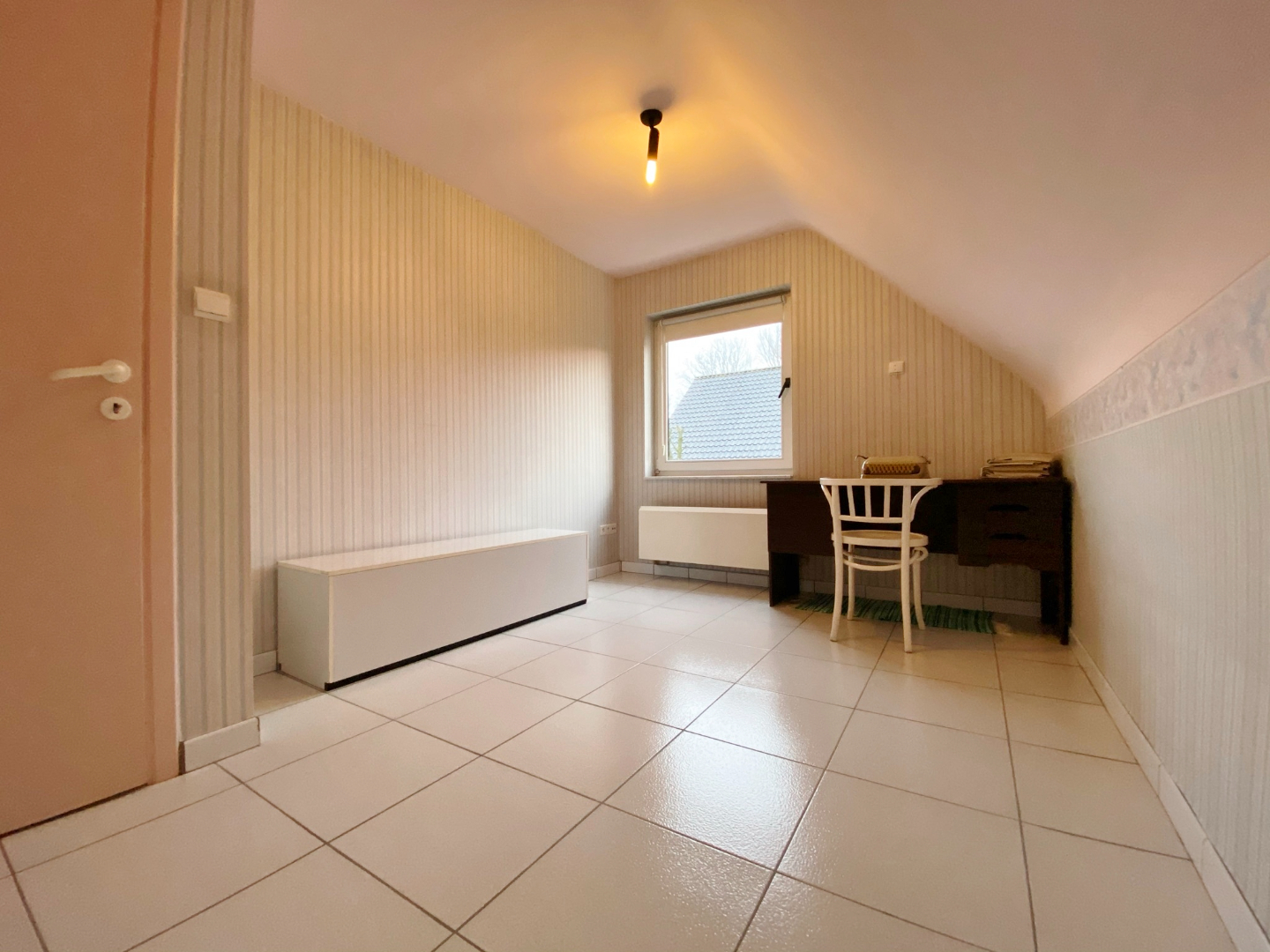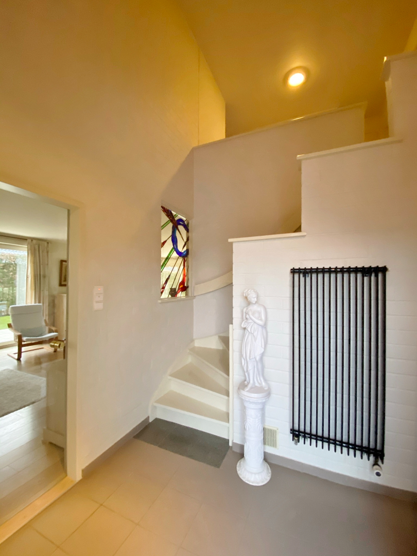 Deze woning is gelegen aan het eind van een doodlopende straat en omvat een gelijkvloerse verdieping met inkom, toilet, ruime lichtrijke leefruimte met eet- en zitplaats, half-open volledig ingerichte keuken met eetplaats, berging met aansluiting voor wasmachine, ruime garage en extra bergruimte onder de trap. Op het eerste verdiep zijn 4 slaapkamers, een toilet en een badkamer met douche, ligbad en lavabomeubel. Er is tevens een zolderverdiep.