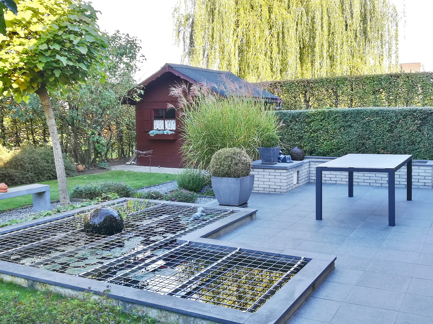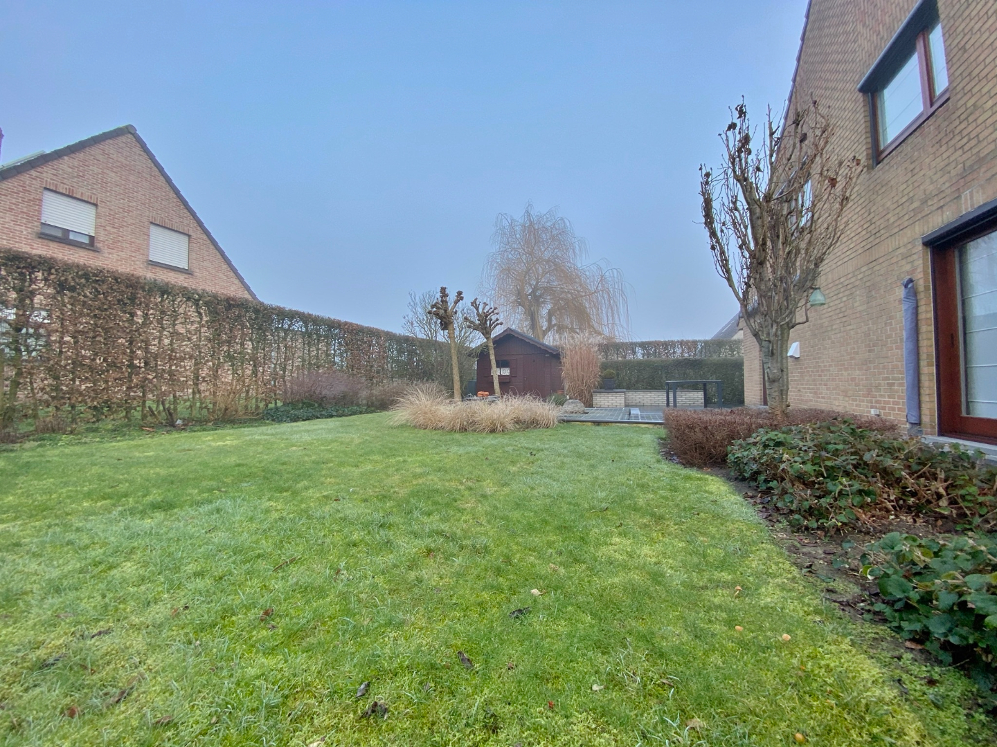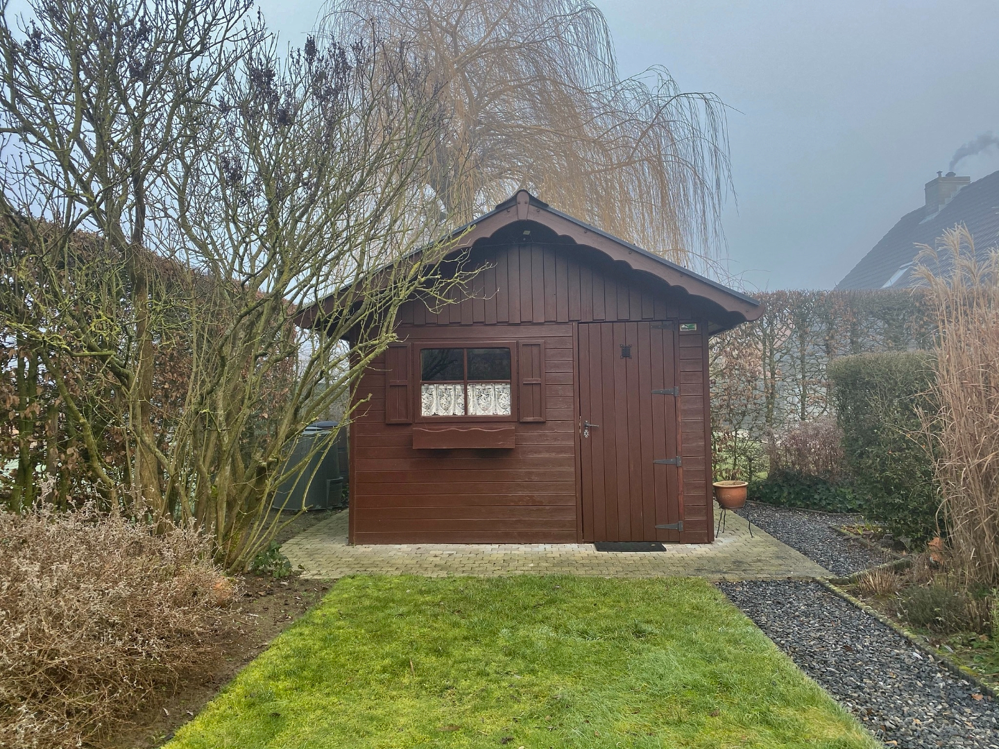 Buiten is een afgesloten zonnige tuin met terras, tuinhuis en vooraan ruime oprit met voortuin.