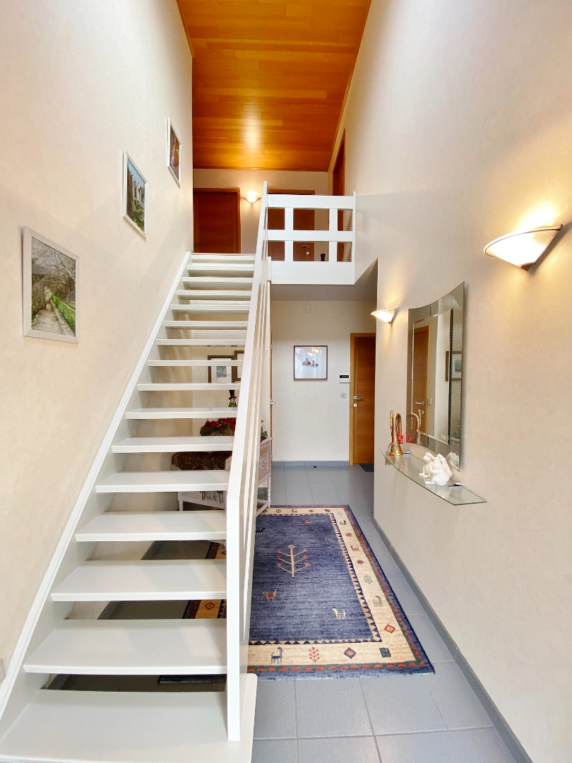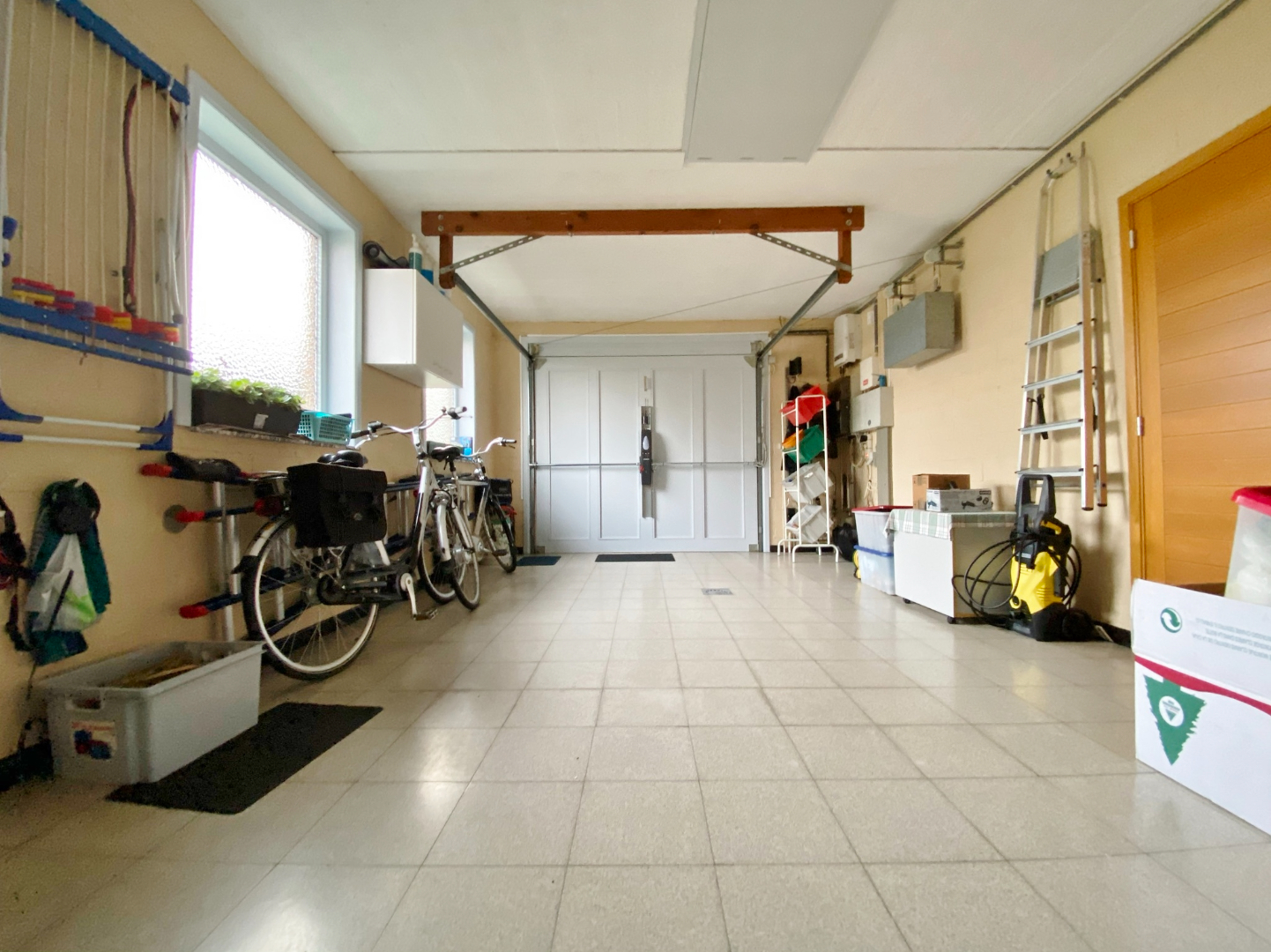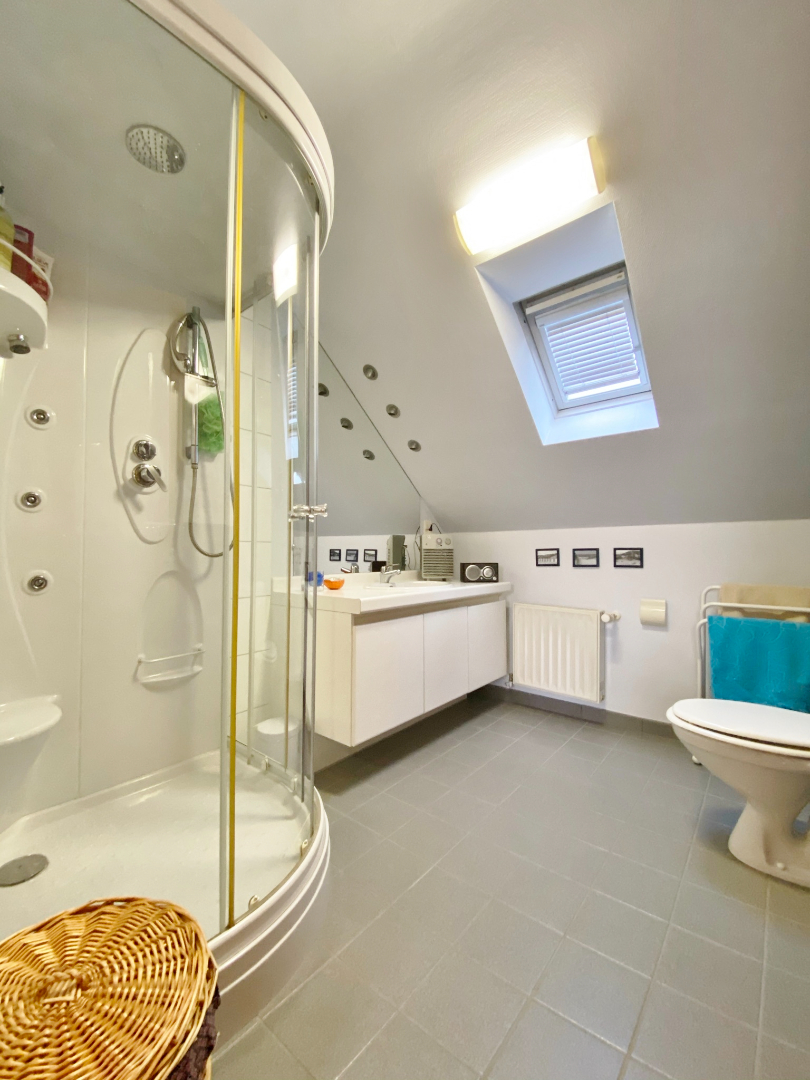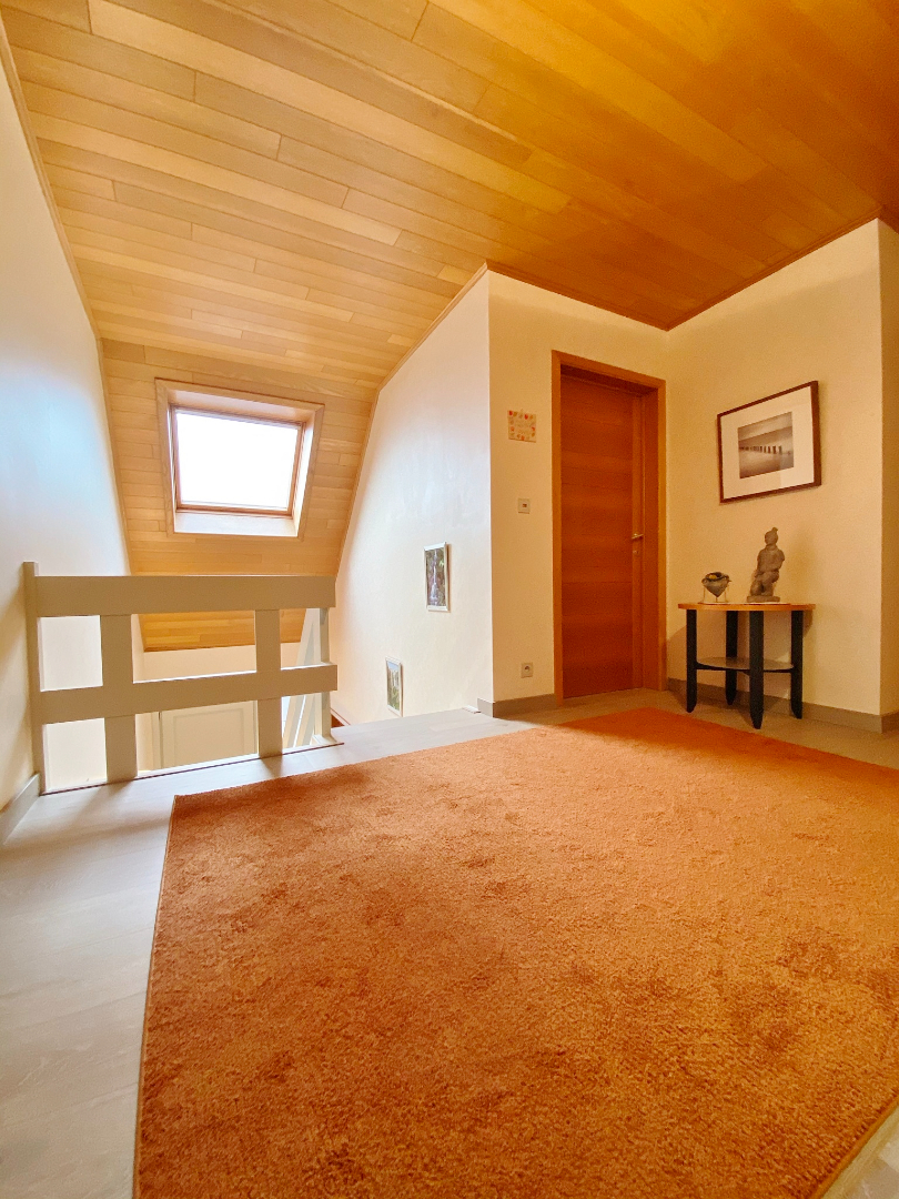 Deze woning is centraal gelegen in een rustige doodlopende straat en omvat een gelijkvloerse verdieping met inkom, toilet, ruime lichtrijke leefruimte met eet- en zitplaats, half-open volledig ingerichte keuken met eetplaats, berging met aansluiting voor wasmachine, ruime slaapkamer/ bureauruimte/ hobbyruimte, moderne badkamer met dubbel lavabomeubel en ligbad, en een ruime garage met elektrische poort. Op het eerste verdiep zijn 3 slaapkamers, een bergruimte, en een badkamer met douche, lavabomeubel en toilet.
