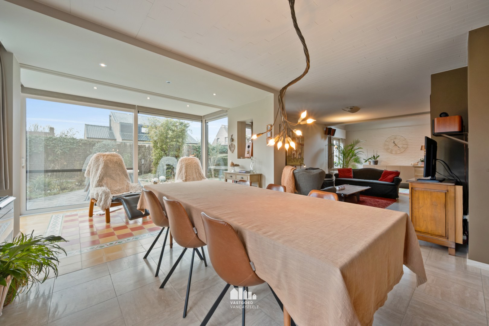 Via de inkomhal met gastentoilet kom je in de ruime en gezellige leefruimte met zithoek voorzien van een gashaard. De leefruimte omvat tevens een lichtrijke eethoek met aansluitend een glazen uitbouw, uitgerust met automatische screens en automatische gordijnen, waar je kan genieten van een mooi zicht op de tuin.