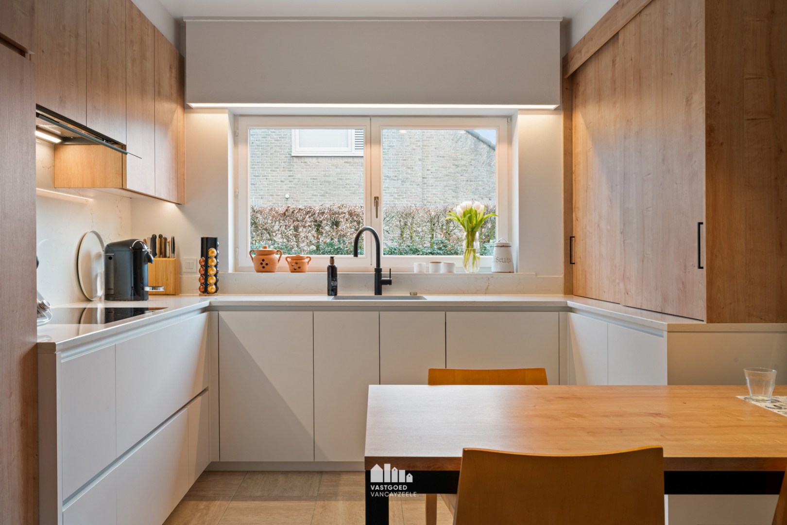 De volledig vernieuwde keuken (2 jaar oud) is modern en praktisch ingericht en afgewerkt met kwalitatieve materialen en toestellen.