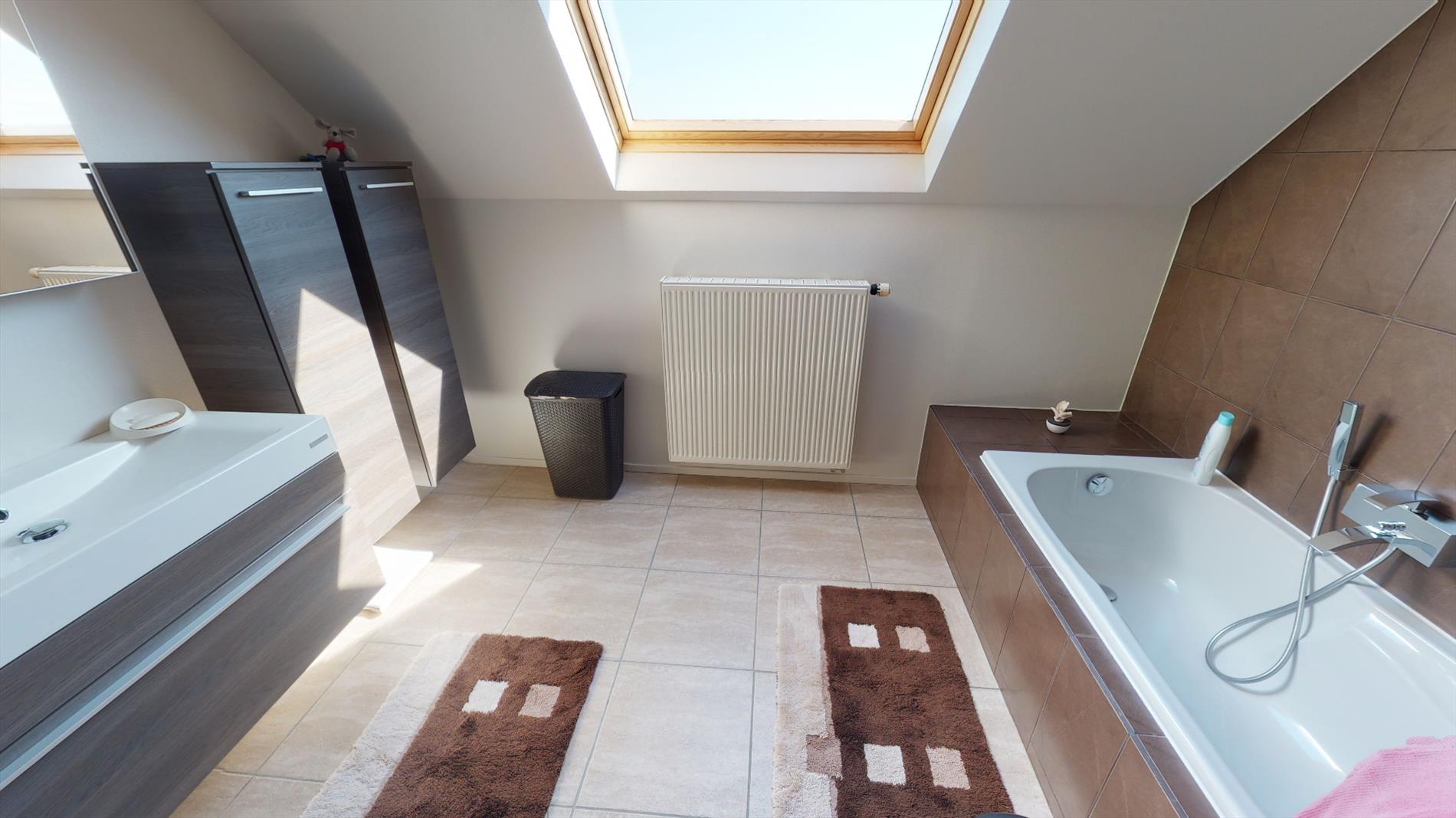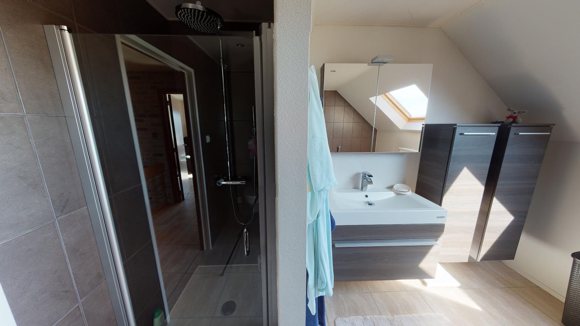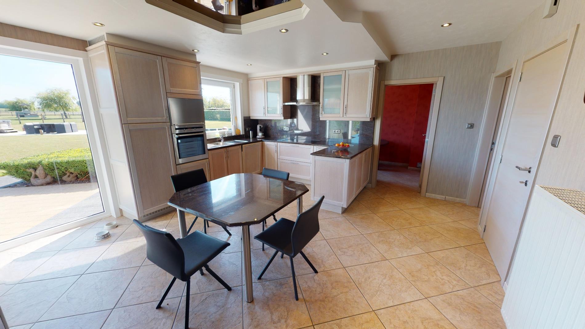 De woning omvat een gelijkvloerse verdieping met een lichtrijke inkom met gastentoilet, gezellig salon met inbouwcassette op hout en eetplaats met zicht op de prachtige tuin en achterliggende weiden, ruime volledig ingerichte keuken voorzien van alle apparaten, berging, bureau en een grote garage met sectionale poort. Op het eerste verdiep bevindt zich een grote master bedroom (22m²) met aanpalend een luxueus ingerichte dressing, twee ruime gastenkamers en een prachtige badkamer met douche, bad en lavabomeubel. De ruime zolder biedt nog veel uitbreidingsmogelijkheden.