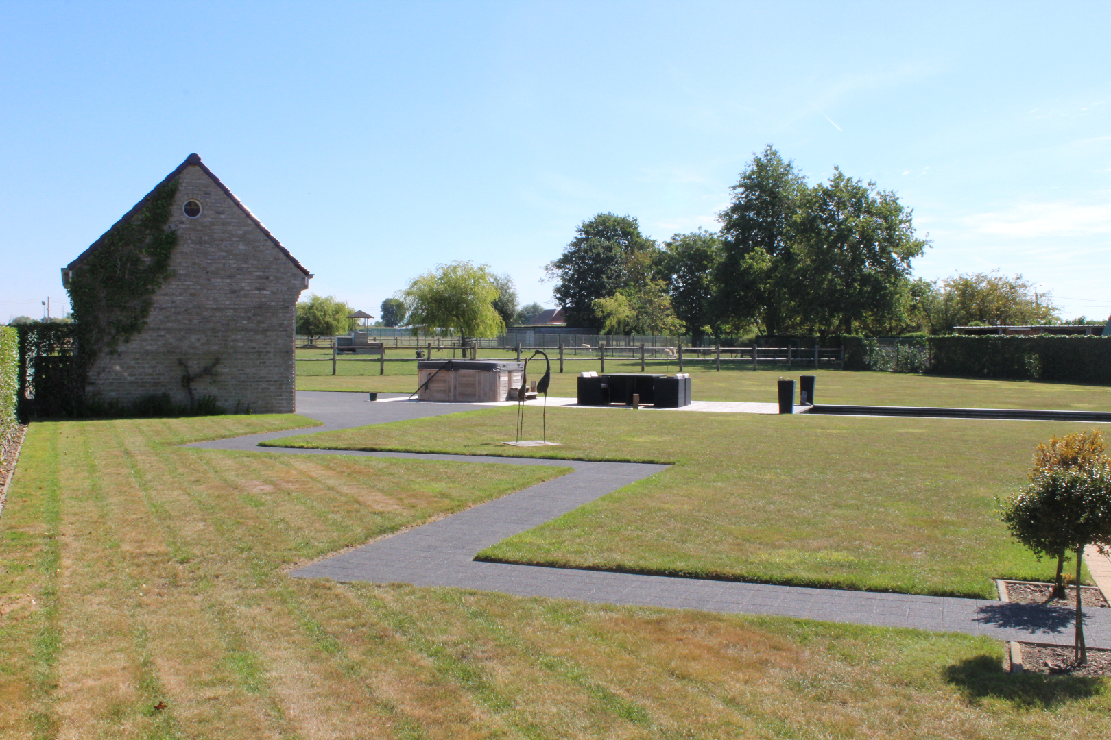 Buiten vinden we vooraan een grote oprit met ruime parkeergelegenheid. Achteraan zijn meerdere grote, zonnige terrassen en mooie graspartijen omringd door goed onderhouden wandelpaden. Er is ook plaats voor ontspanning met o.a. een jacuzzi (5 plaatsen waarvan 2 ligplaatsen) en een zwemvijver (45m²). Het bijgebouw (32m²) omvat alle voorzieningen voor een buitenkeuken, alsook een toilet, inloopdouche, garage, zolder en opslagplaats.
